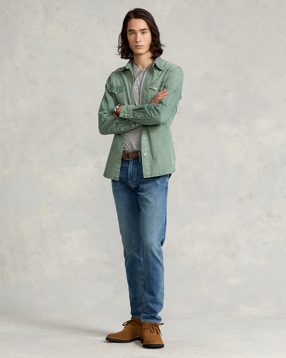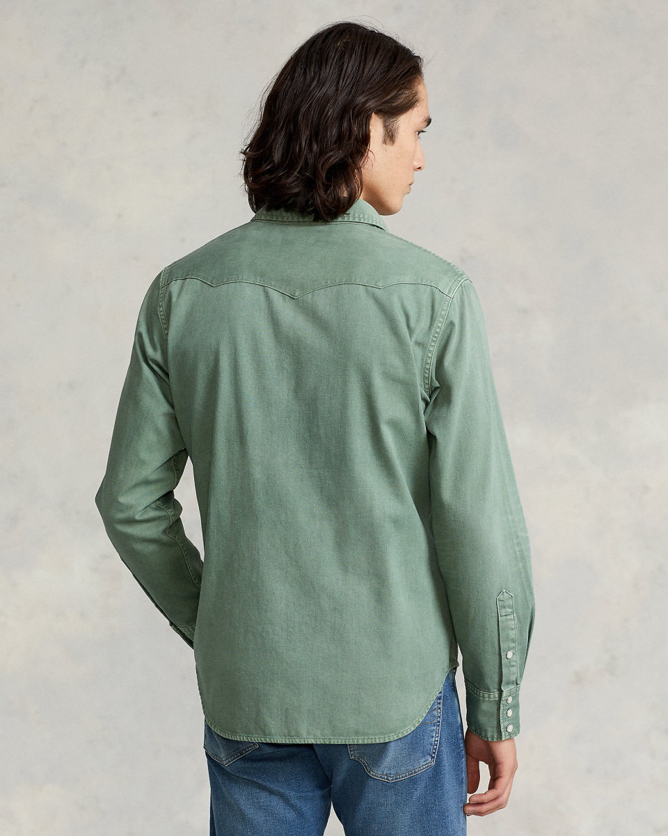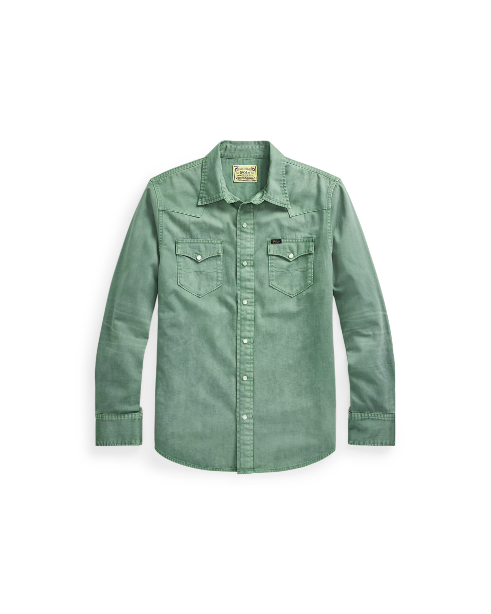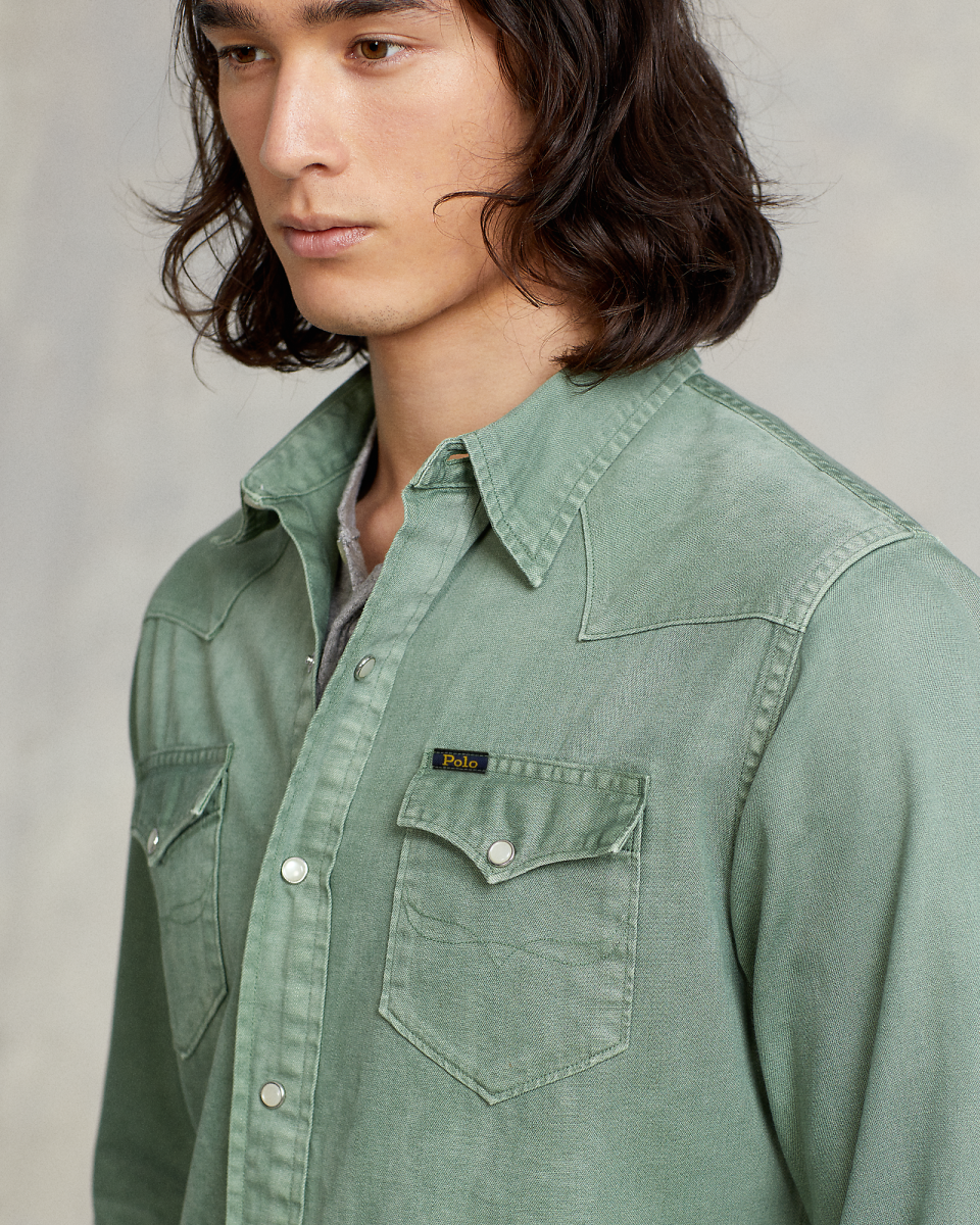 这款标志性西部风格衬衫选用棉质牛仔布制成,经成衣染色处理,搭配手工细节,呈现手工风格