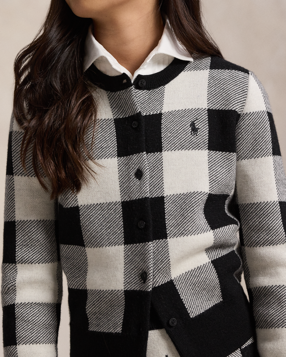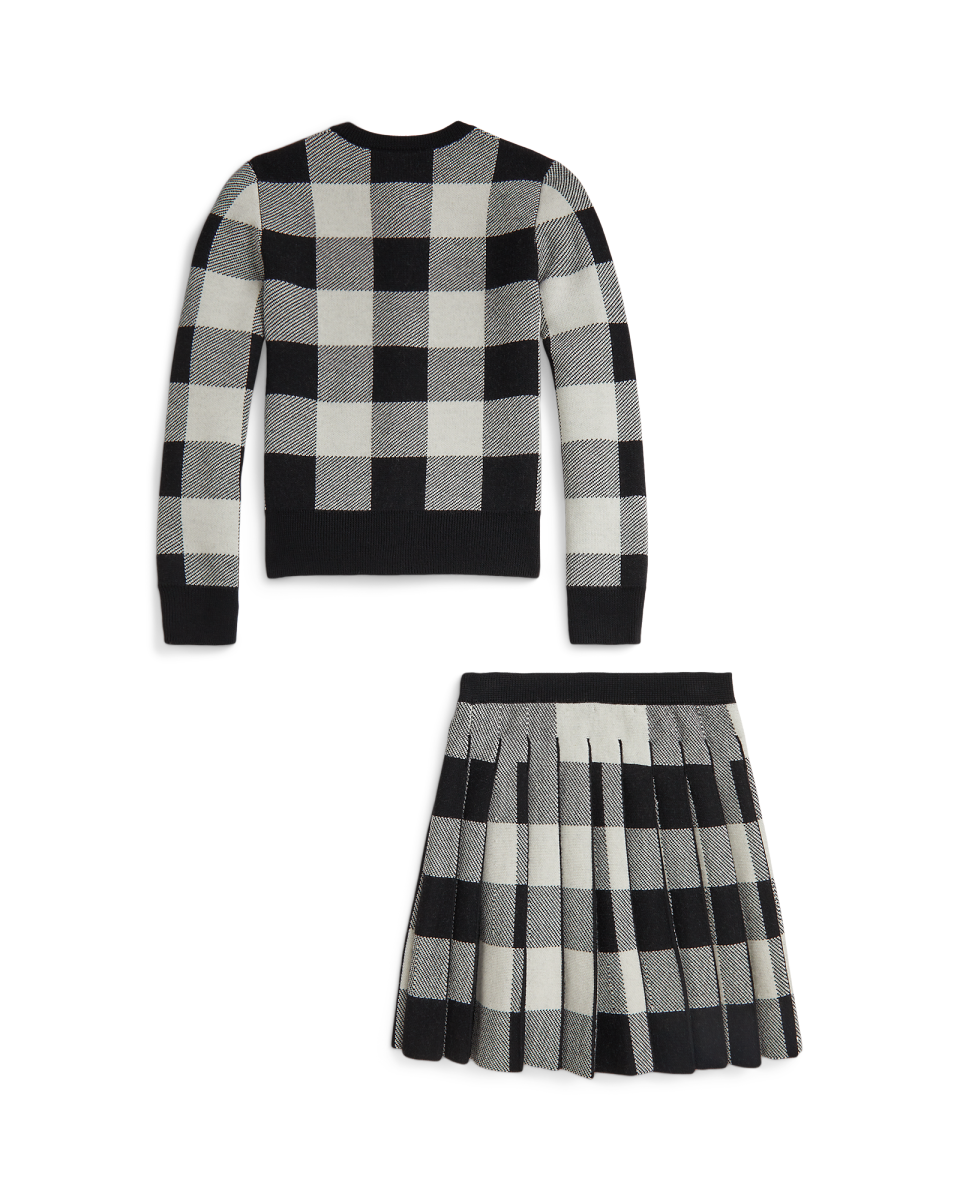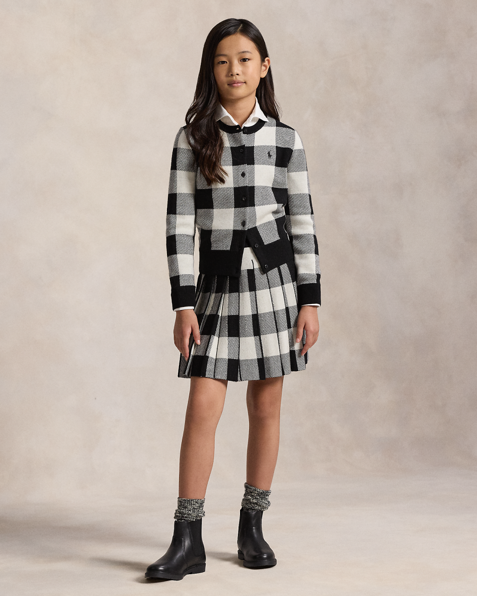 这款可爱的套装选用轻盈的羊毛面料制成,饰有野牛格纹图案,开襟衫配有混搭纽扣,下裙饰有褶裥,是天气转凉时的理想之选