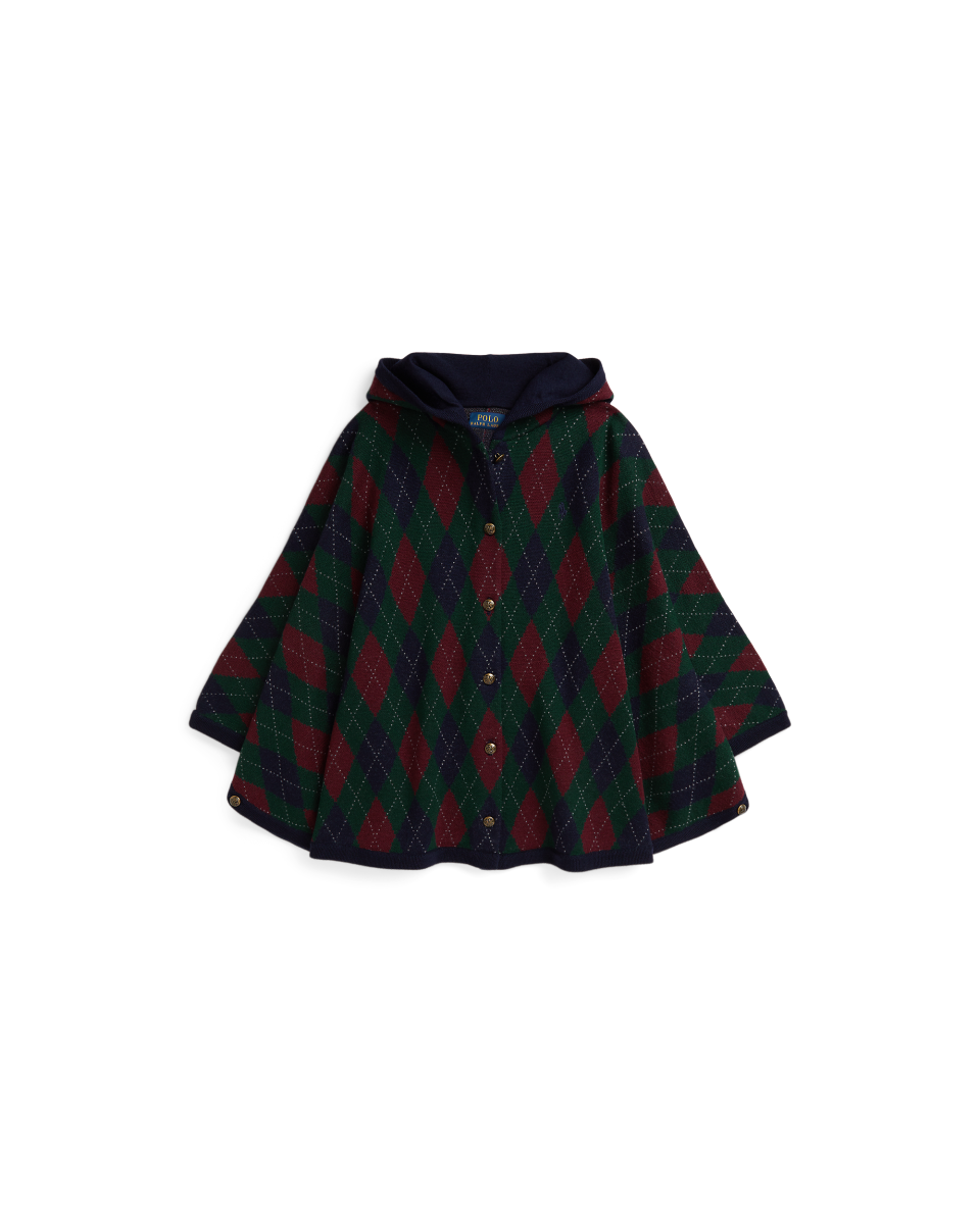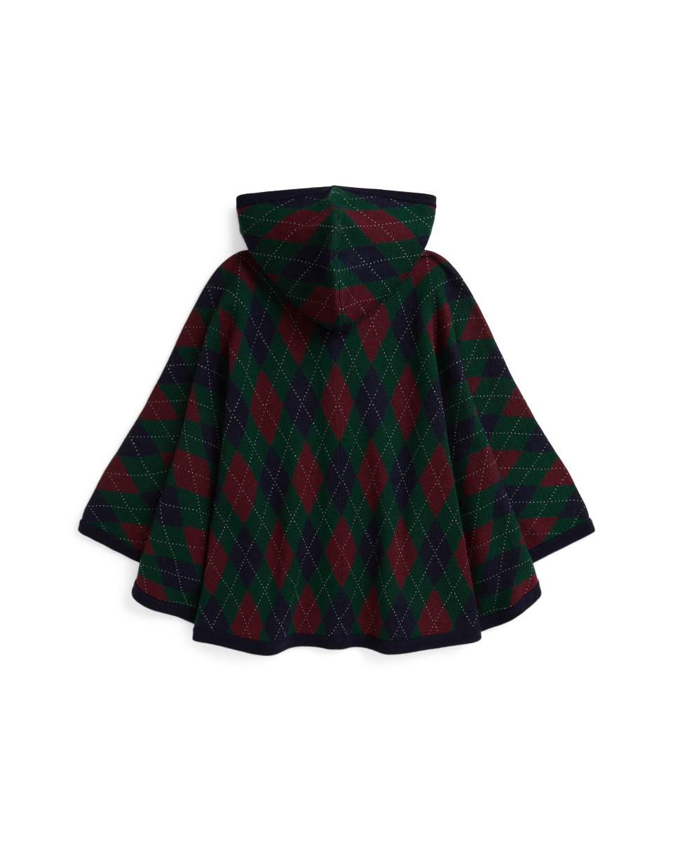 这款连帽羊毛斗篷饰有菱形花纹,搭配皇冠图案纽扣,彰显本季学院风理念