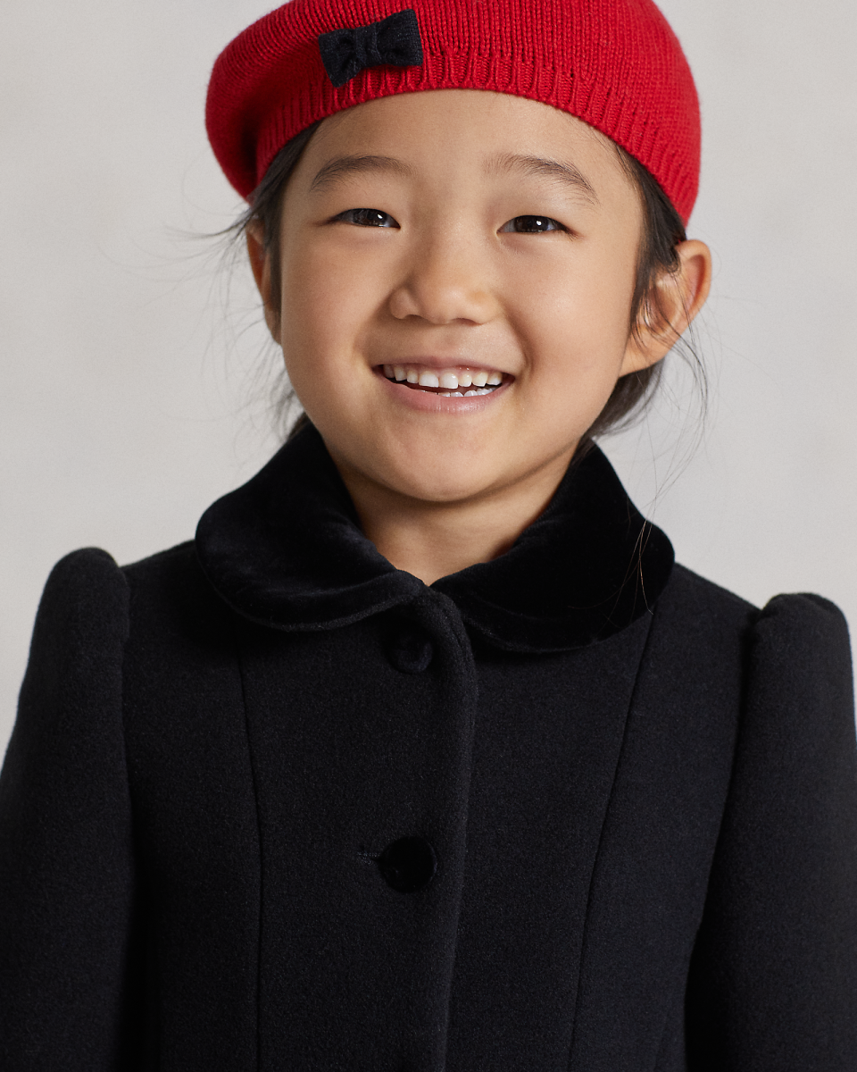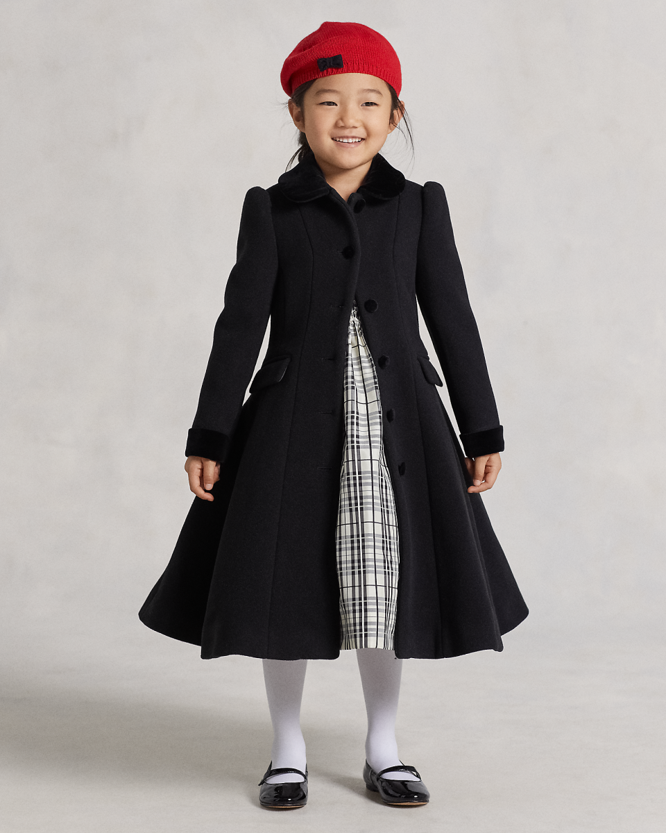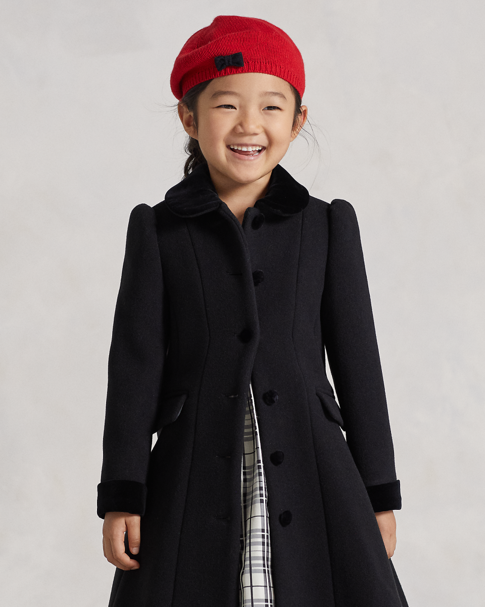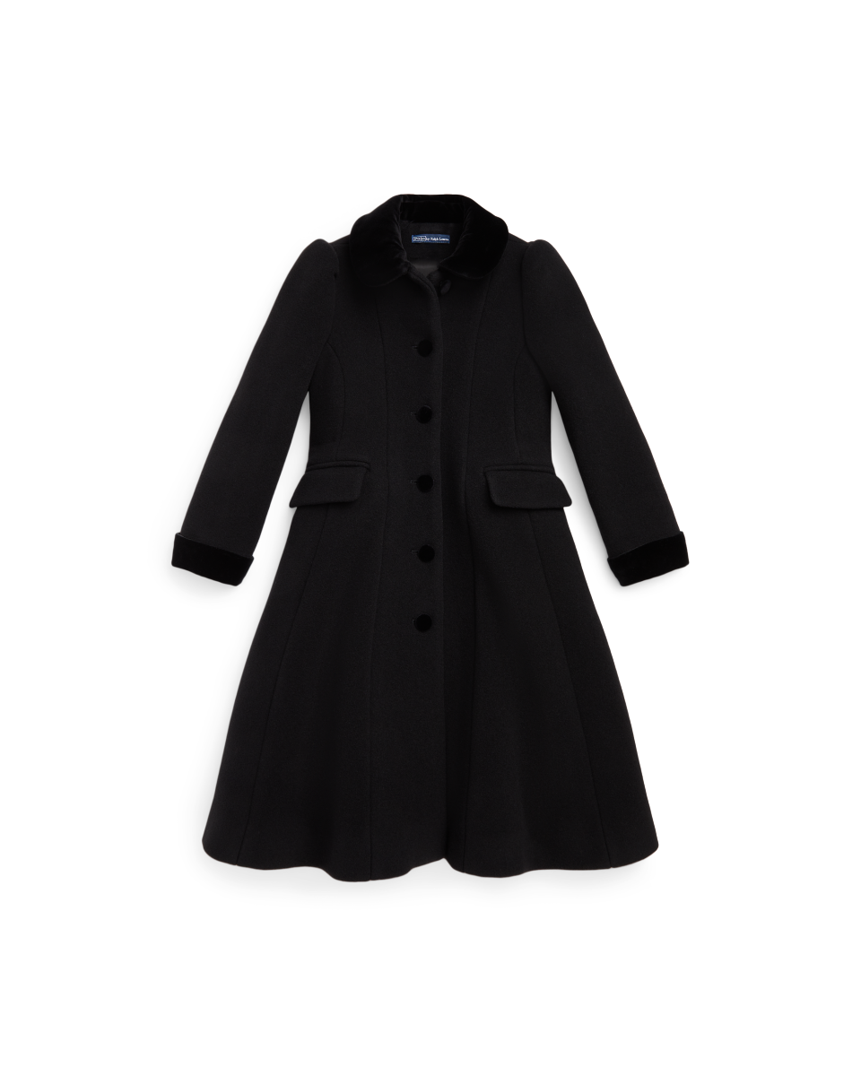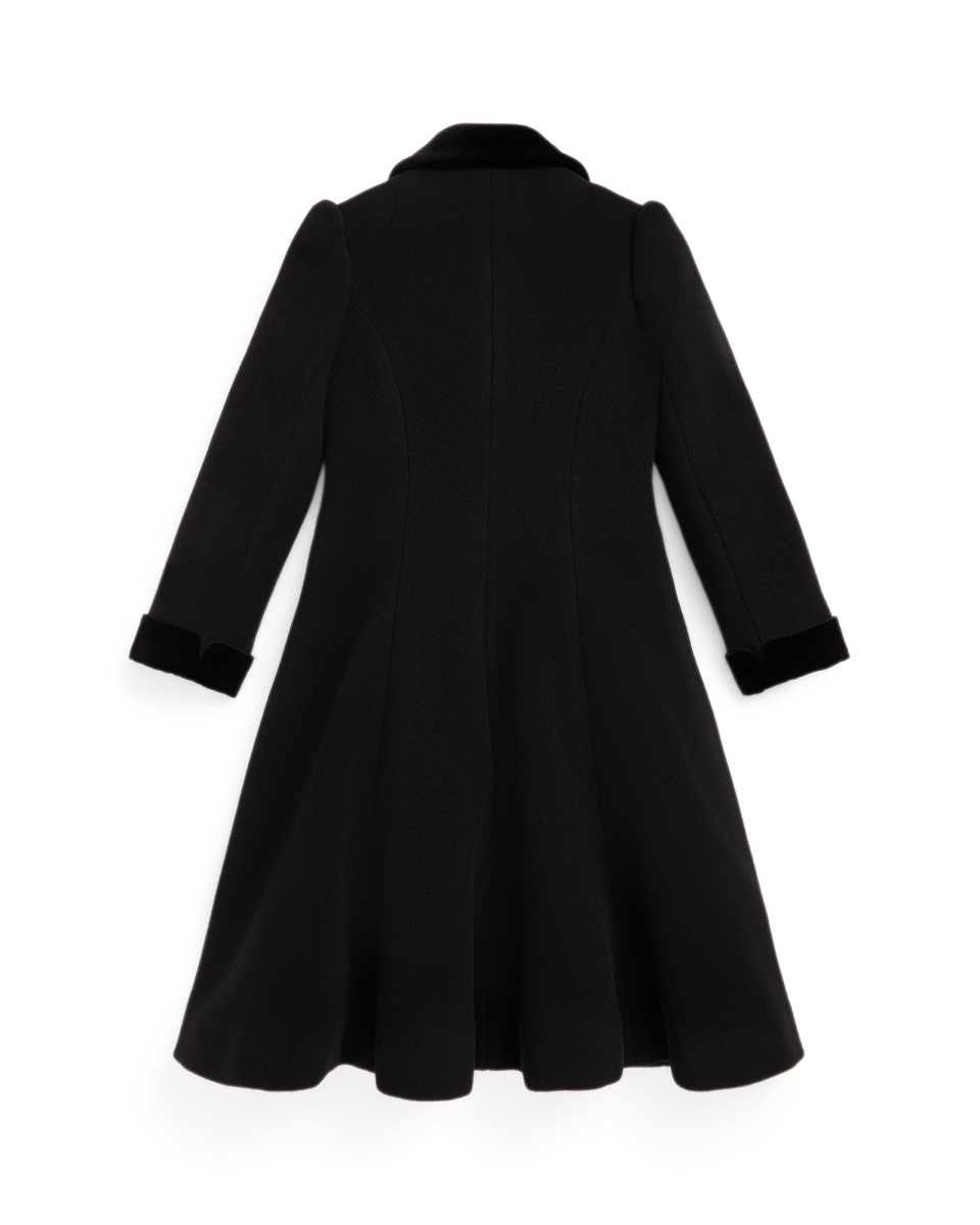 这款优雅的大衣选用保暖的双面羊毛面料制成,带天鹅绒饰边,适合天气转冷时穿着