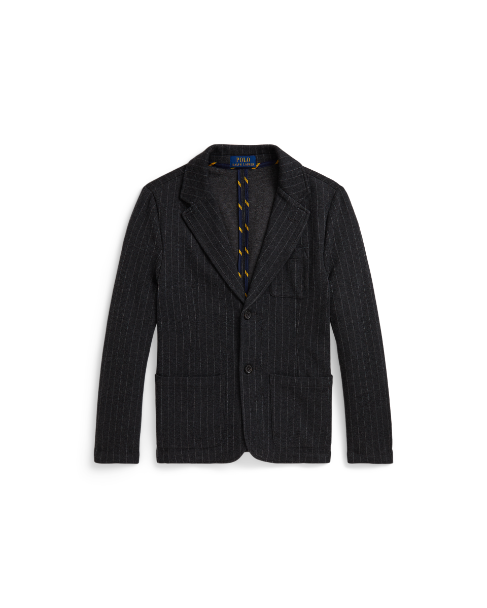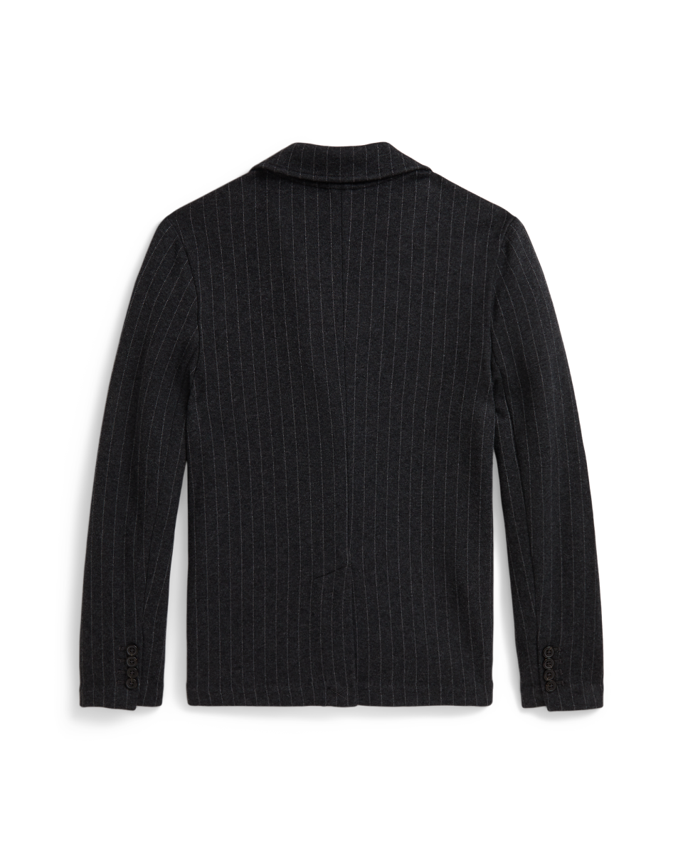 这款条纹西装外套选用针织面料制成,兼具经典外观与针织开襟衫的舒适质感