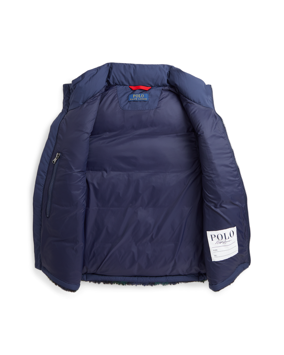 这款马甲选用格纹面料制成,填充蓬松度为 650 的羽绒,饰有标志性小马刺绣,彰显经典风格