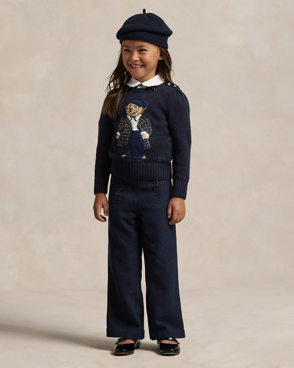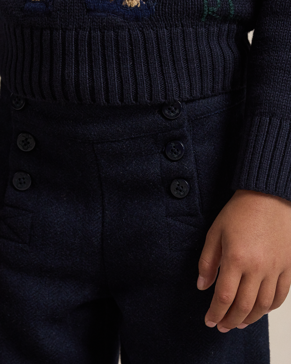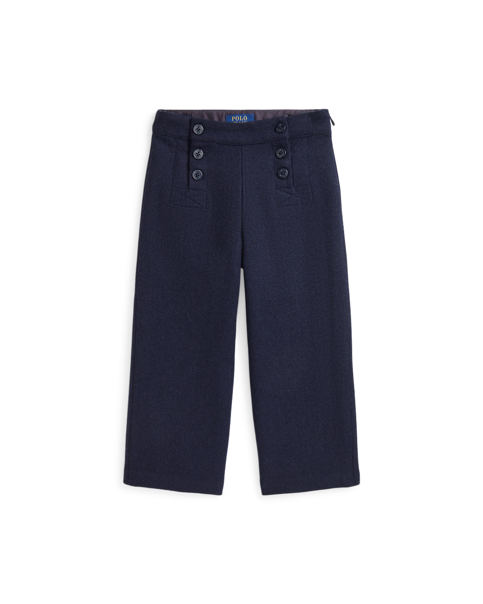 这款长裤采用阔腿廓形,搭配船锚图案压花纽扣,为整体外观增添航海风格元素