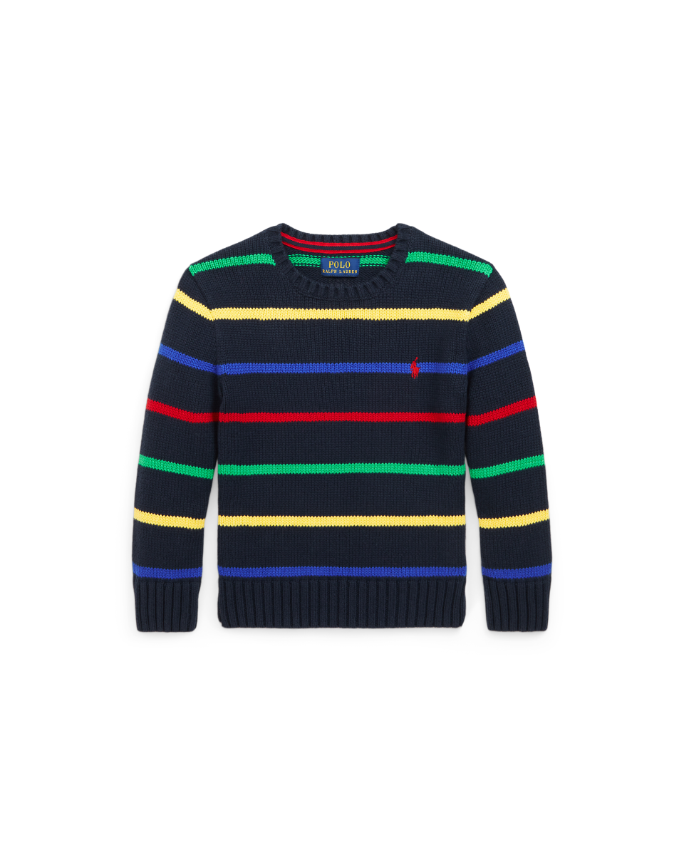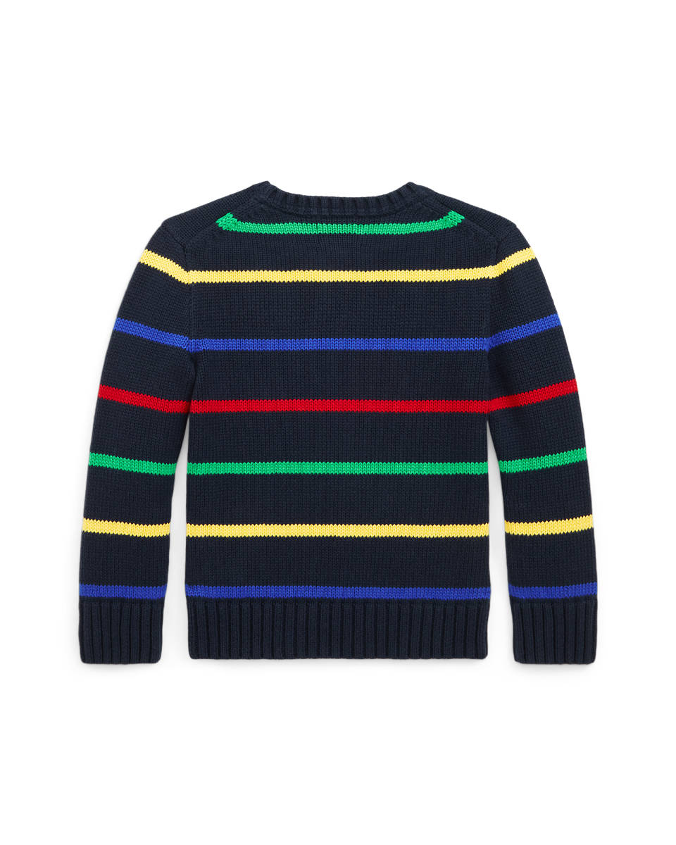 这款厚实的针织衫选用棉质纱线织就,经水洗处理,柔软度佳,饰有彩色条纹和标志性小马刺绣,呈现经典 Polo 外观