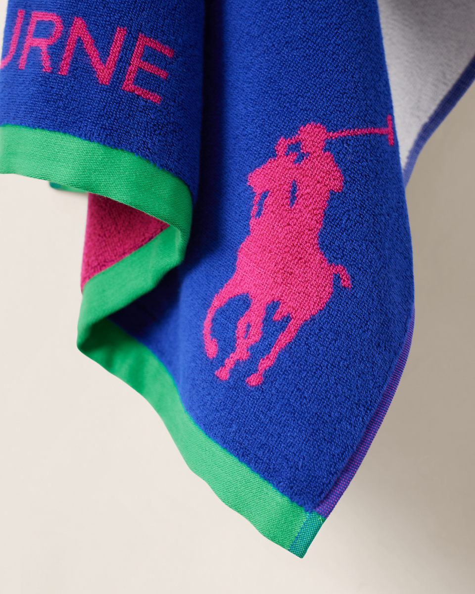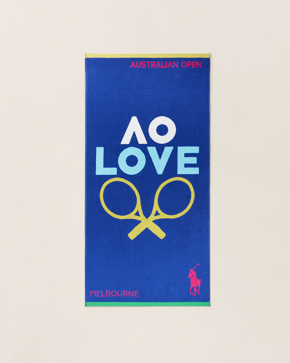 这款棉质提花布儿童毛巾属于我们的 2026 年澳大利亚网球公开赛纪念胶囊系列,饰有生动的网球风格图案,其中包含澳大利亚网球公开赛官方徽标、一副交叉的网球拍以及正面中间的 Love 印花字样