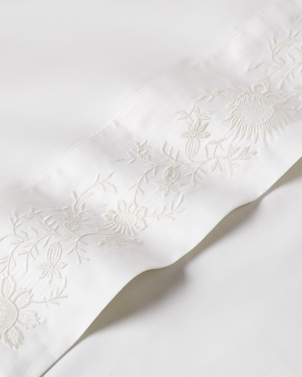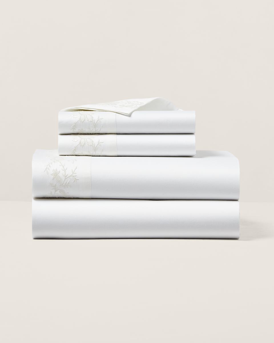 这款 Ralph Lauren Eloise 床单选用长纤维棉制成,该面料经纬密度为 624 根纱/平方英寸(120 根双股纱),富有光泽,床单饰有优雅的花藤图案刺绣,采用经典中性色调,饰有棉缎织纹,手感顺滑柔软,散发细微光泽