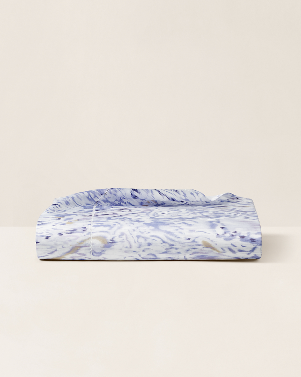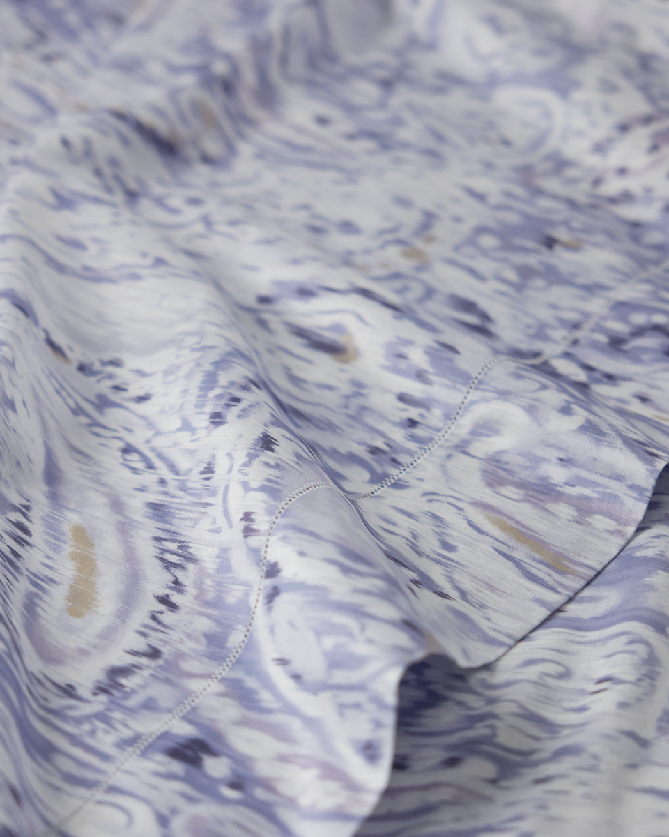 这款床单选用 600TC 棉缎面料制成,呈现丝滑的手感和流畅的垂坠感,饰有呈现天空与海洋色调的水彩风格图案,是经典佩斯利印花图案的焕新演绎