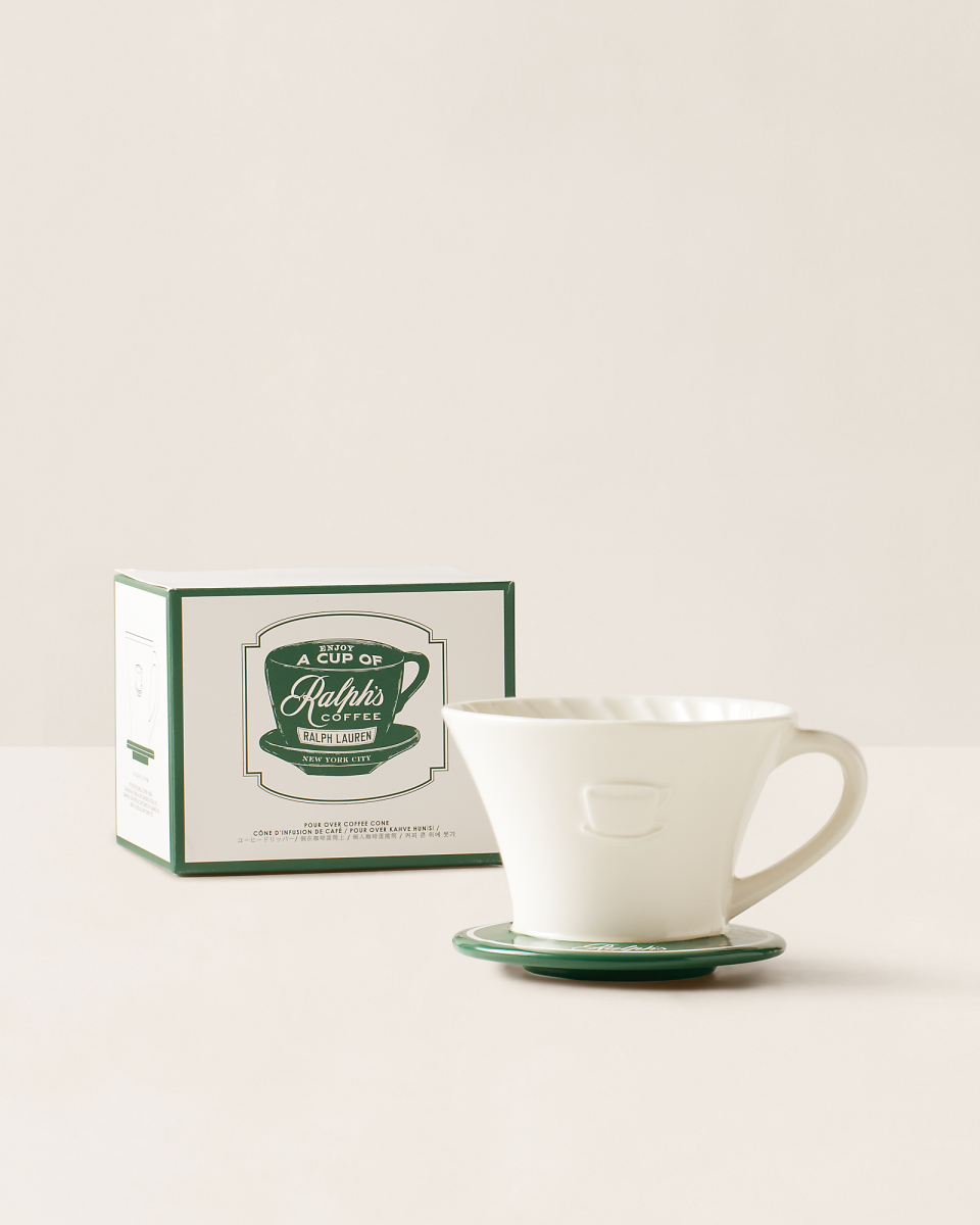 这款雅致的陶瓷手冲咖啡滤杯饰有 Ralph's Ralph Lauren 字样,让您在家就能冲煮新鲜的醇香咖啡