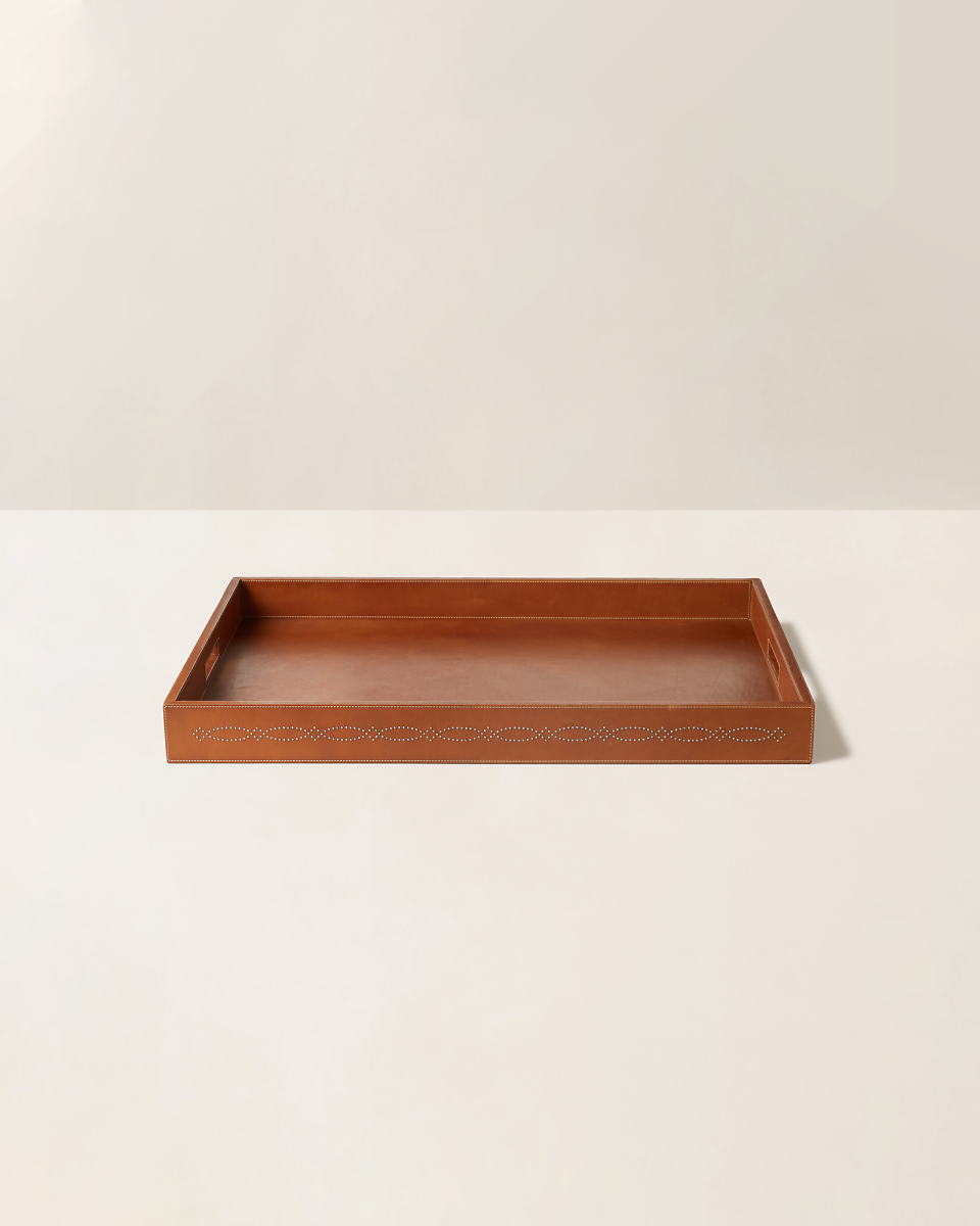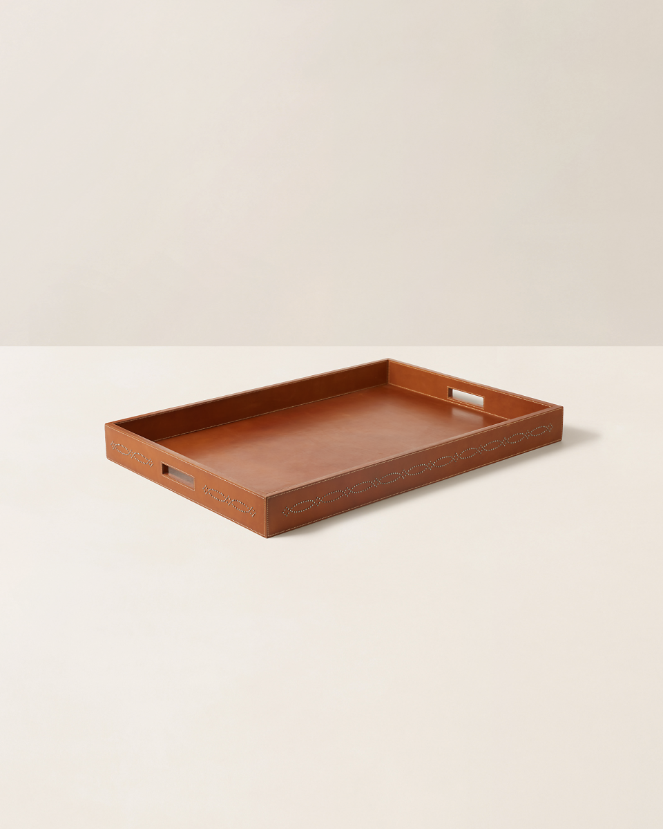 这款 Bromley 托盘灵感源自一款经过岁月沉淀的古董手镯,选用柔软的牛皮革和织物制成,空间充足,便于存放和展示物品,宽敞廓形,饰有银色铆钉与撞色缝饰