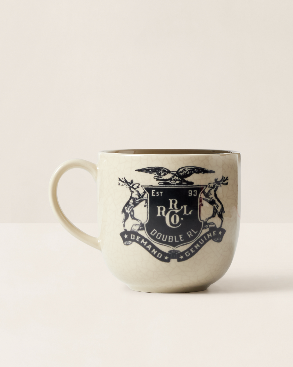 这款马克杯为奶油色炻器,经裂纹处理,呈现复古风格,正面饰有融入老鹰和小鹿图案的盾形徽标图案,装在标志性包装盒中