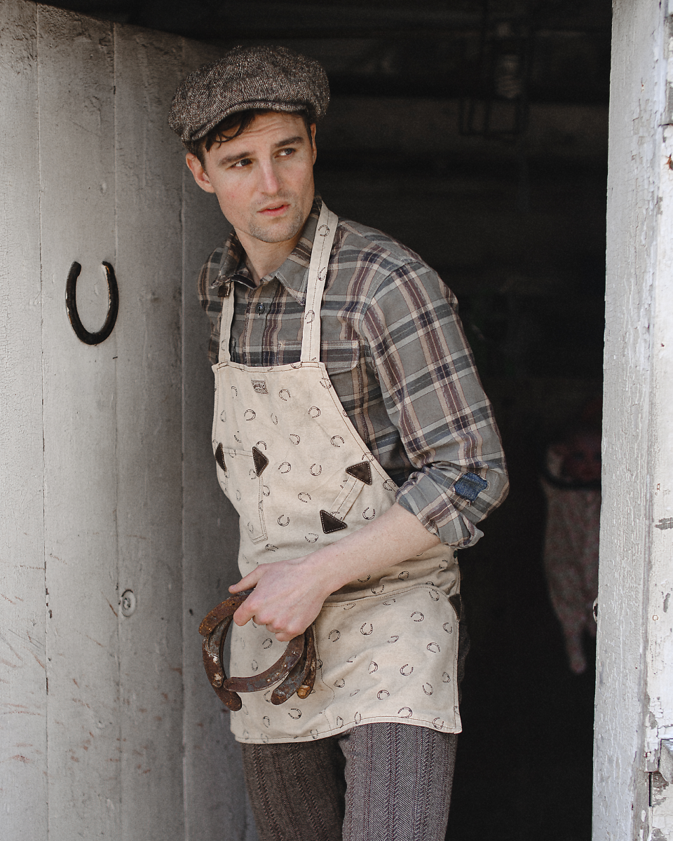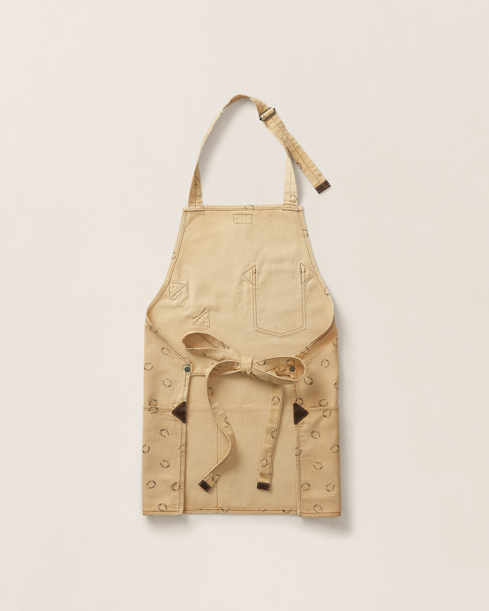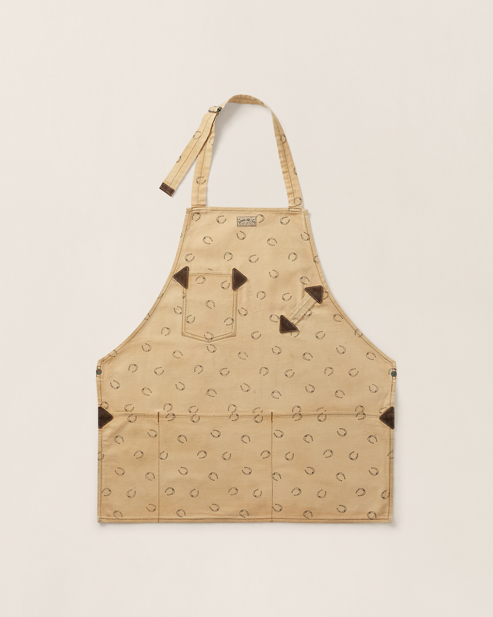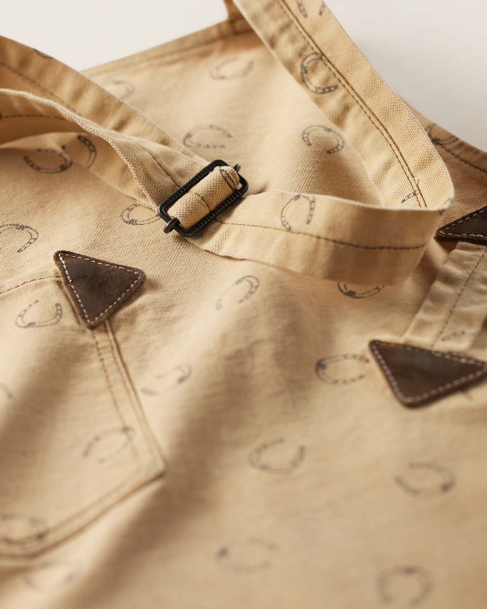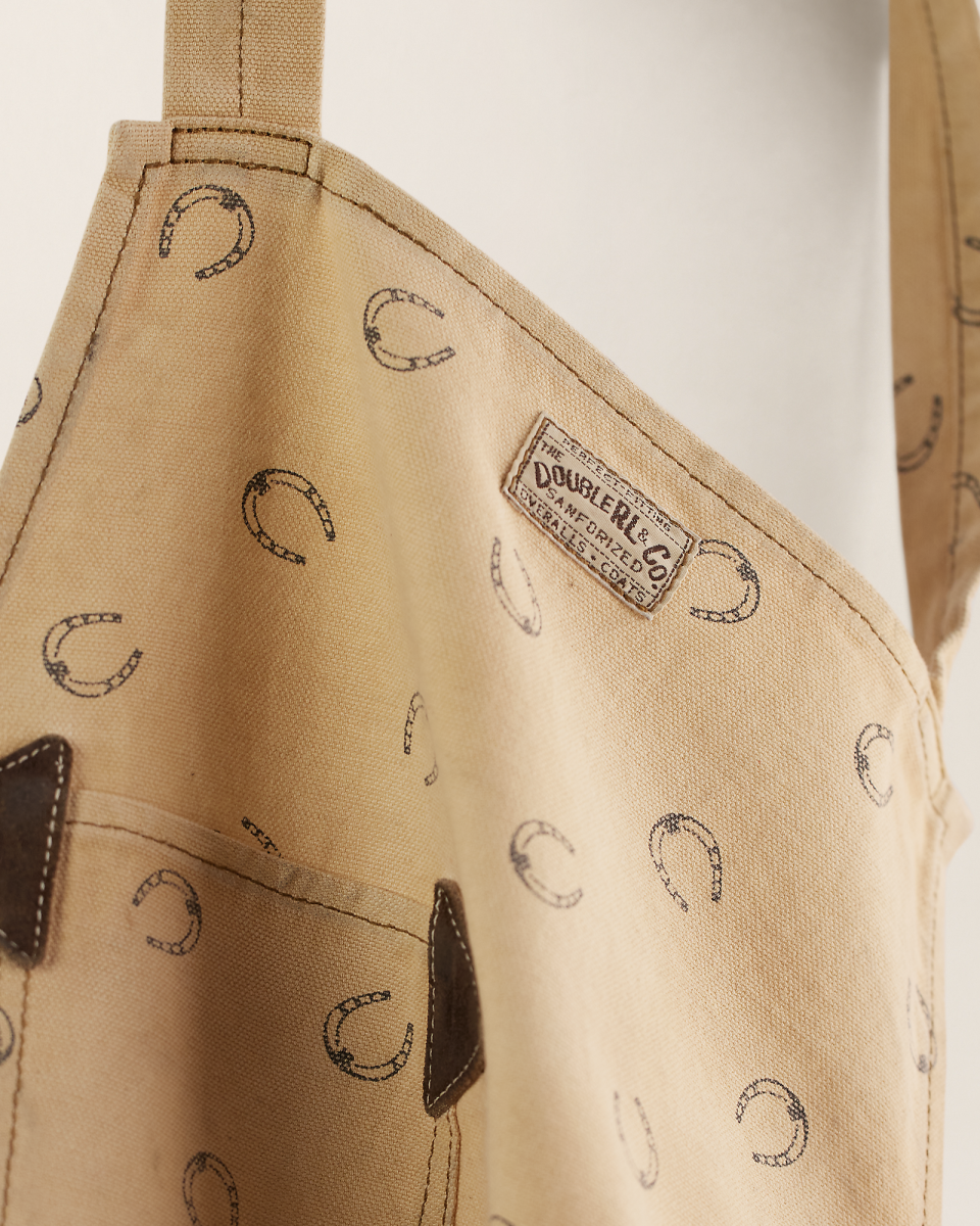 这款围裙选用棉质帆布制成,饰有丝网印刷的马蹄铁图案,呈现褪色效果,经打磨处理,围兜饰有 Double RL & Co. 字样梭织标签,可调节搭扣颈部系带,背面腰部饰有同种面料系结,工具口袋,黄铜色铆钉,经水洗与着色处理