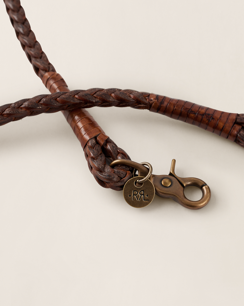 这款狗绳选用抛光牛皮革制成,呈现复古外观,编织绳带两端饰有缠绕式包边,扣件和五金件呈现未上漆的做旧效果,饰有 RRL 字样吊饰