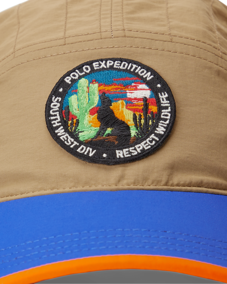 这款色块五片拼接帽选用舒适的面料制成,饰有 Ralph Lauren 标志性的荒野主题补片,配有网眼布侧袋
