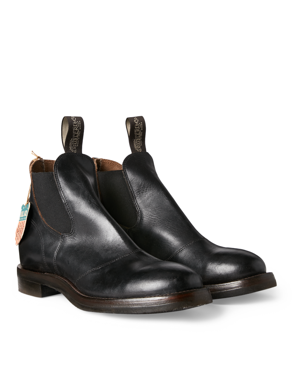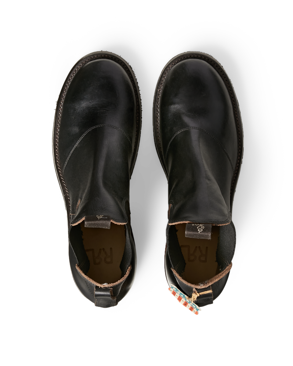 这款切尔西靴于德克萨斯州手工制成,所用的手工抛光全粒面皮革产自芝加哥一家制革厂,侧面有弹性三角布,全固特异沿条结构,定制徽标拉片