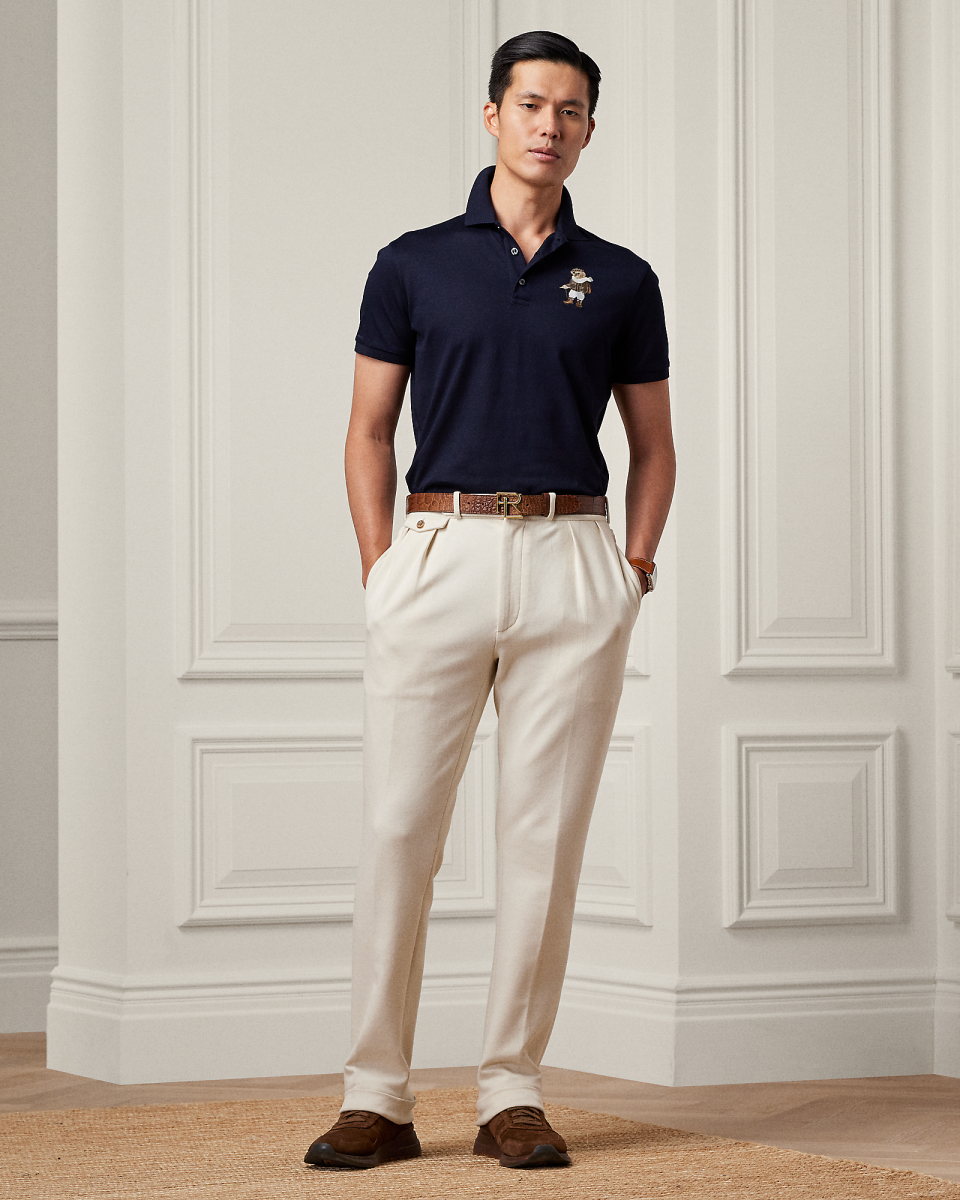 这款 Purple Label Polo 衫于意大利制成,休闲而不失雅致,所用的轻薄珠地布以棉质纱线织就,并经双重丝光处理,强度和保色性更佳,这款 Polo 衫饰有标志性 Polo 小熊,小熊身穿本季的 Deshler 飞行员夹克,搭配流苏围巾,准备穿越霞慕尼勃朗峰