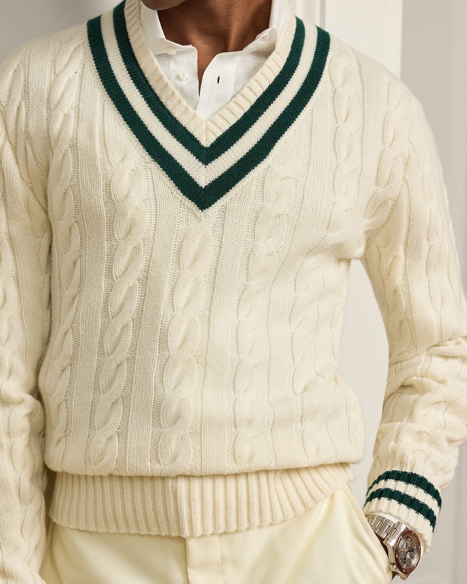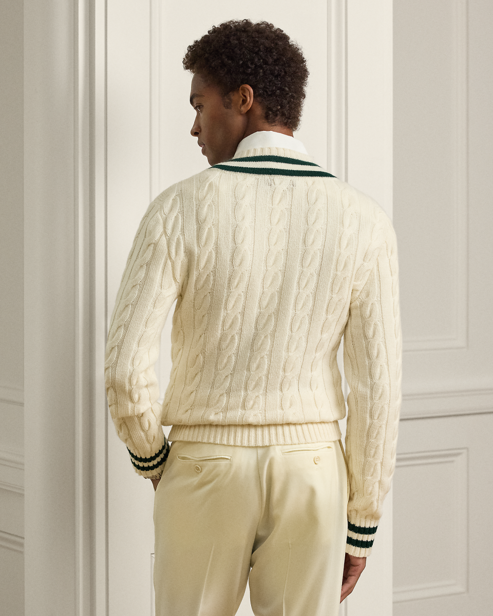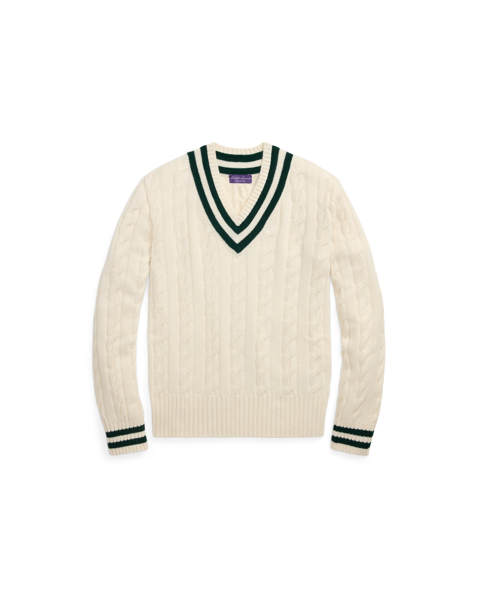 板球针织衫的特点是绞花编结图案(通常为奶油色)以及 V 领和条纹饰边,Ralph Lauren 于 1972 年推出他的原版板球针织衫,这款 Purple Label 系列板球针织衫选用粗针距山羊绒纱线以精炼的意大利工艺制成,彰显标志性特色
