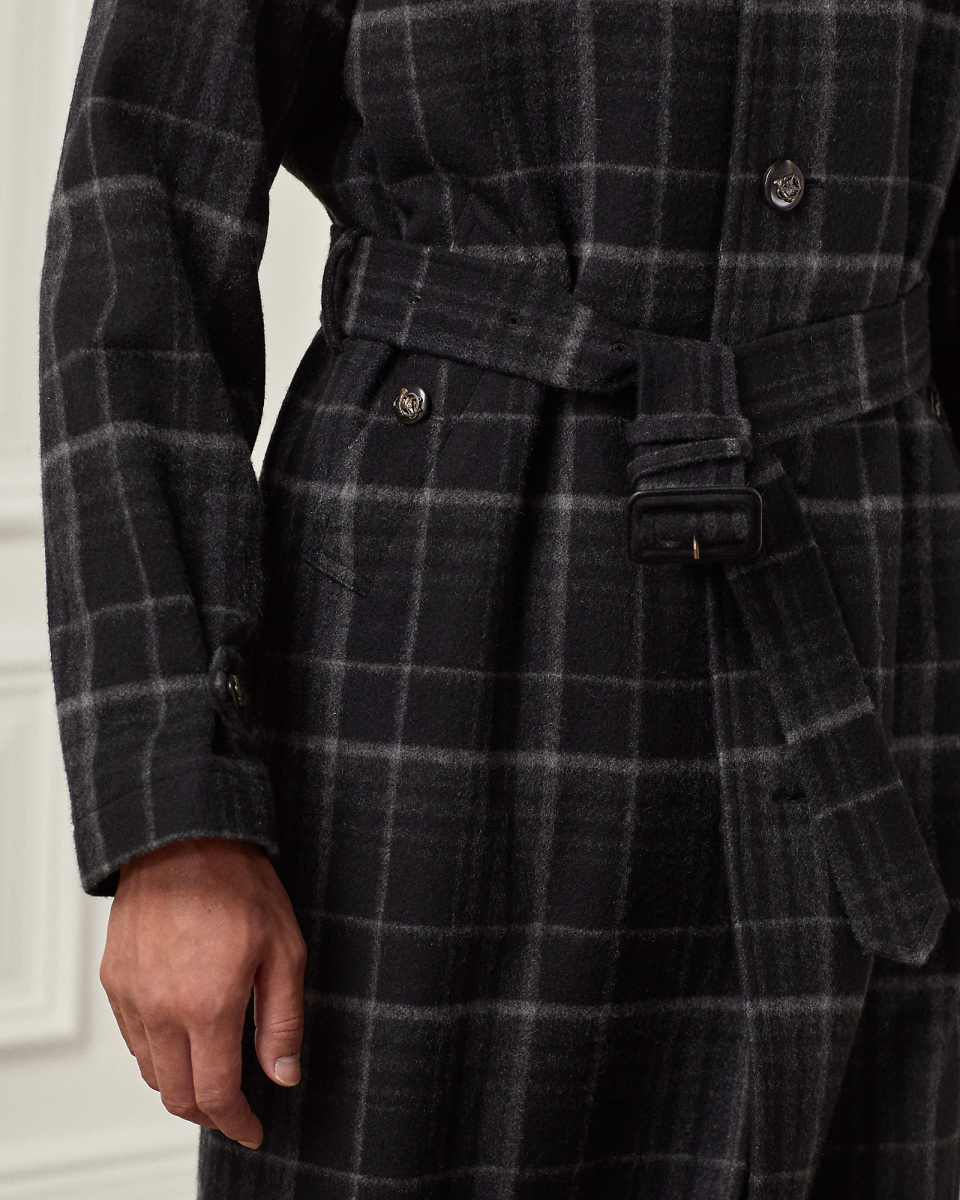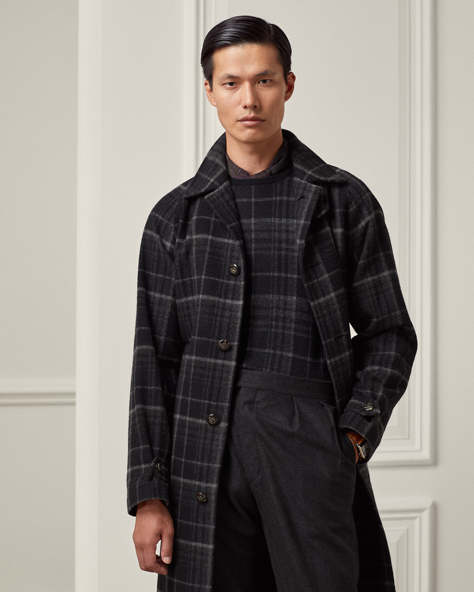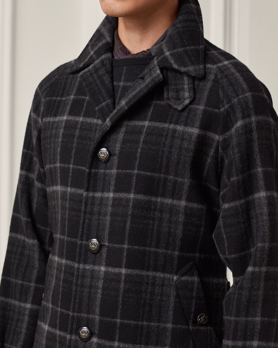 这款巴拿肯外套是 Purple Label 对经典巴拿肯外套的重新诠释,选用格纹山羊绒斜纹布以意大利工艺制成。这种面料英格兰工厂 Joshua Ellis 专为 Ralph Lauren 研发