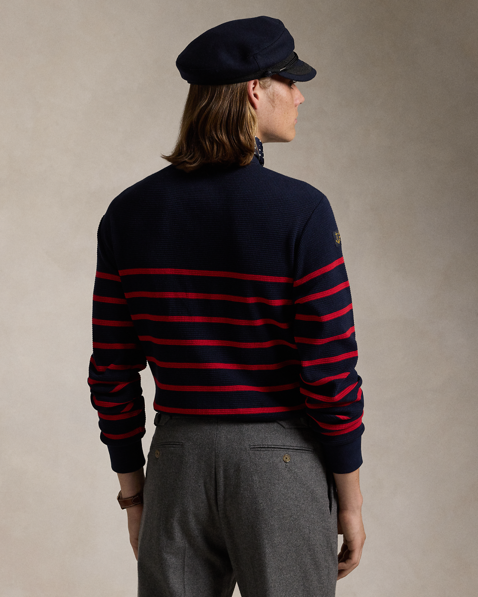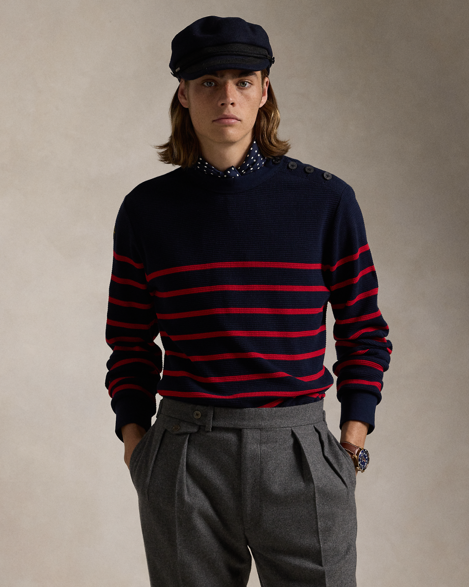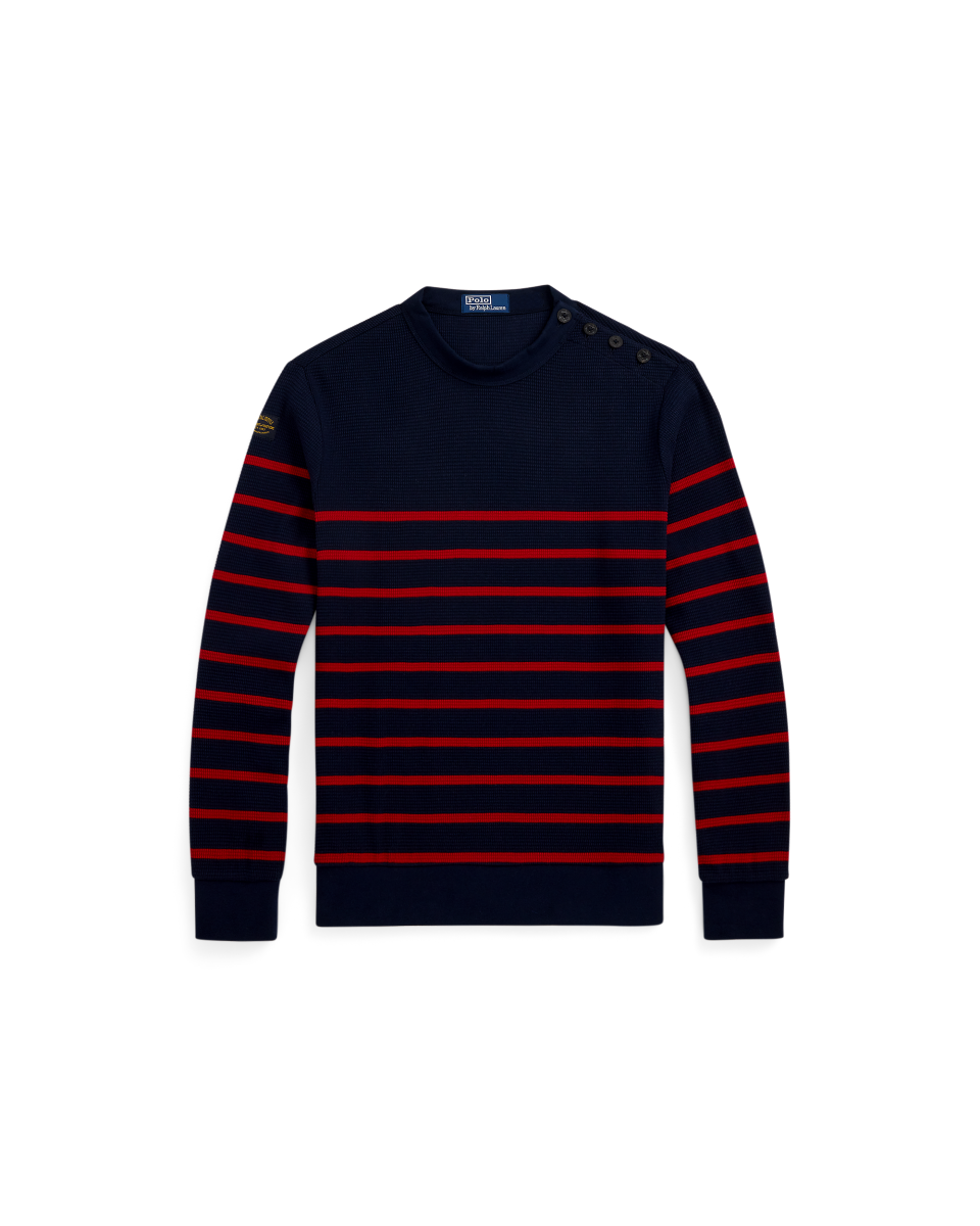 这款棉质圆领衫饰有经典条纹,左侧肩部配有纽扣式门襟,呈现航海风格外观