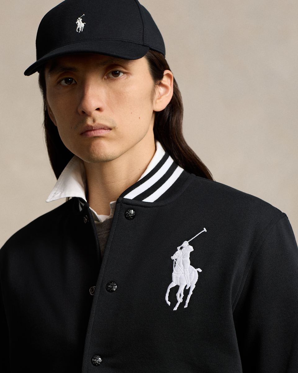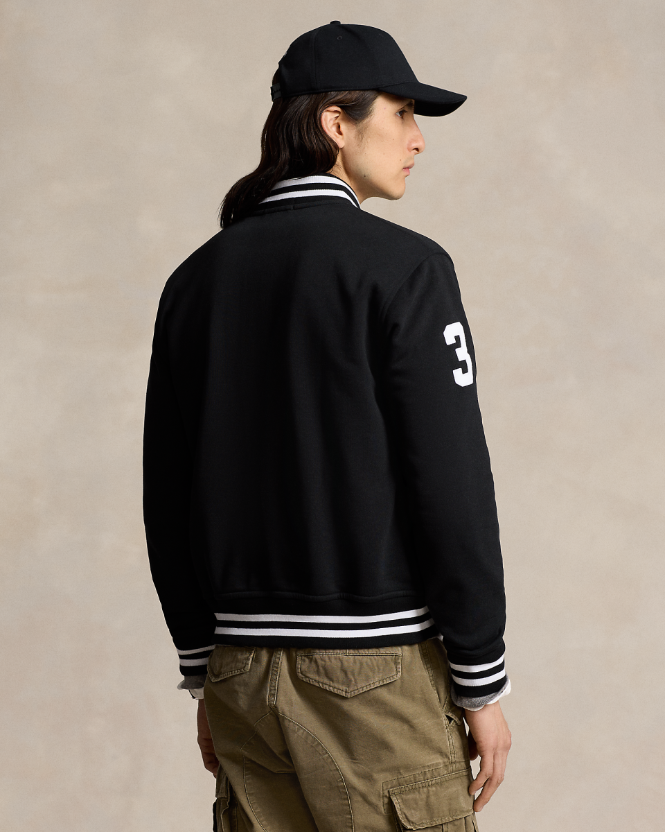 这款棒球夹克右侧衣袖饰有马球队实力选手所佩戴的数字 3 斜纹布补片