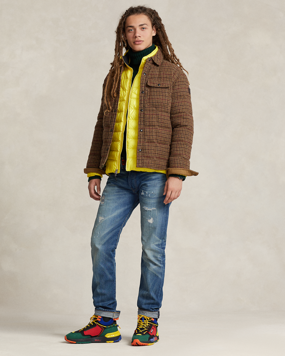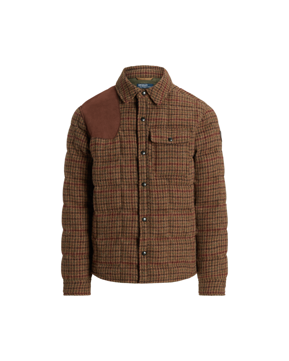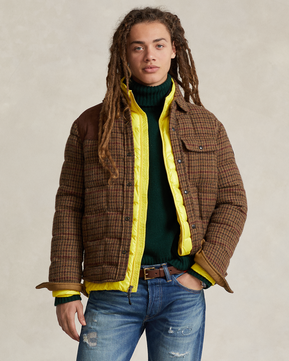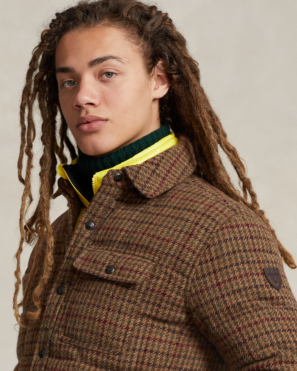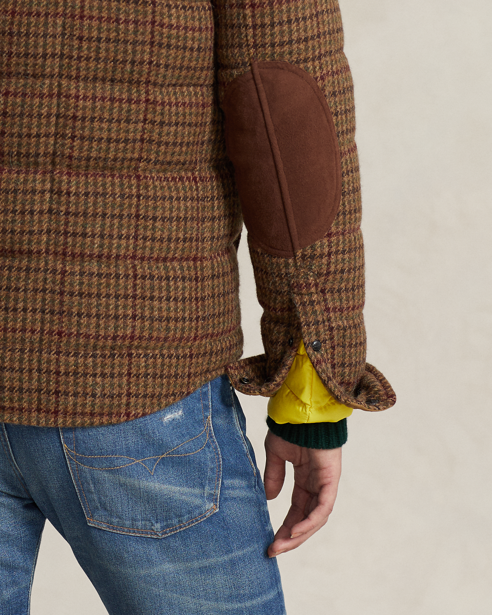这款千鸟格纹夹克选用男装品质面料制成,该面料由爱尔兰 Magee 1866 工厂专为 Polo Ralph Lauren 定制研发,Magee 1866 工厂生产手工梭织粗花呢已有 150 多年的历史,填充蓬松度为 750 的羽绒,饰有绒面补片