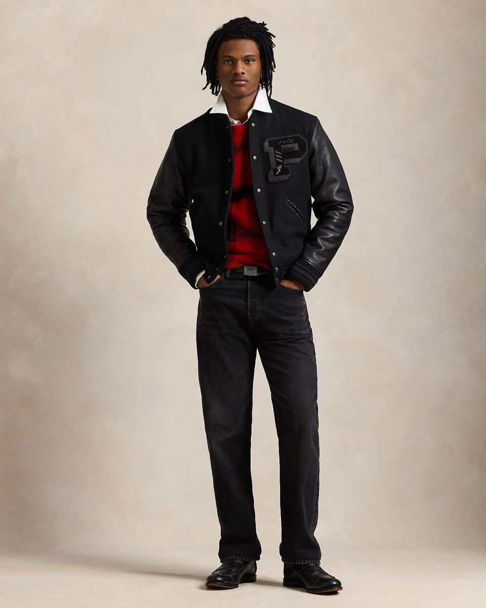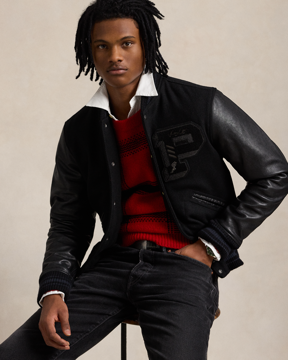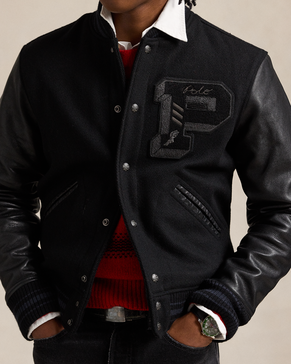 这款运动员夹克衣身选用舒适的面料制成,搭配撞色牛皮革衣袖和条纹罗纹饰边,是一代又一代高中和大学运动员的衣橱常备单品,经本季现代演绎,呈现同色系黑色,彰显 Polo Ralph Lauren 风格