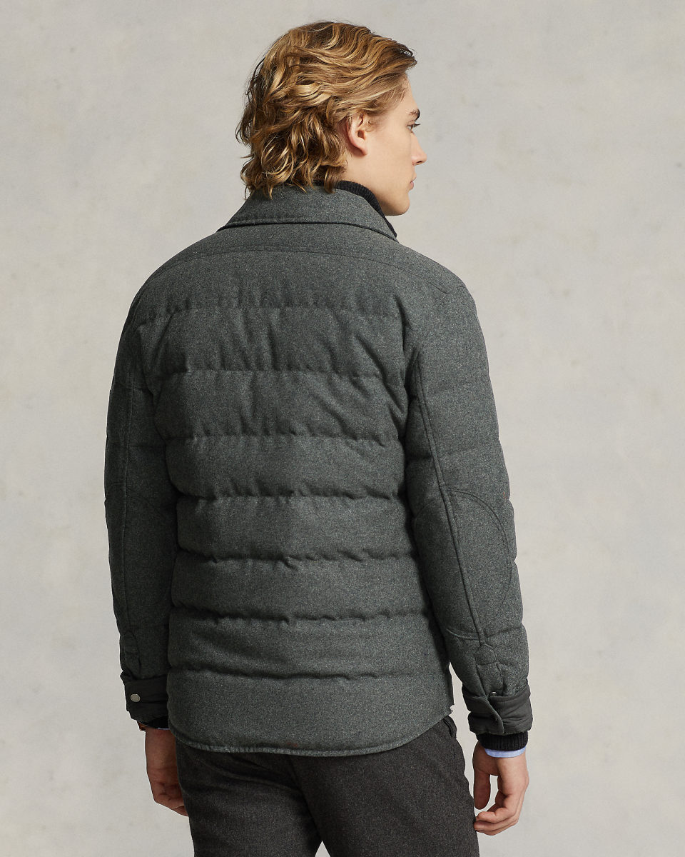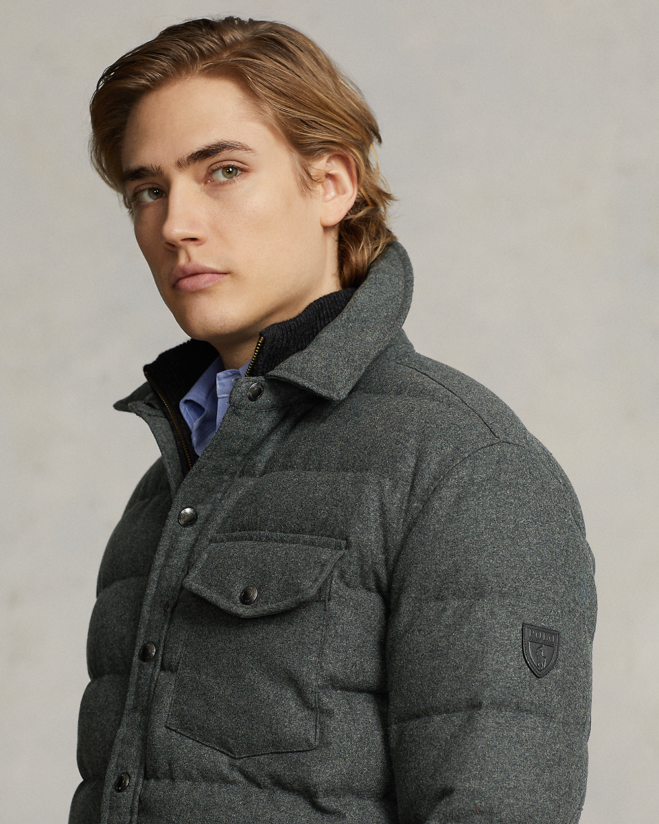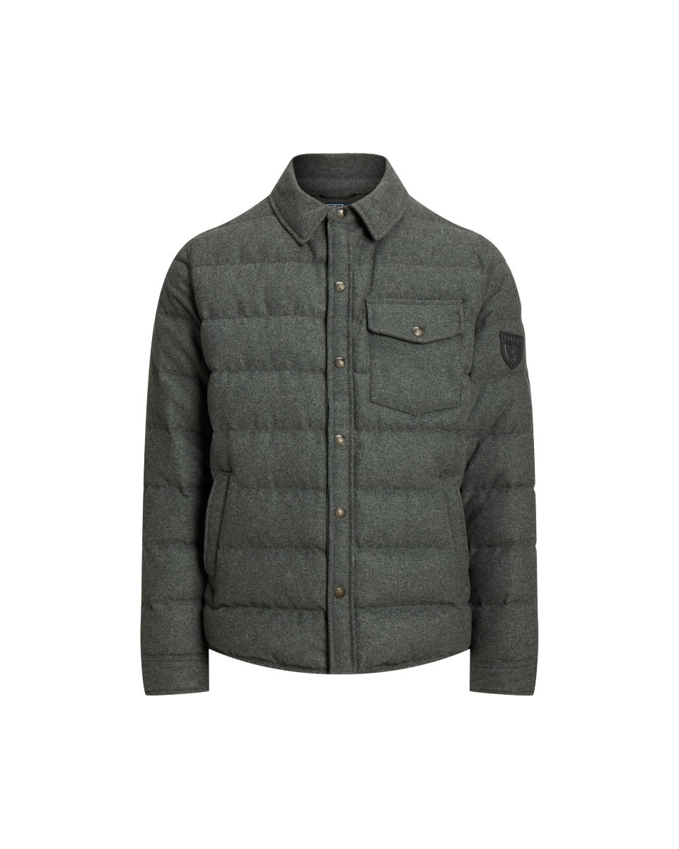 这款绗缝夹克经羽绒填充,保暖性佳,衣袖饰有标志性牛皮革盾形补片