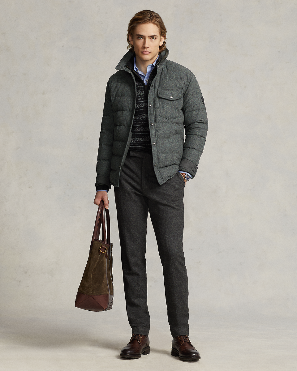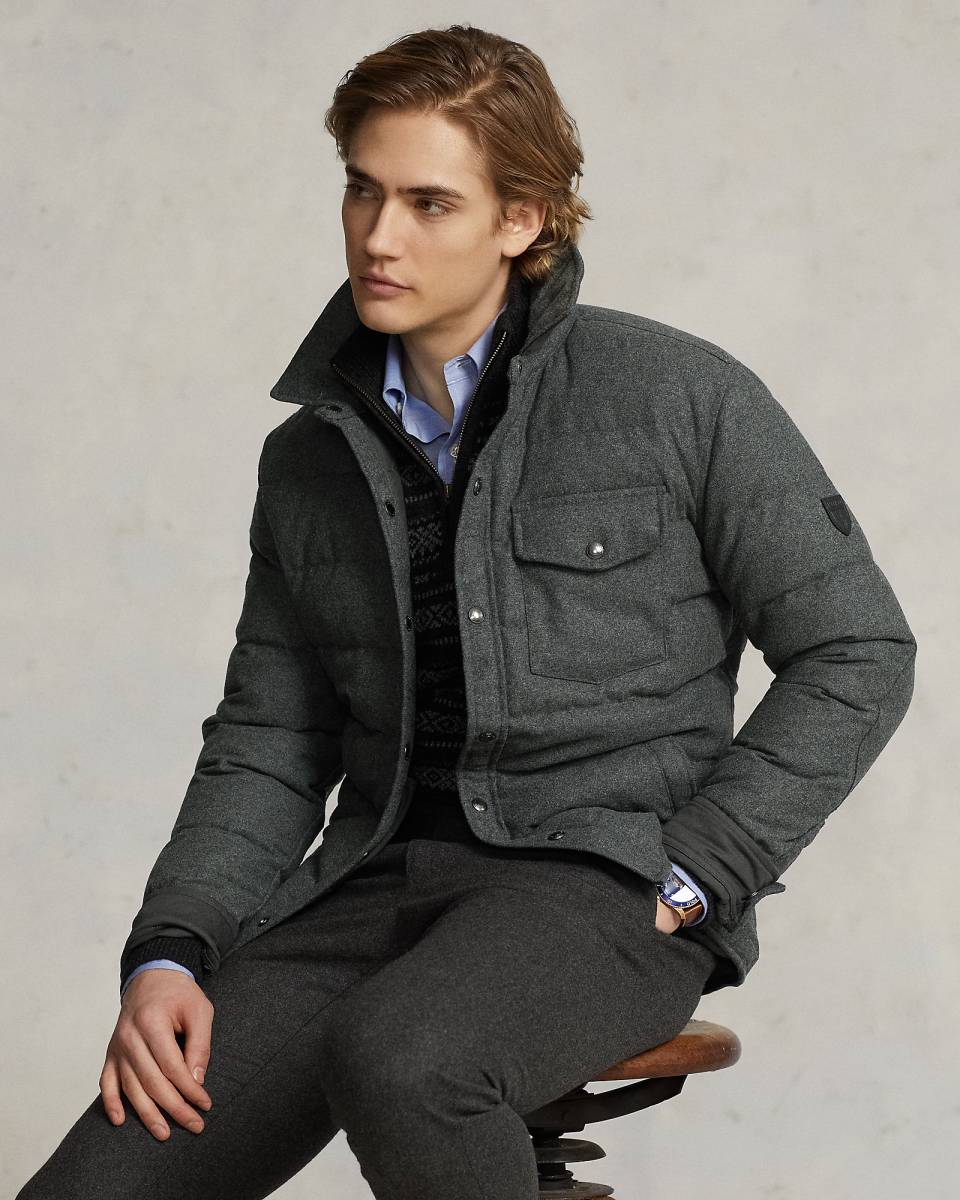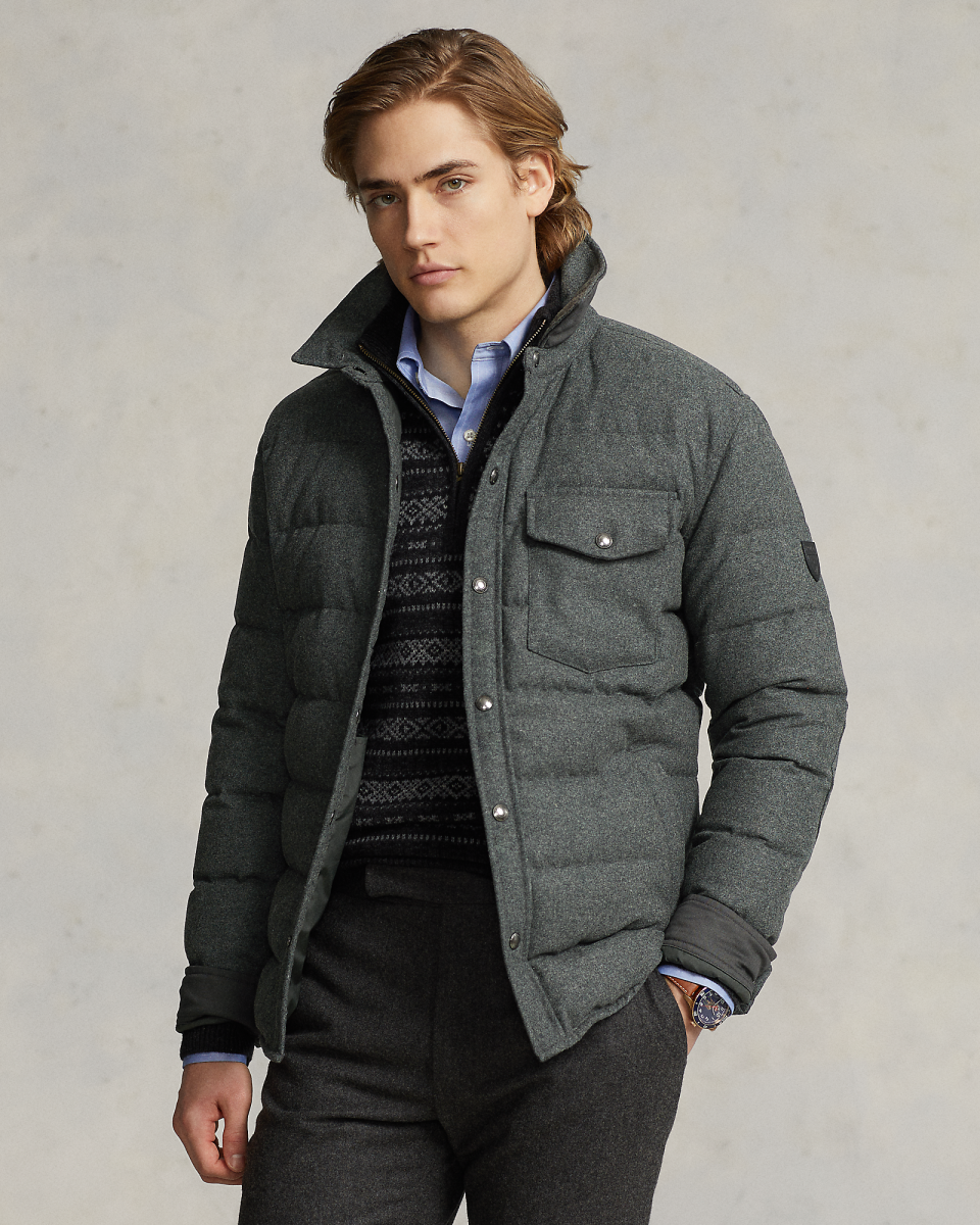 这款绗缝夹克经羽绒填充,保暖性佳,衣袖饰有标志性牛皮革盾形补片