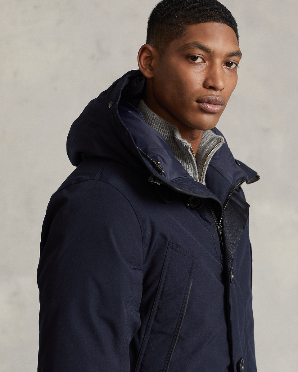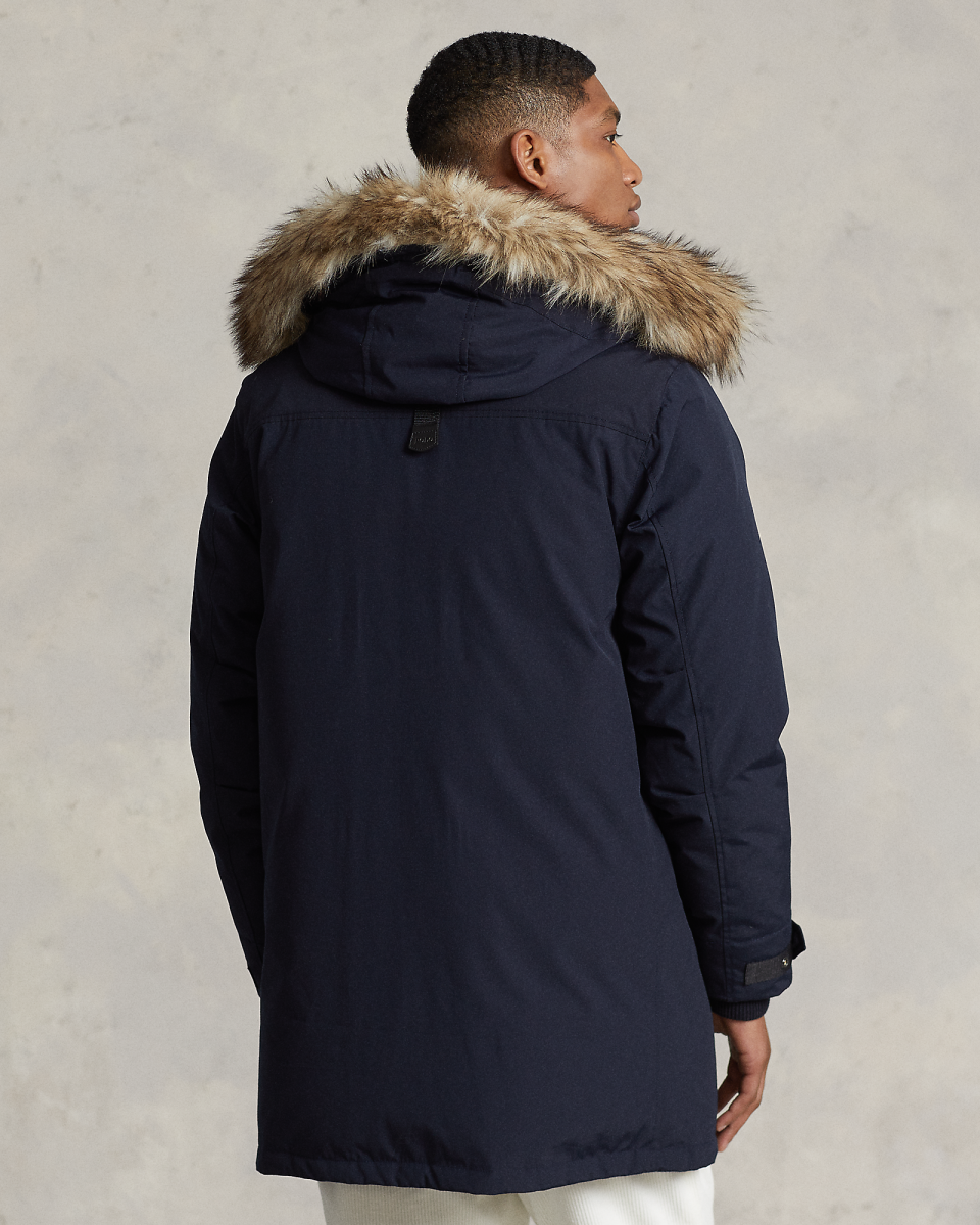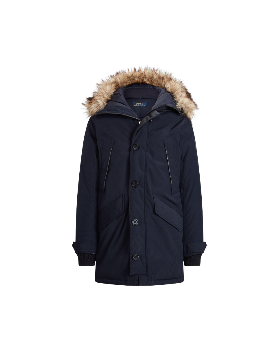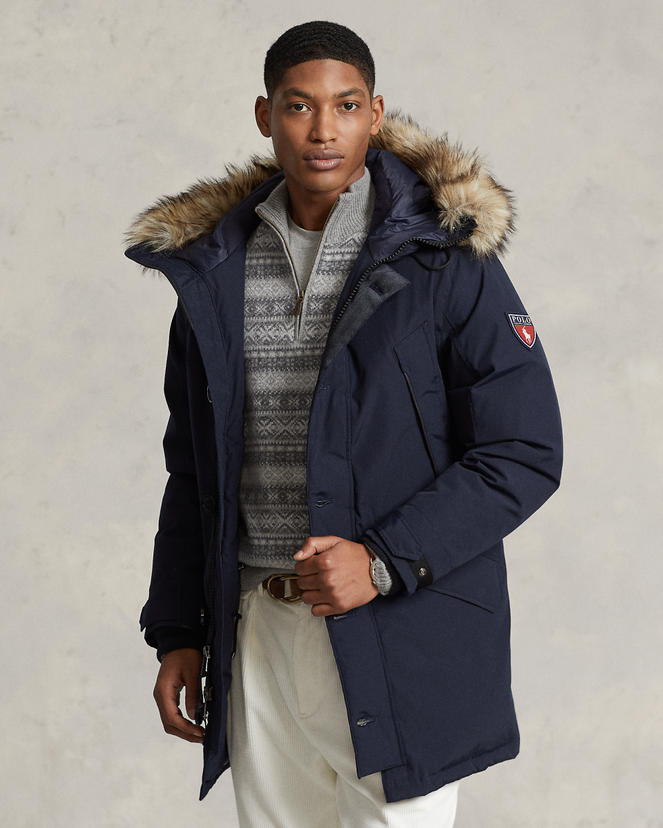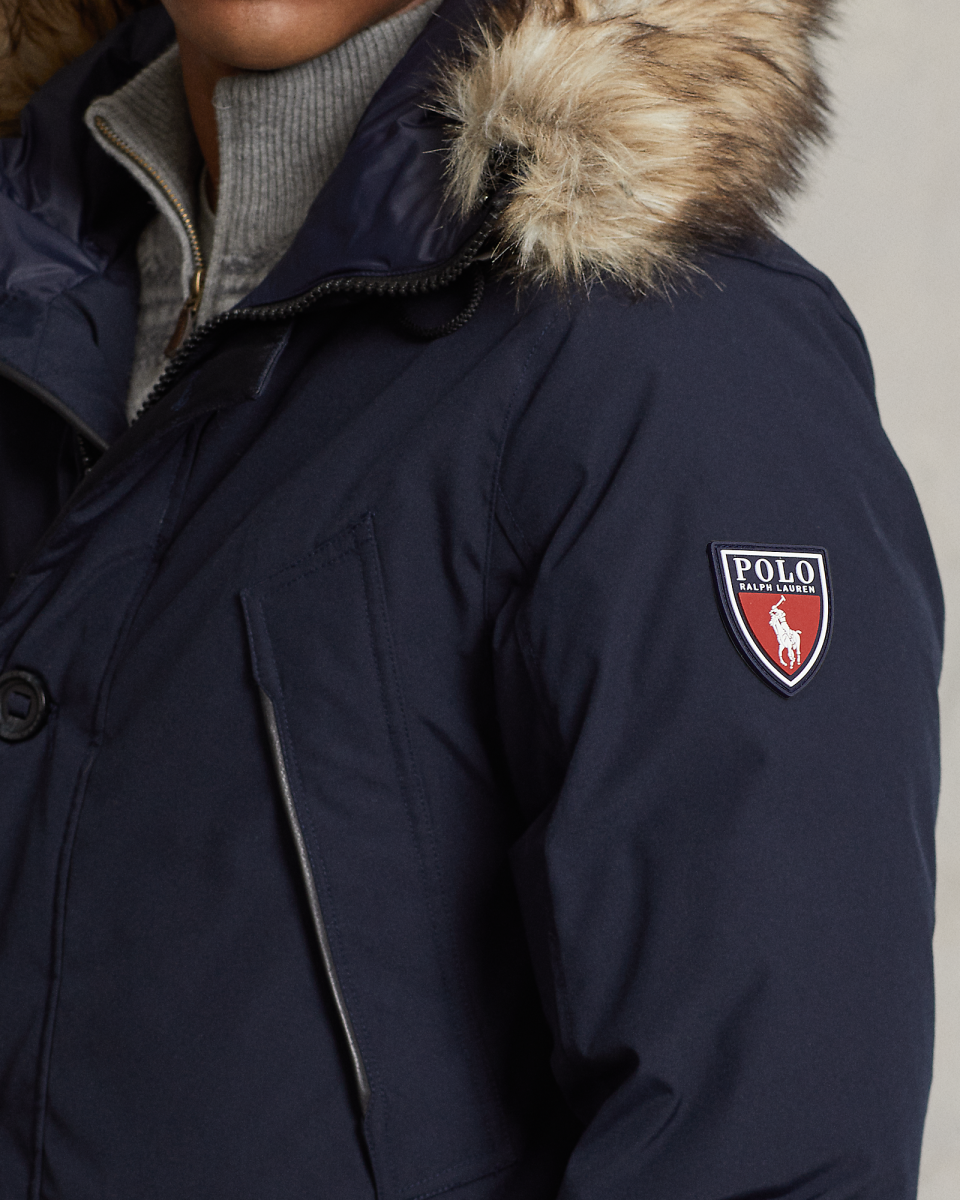 这款派克大衣填充蓬松度为 650 的羽绒,可抵御恶劣天气,同时呈现 Polo 风格,不仅具备拒风防沾水特性,还配有带可拆卸人造皮草饰边的风帽