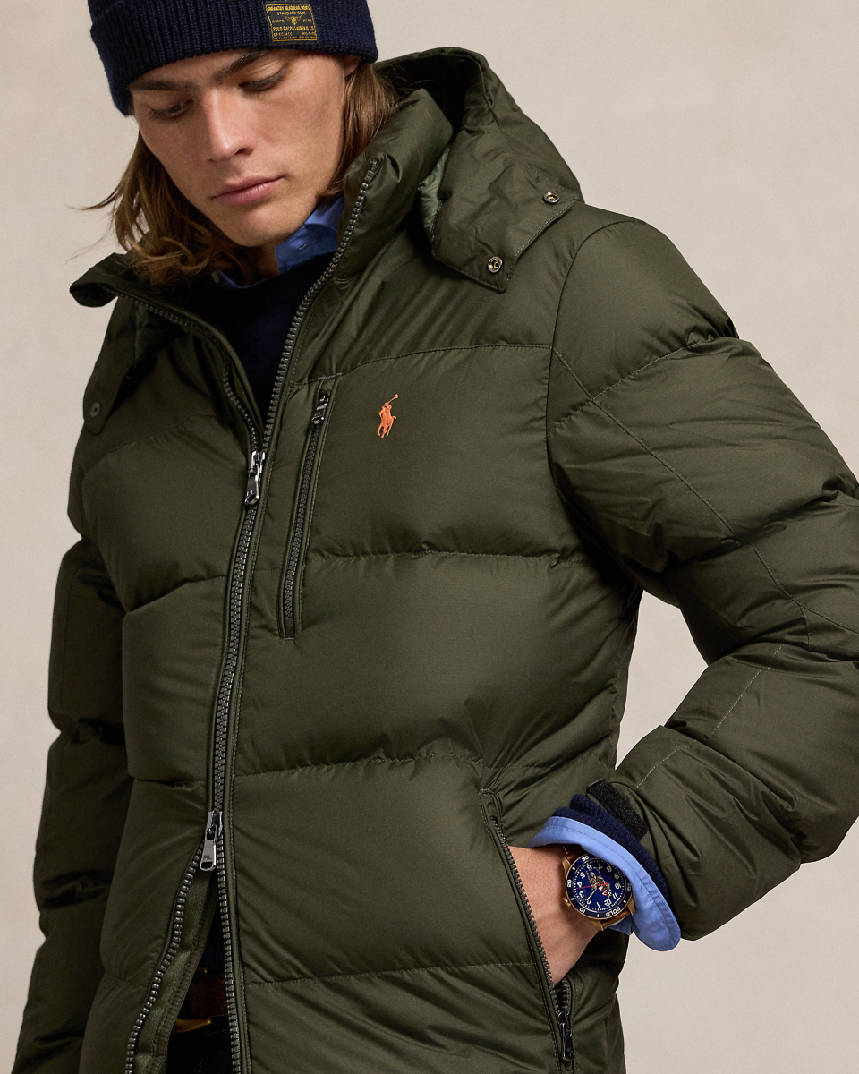 这款夹克选用防沾水面料制成,填充蓬松度为 650 的羽绒,搭配可拆卸风帽