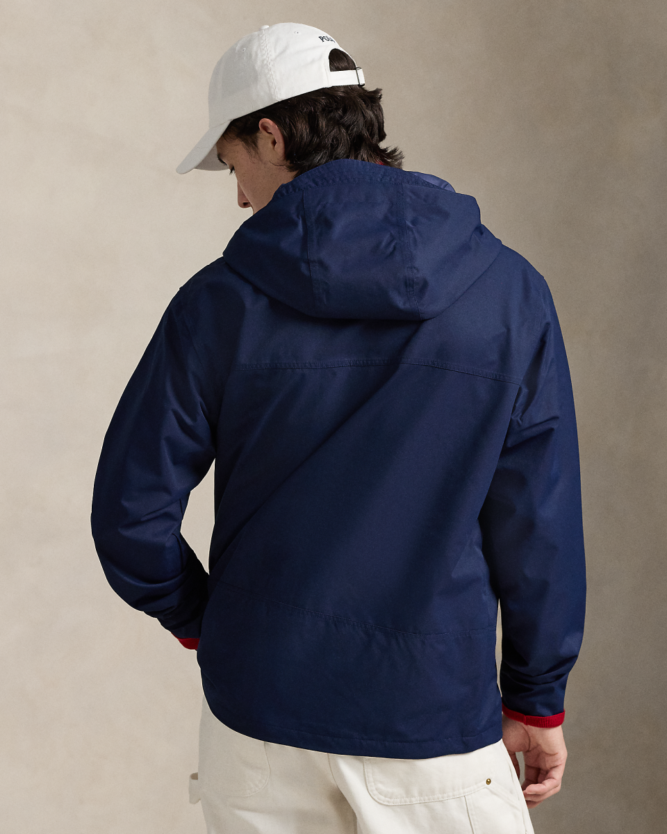 这款夹克选用轻盈的抗水面料制成,配有抽绳风帽