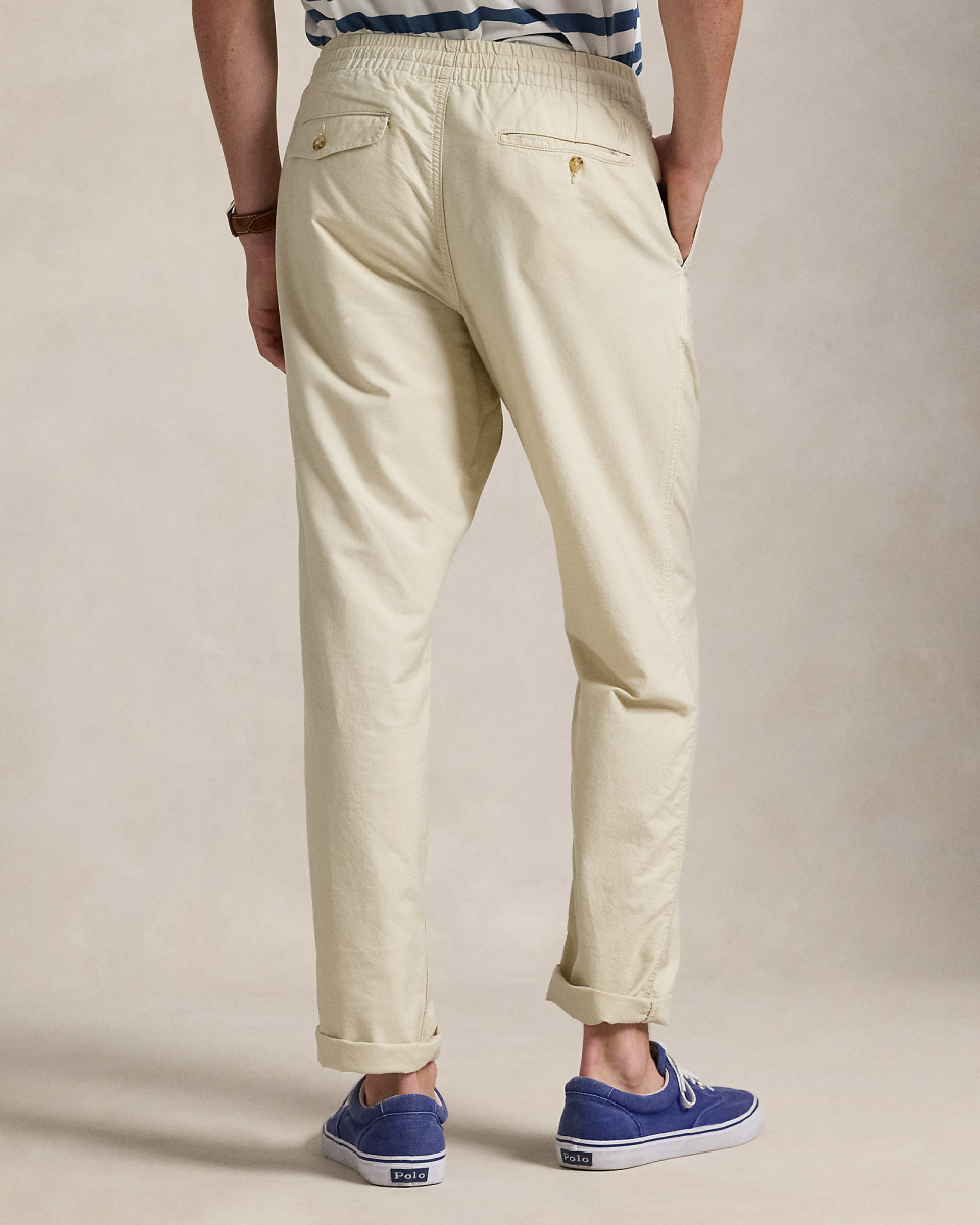 这款染色长裤选用棉质牛津布面料制成,采用弹性抽绳裤腰等标志性 Polo 学院风短裤的设计元素
