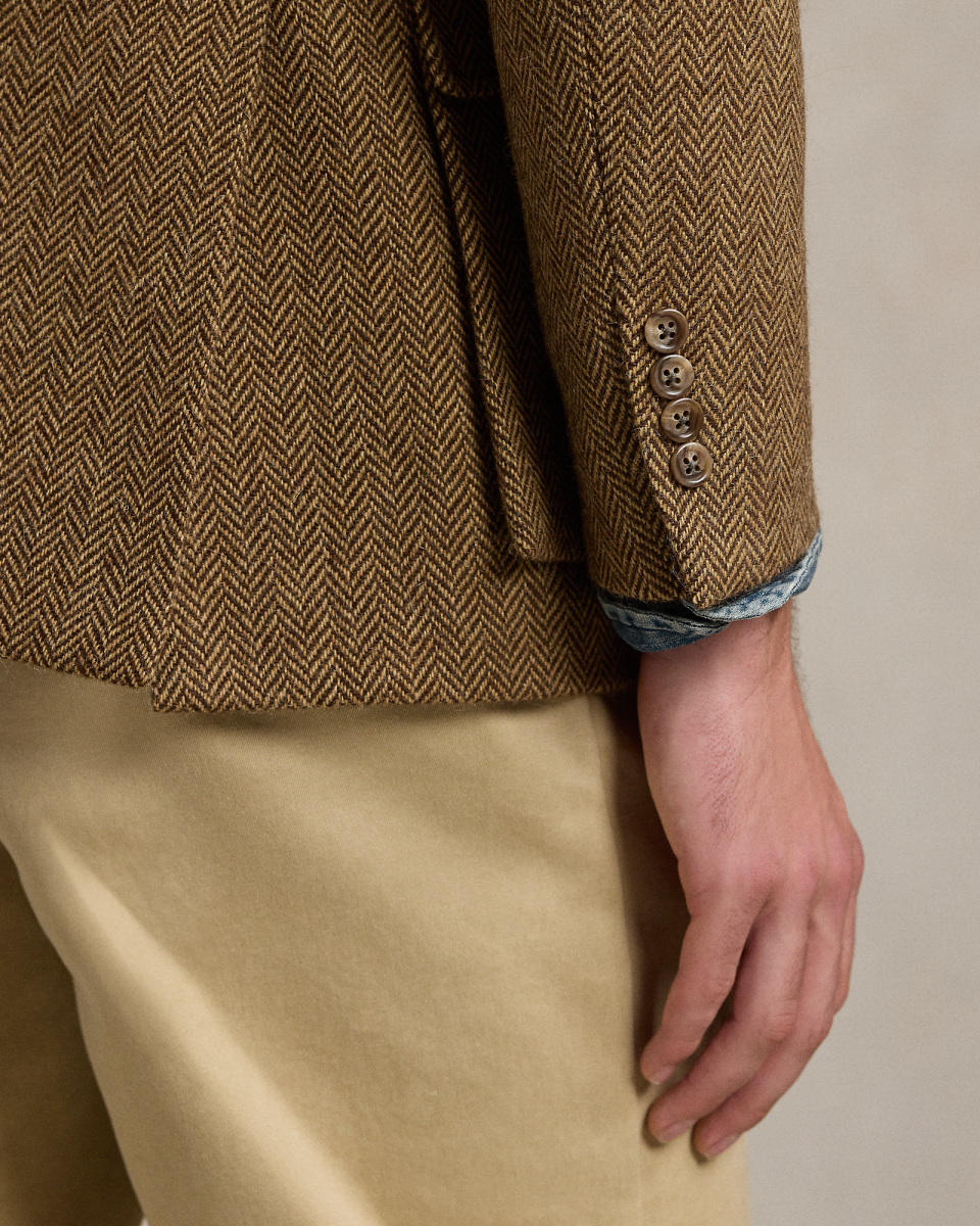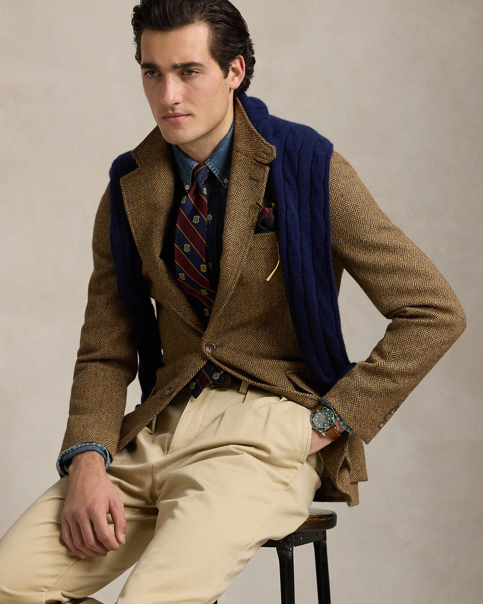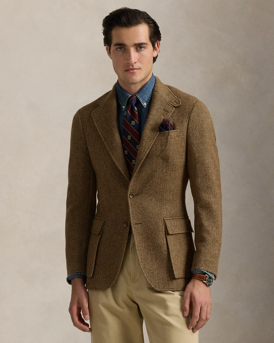 RL67 外套专为纪念 Ralph Lauren 成立 50 周年而打造,灵感源自运动外套——自 1971 年以来一直被 Lauren 先生视为衣橱常备单品,这款夹克经全新演绎,选用羊毛人字斜纹面料制成,可与马甲搭配,该面料产自闻名爱尔兰工厂 Magee 1866