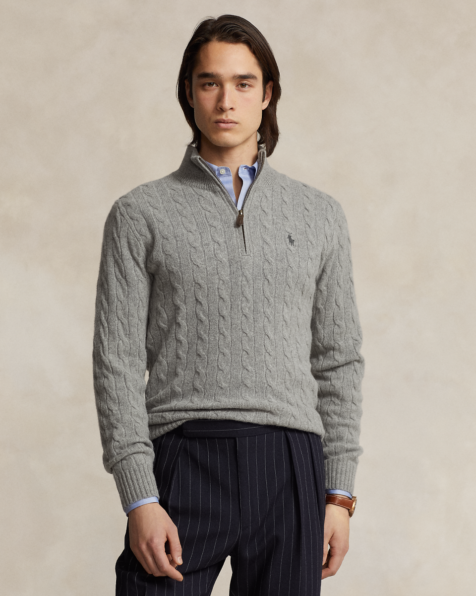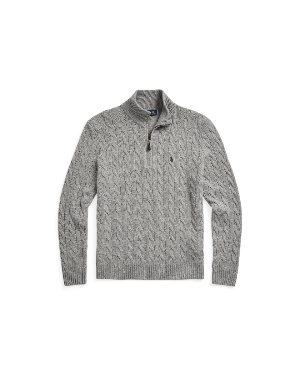 这款四分之一拉链针织衫选用舒适的面料制成,采用标志性绞花编织设计