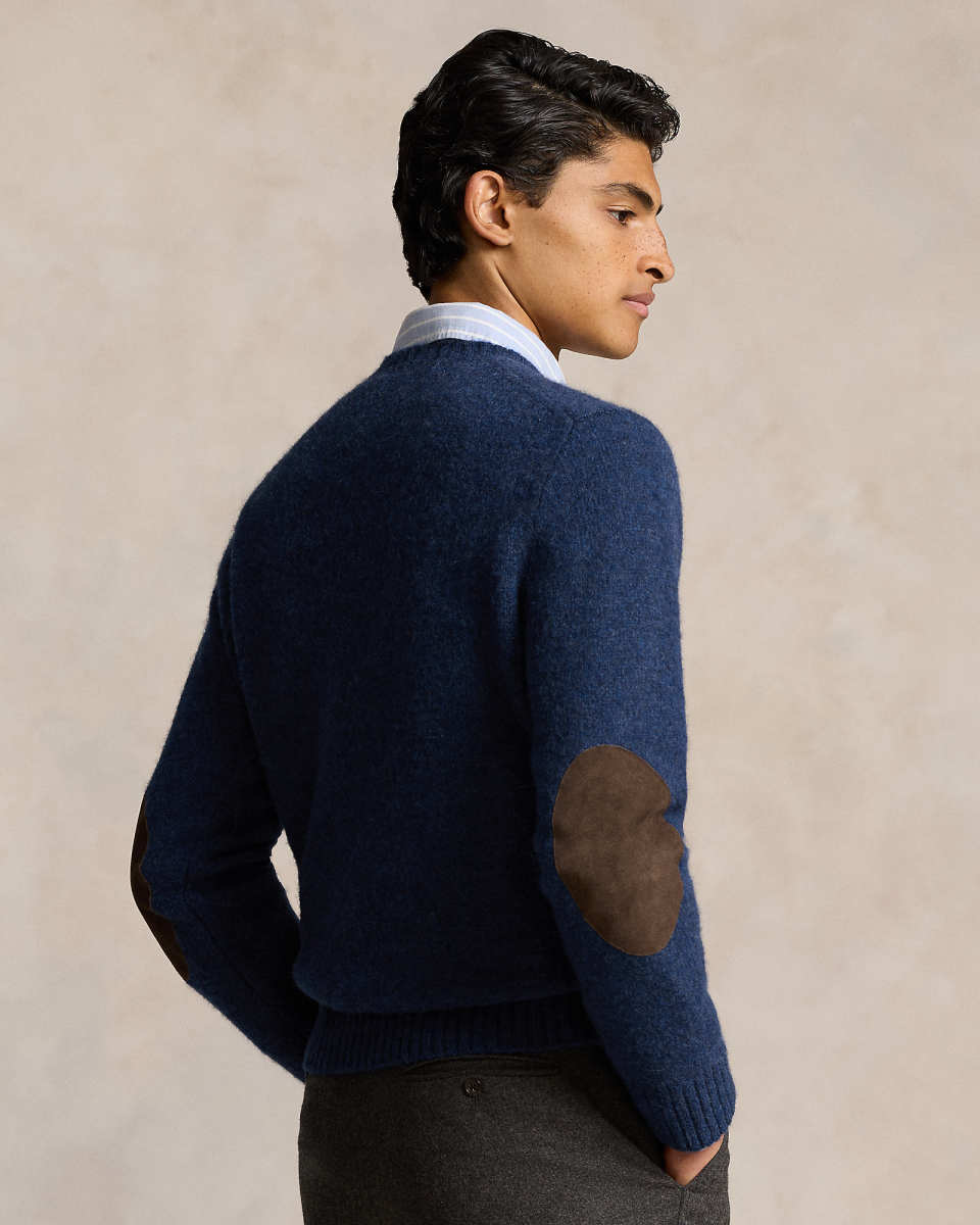 这款圆领针织毛衫选用舒适的粗针纱线织就,搭配绒面羊绒面革肘部垫布,呈现复古风格外观