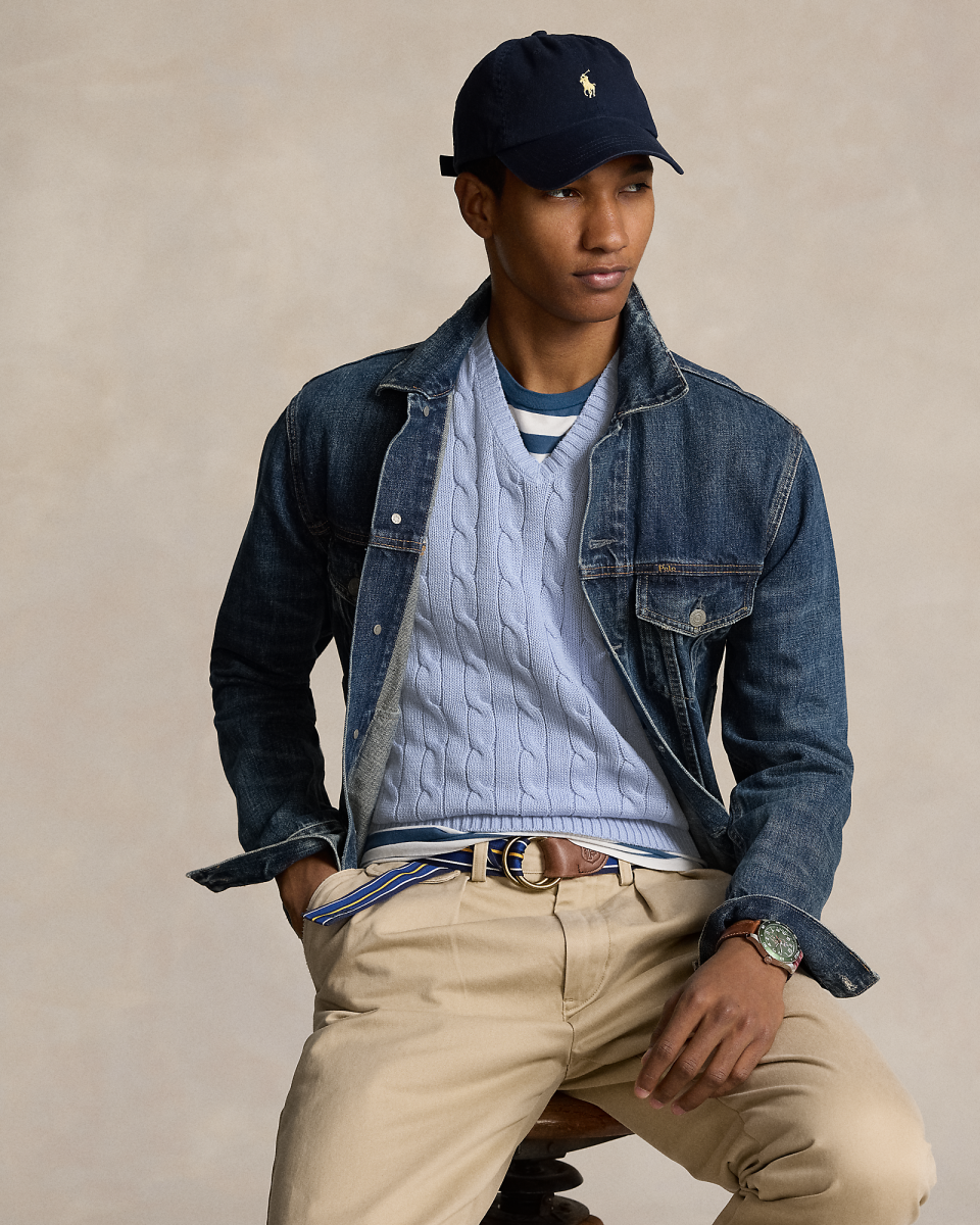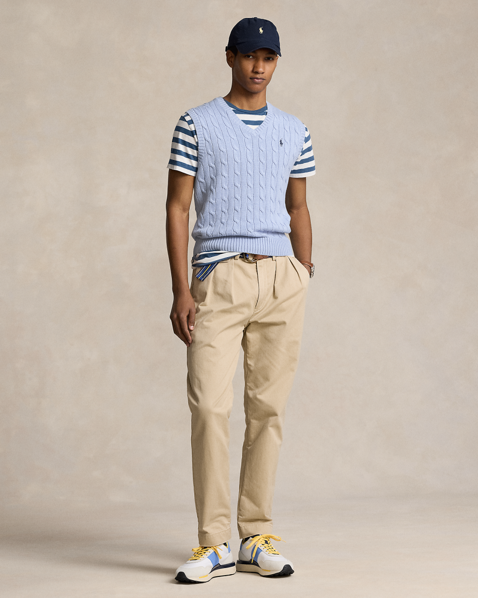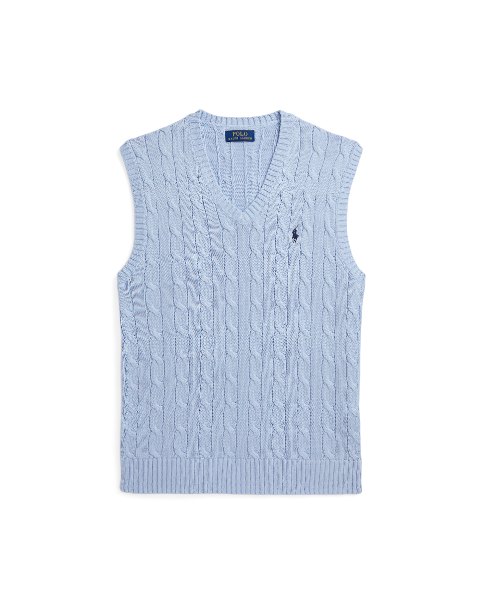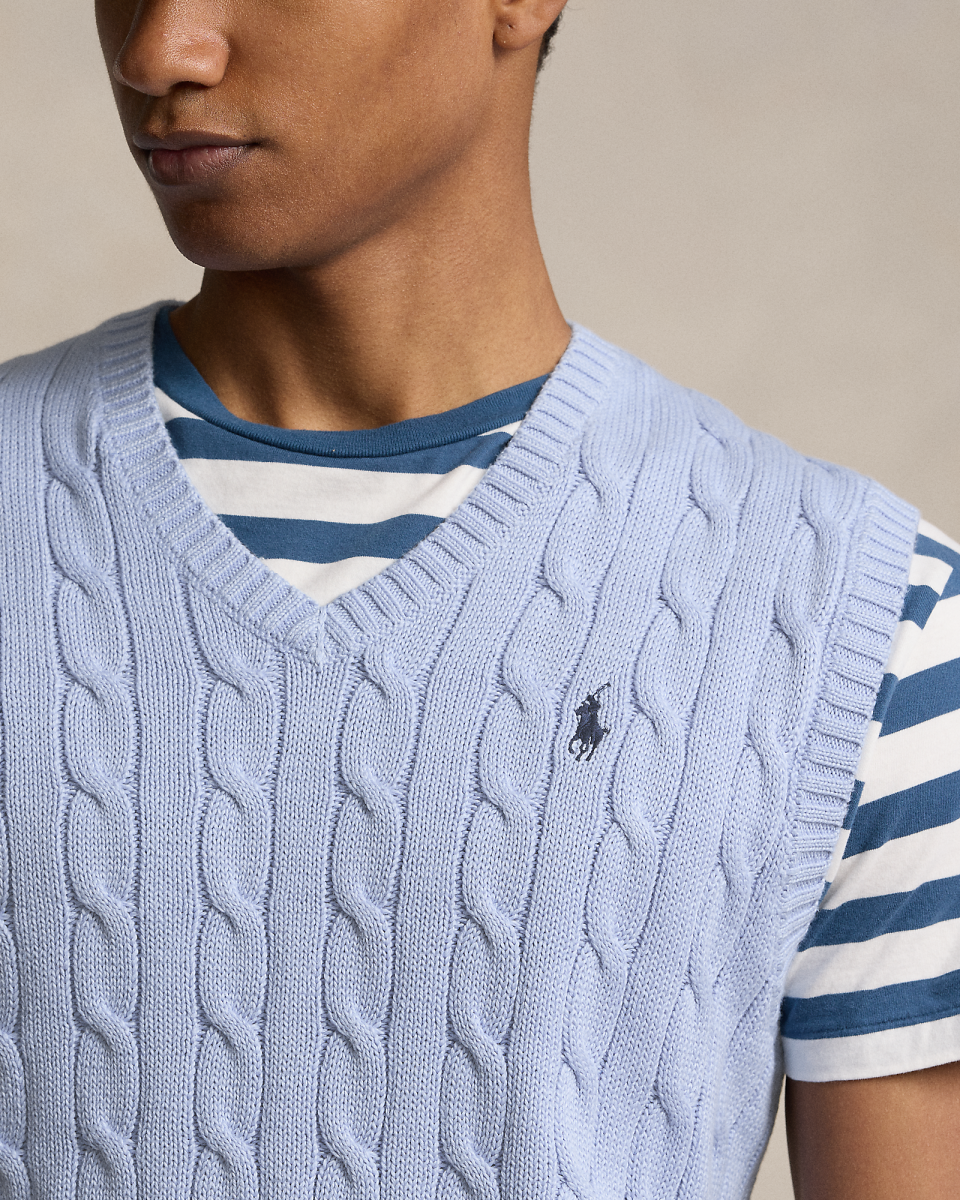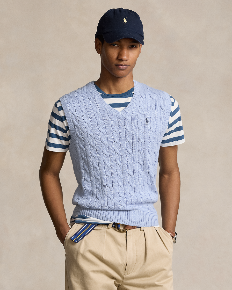 这款针织衫背心结合了 Polo 的两大标志性设计细节:具有纹理感的绞花编结图案和标志性小马