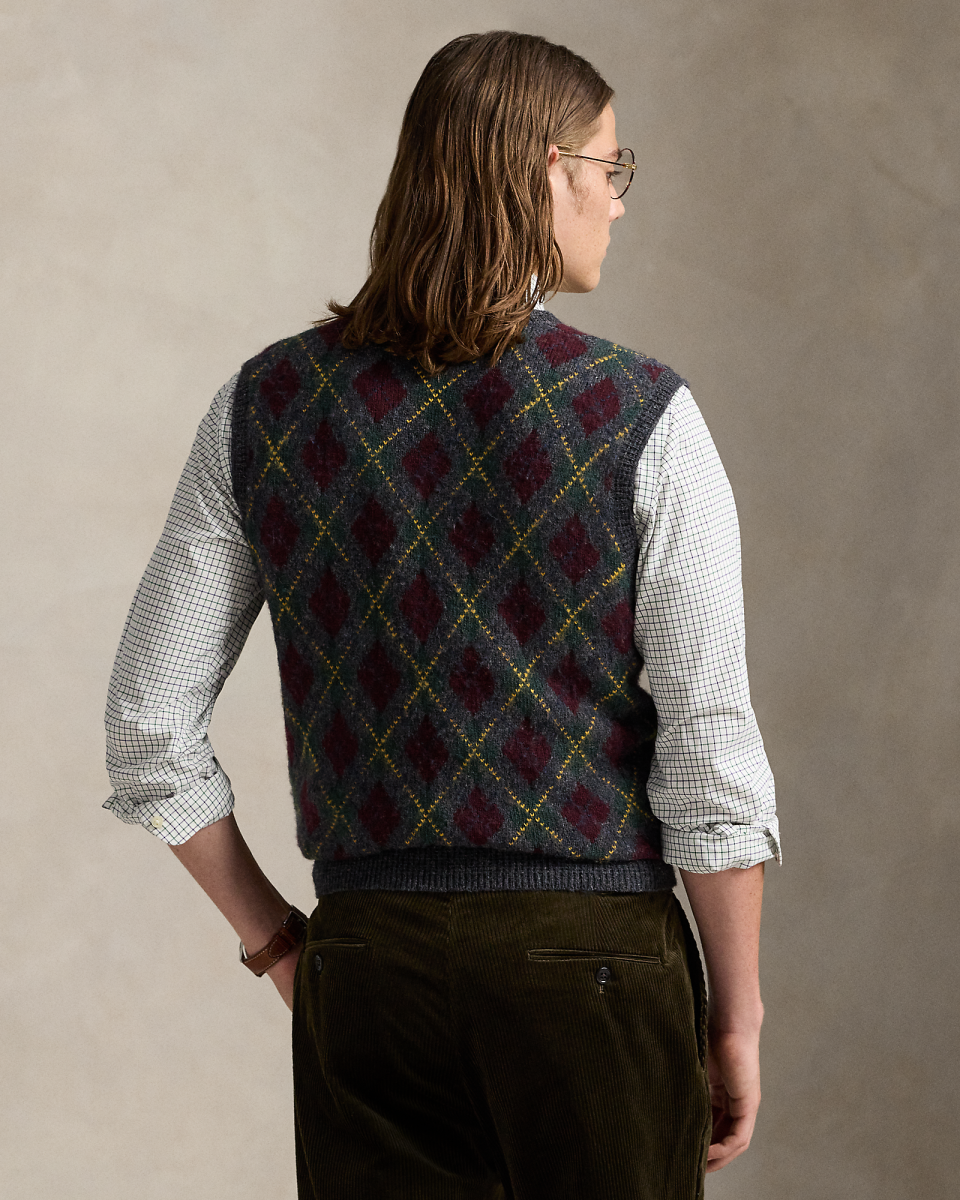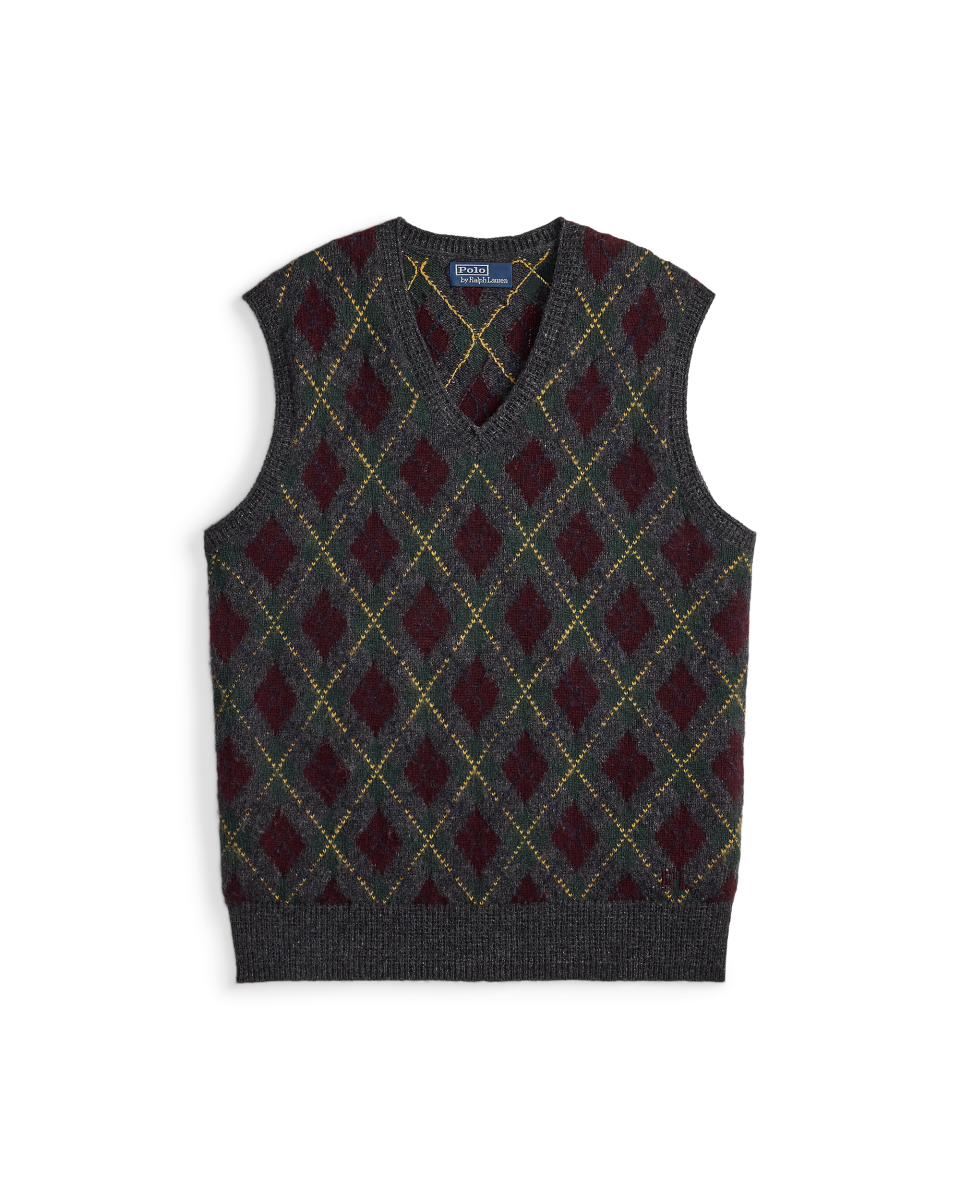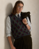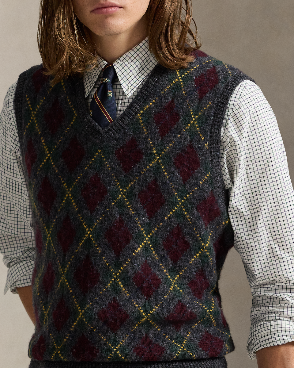 这款菱形花纹针织衫背心属于本季系列,灵感源自曼哈顿上城区的雅致简约风格,左侧下摆饰有我们创始人的姓名字母刺绣