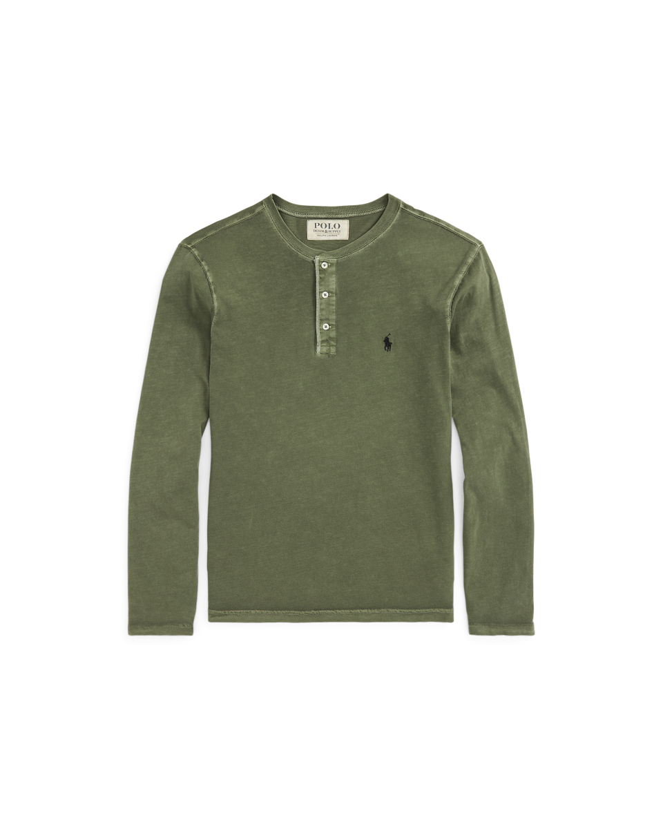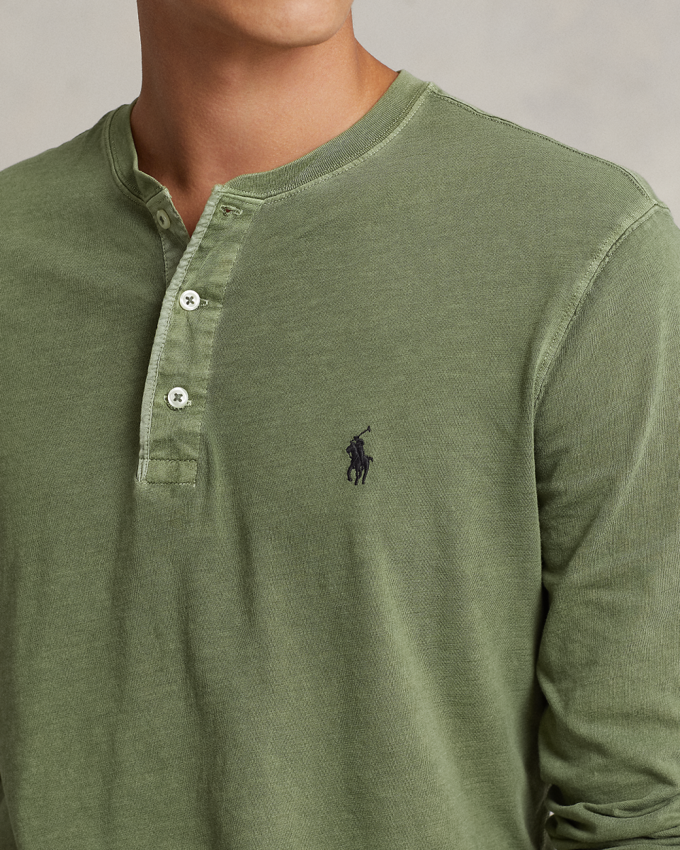 经典亨利衫原本由英国划手们在赛艇比赛中穿着,如今 Polo 借由时尚视角,以粗纺棉平纹针织面料对其进行重新演绎