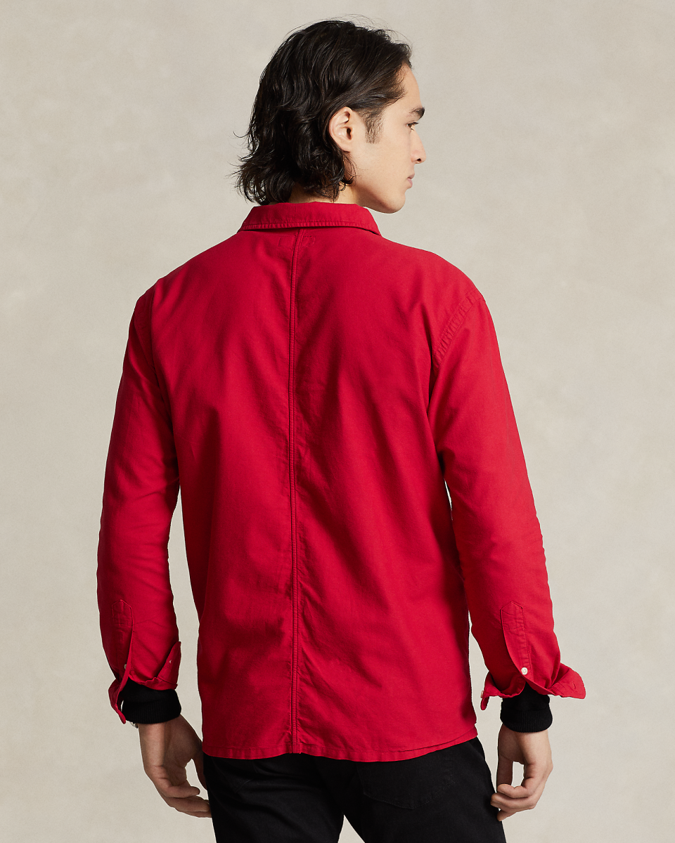 这款成衣染色牛津布衬衫属于我们的新年系列,经焕新演绎,正面采用盘扣开合,专为庆祝新年设计