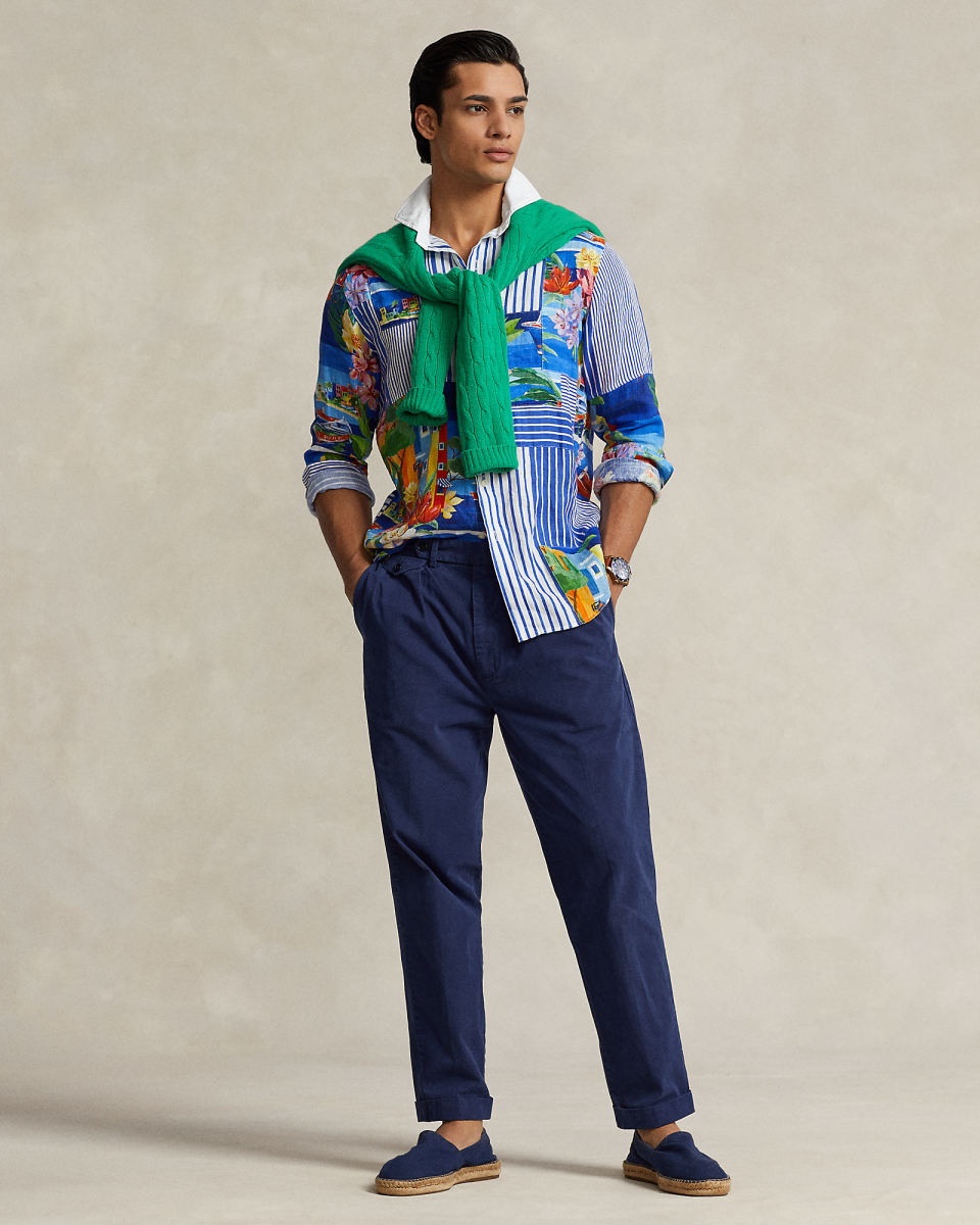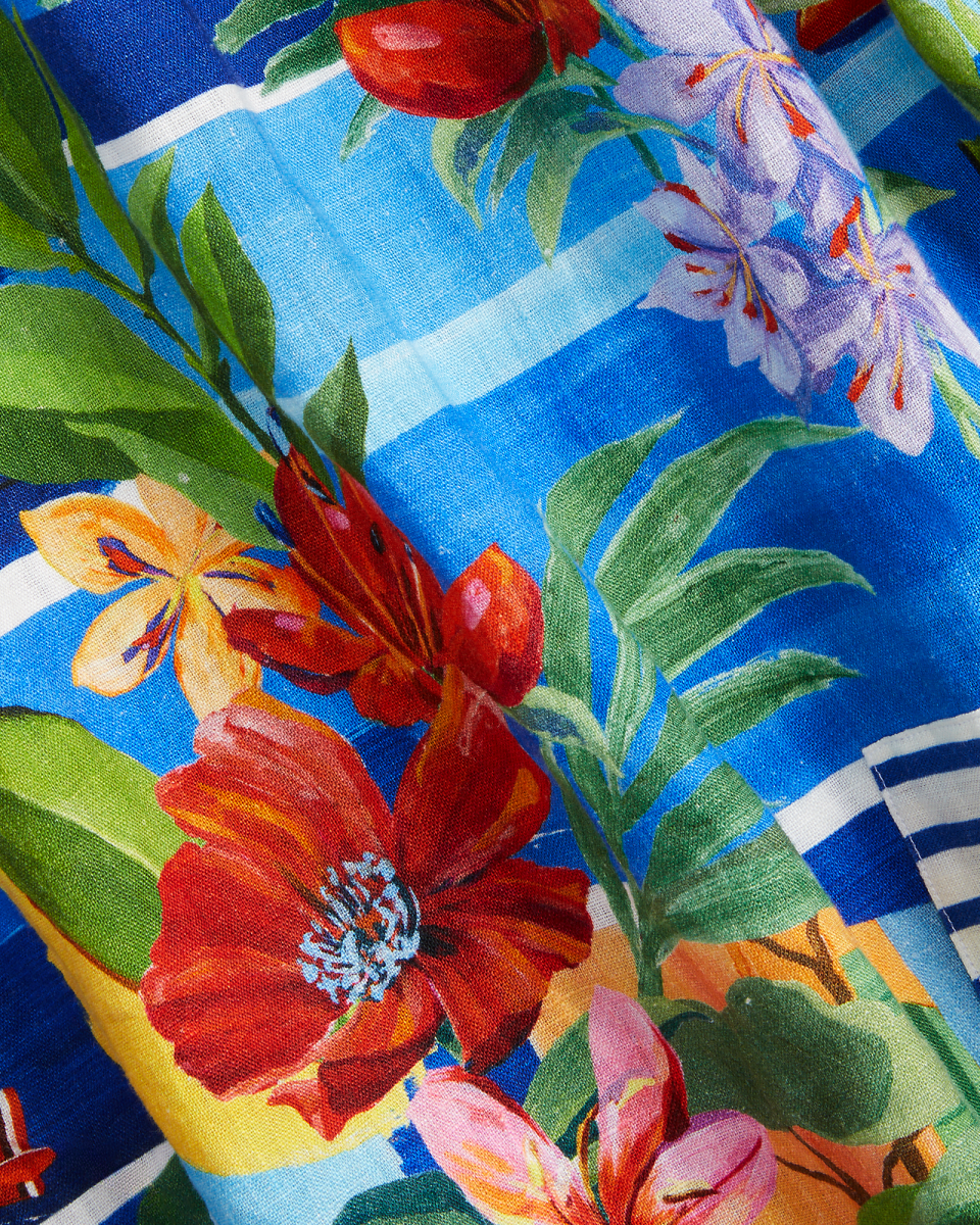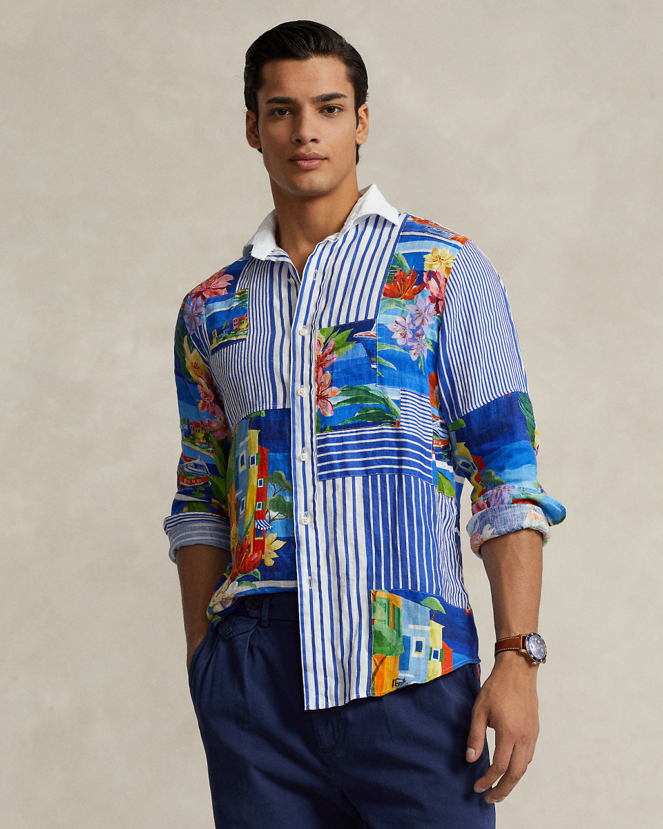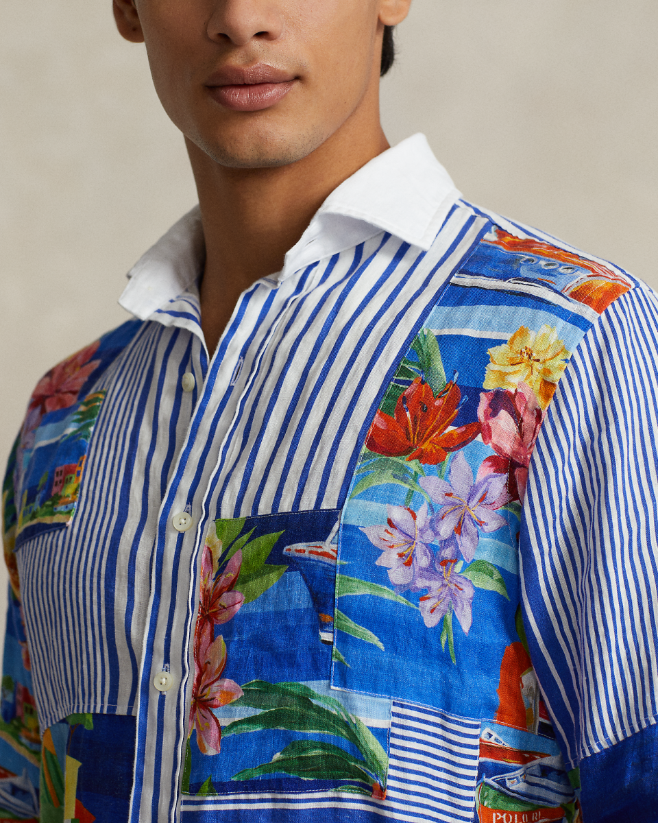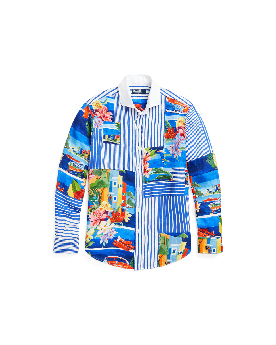 这款衬衫选用轻盈透气的亚麻面料制成,采用鲜艳的拼饰设计,饰有清新的条纹和海滨图案