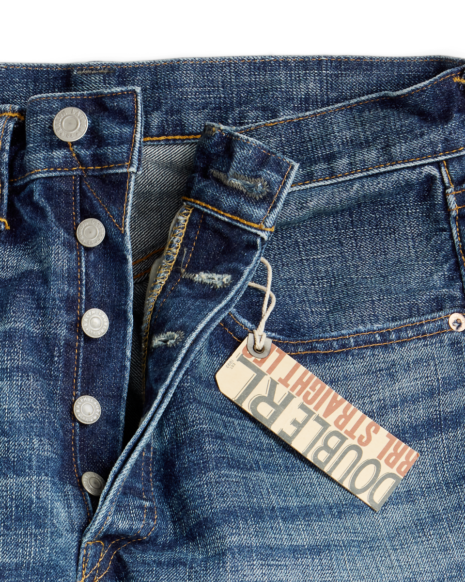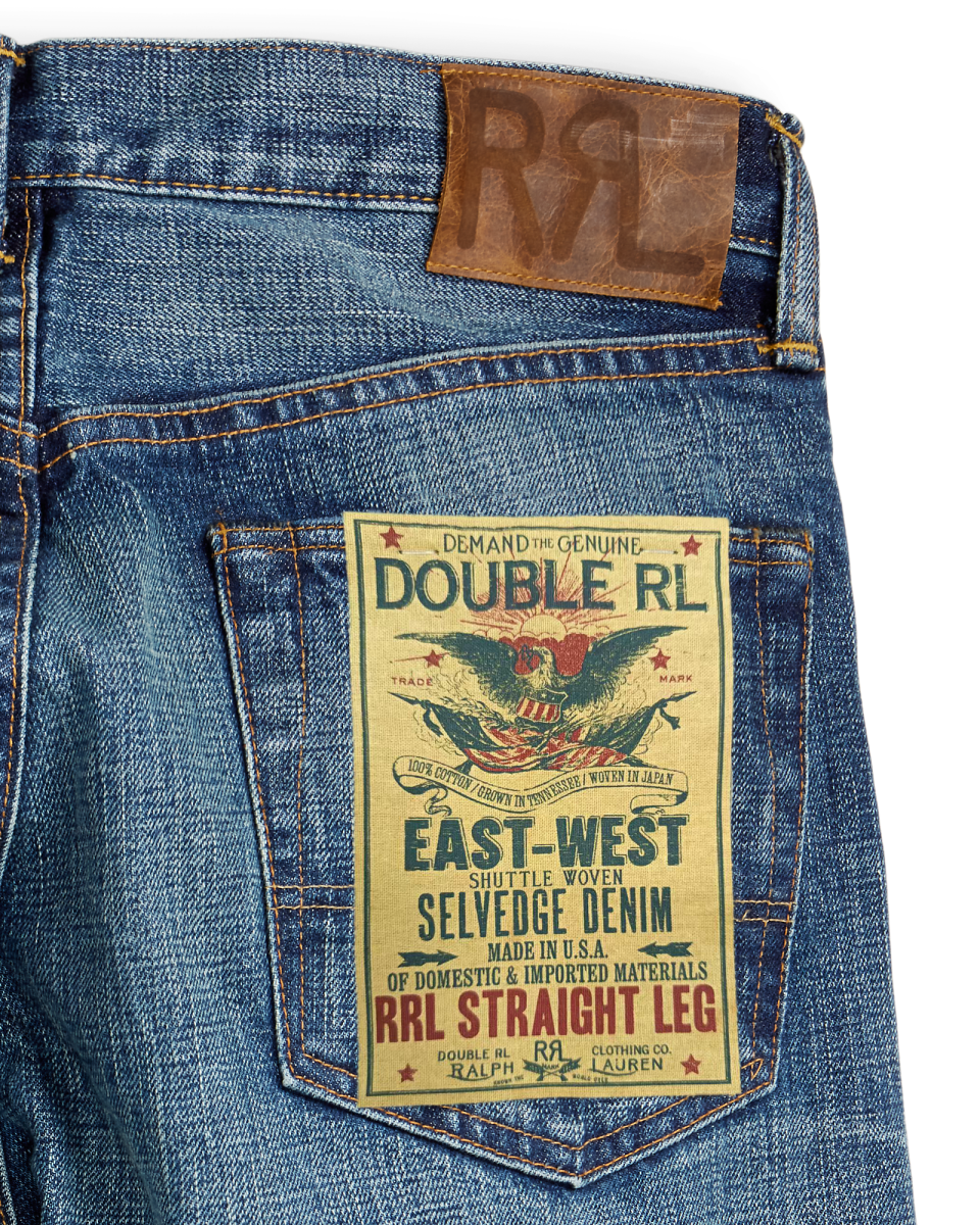 这款牛仔裤选用棉质面料制成,纱线经靛蓝绳染而成,利用老式梭织机织就斜纹布,这是 Double RL 的专属面料,镶边结构灵感源自 30 年代的牛仔装,使用专业工具和工艺,经过多达 50 道工序才得以完成