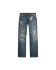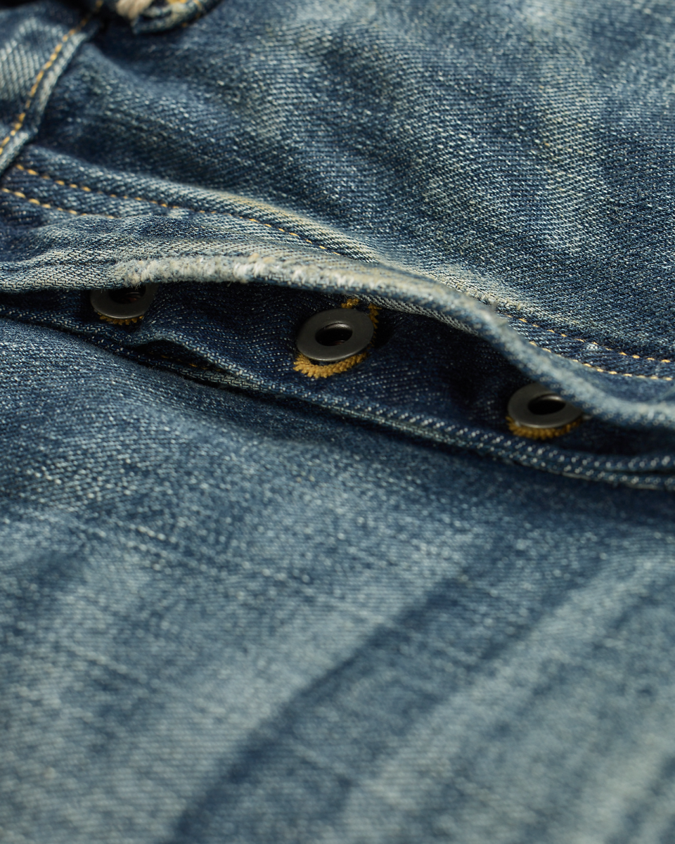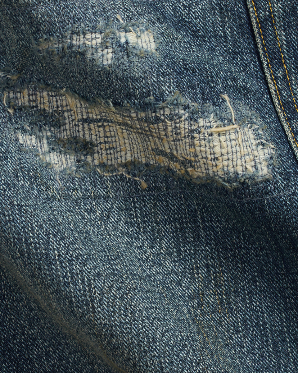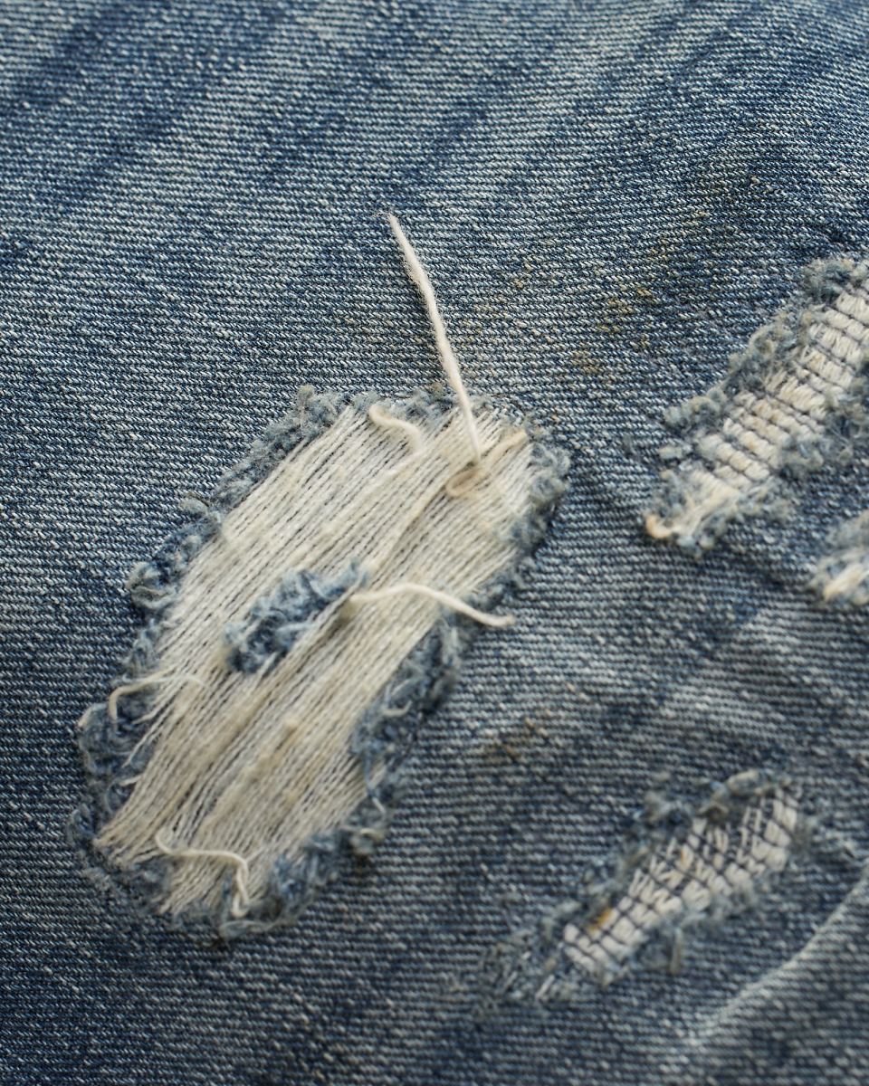 这款直筒版型牛仔裤选用斜纹布制成,采用靛蓝色织工艺,采用灵感源自上个世纪 30 年代工作服的细节,纽扣式门襟,背面有可调节搭扣,经重度仿旧处理,饰有补丁,采用 Sanforized ® 预缩处理,尽可能减轻缩水情况