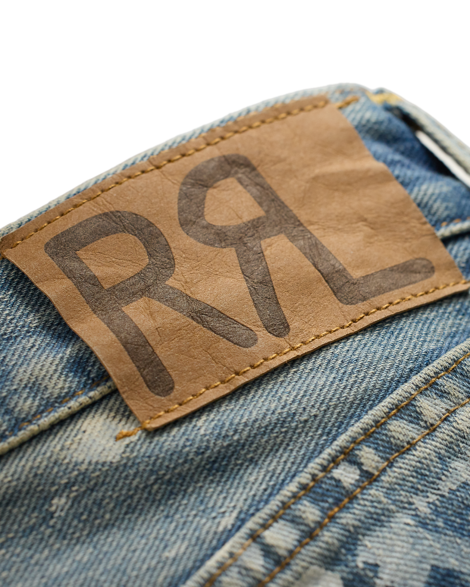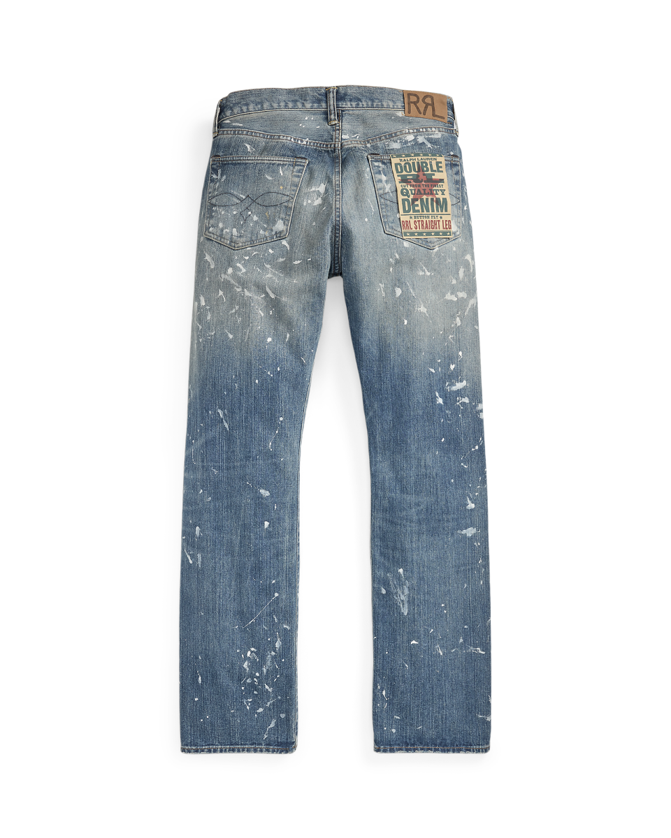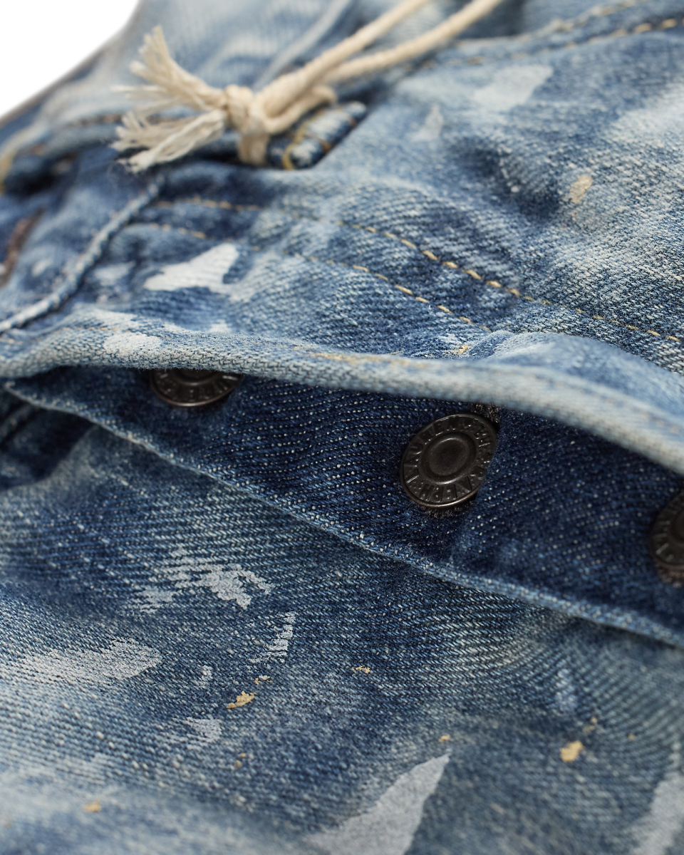 这款直筒版型牛仔裤选用斜纹布制成,采用靛蓝色织工艺,采用纽扣门襟结构,灵感源自上个世纪 60 年代末的牛仔风格,满版饰有泼墨图案,采用 Sanforized ® 预缩处理,尽可能减轻缩水情况