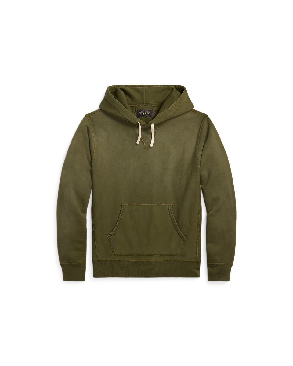 这款连帽衫选用中等厚度的棉质面料制成,抽绳风帽,罗纹侧边镶片,经成衣染色和重度水洗处理,颜色富有层次感