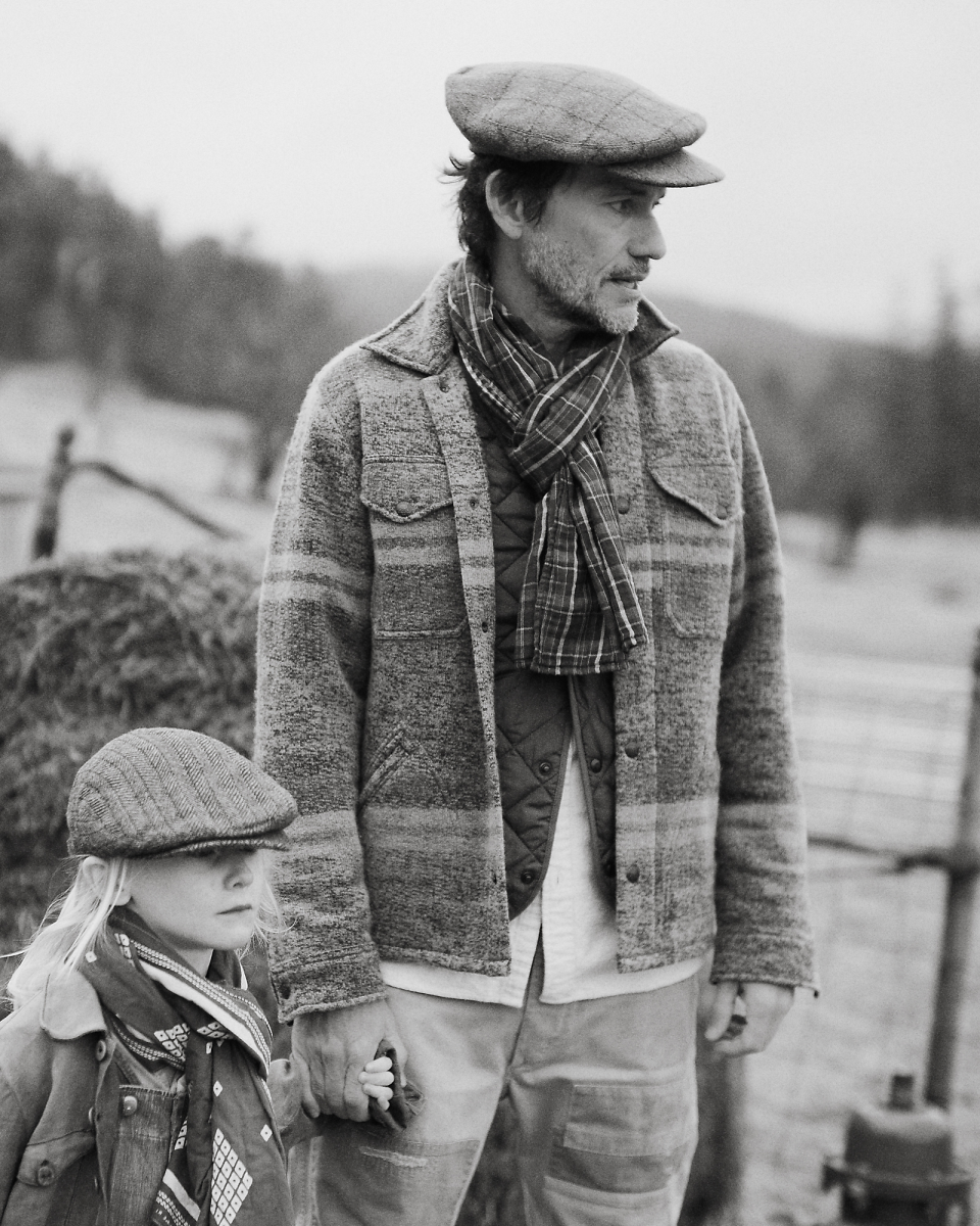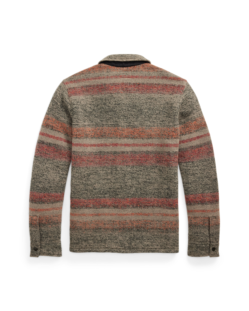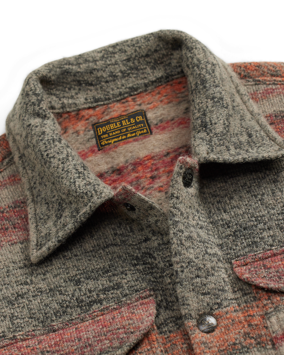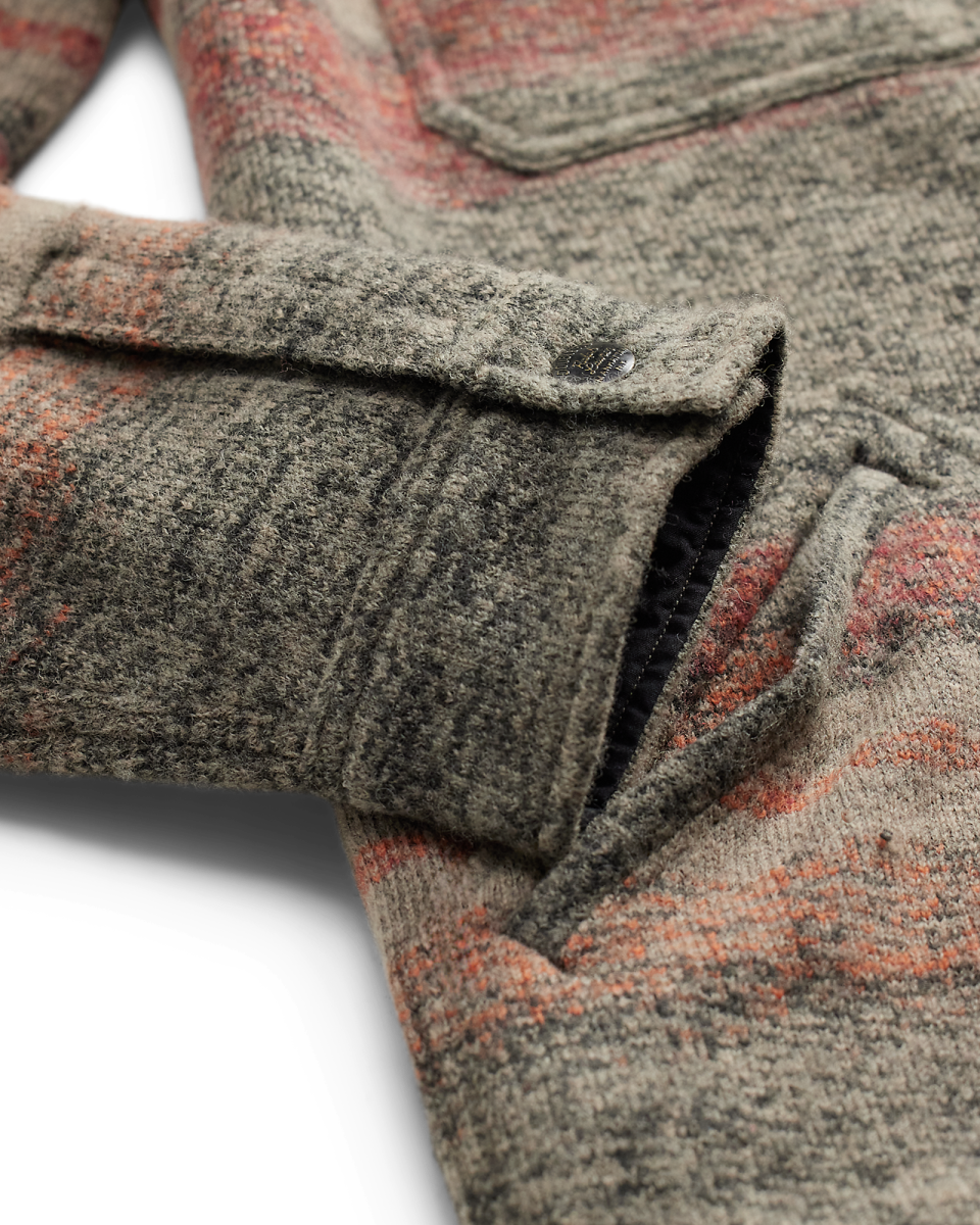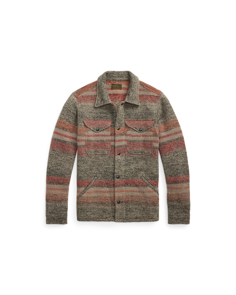 这款经典工装夹克选用双面针织鸟眼纹提花布制成,饰有灵感源自复古马术风格毛毯的条纹图案和色调,内侧以梭织面料加固