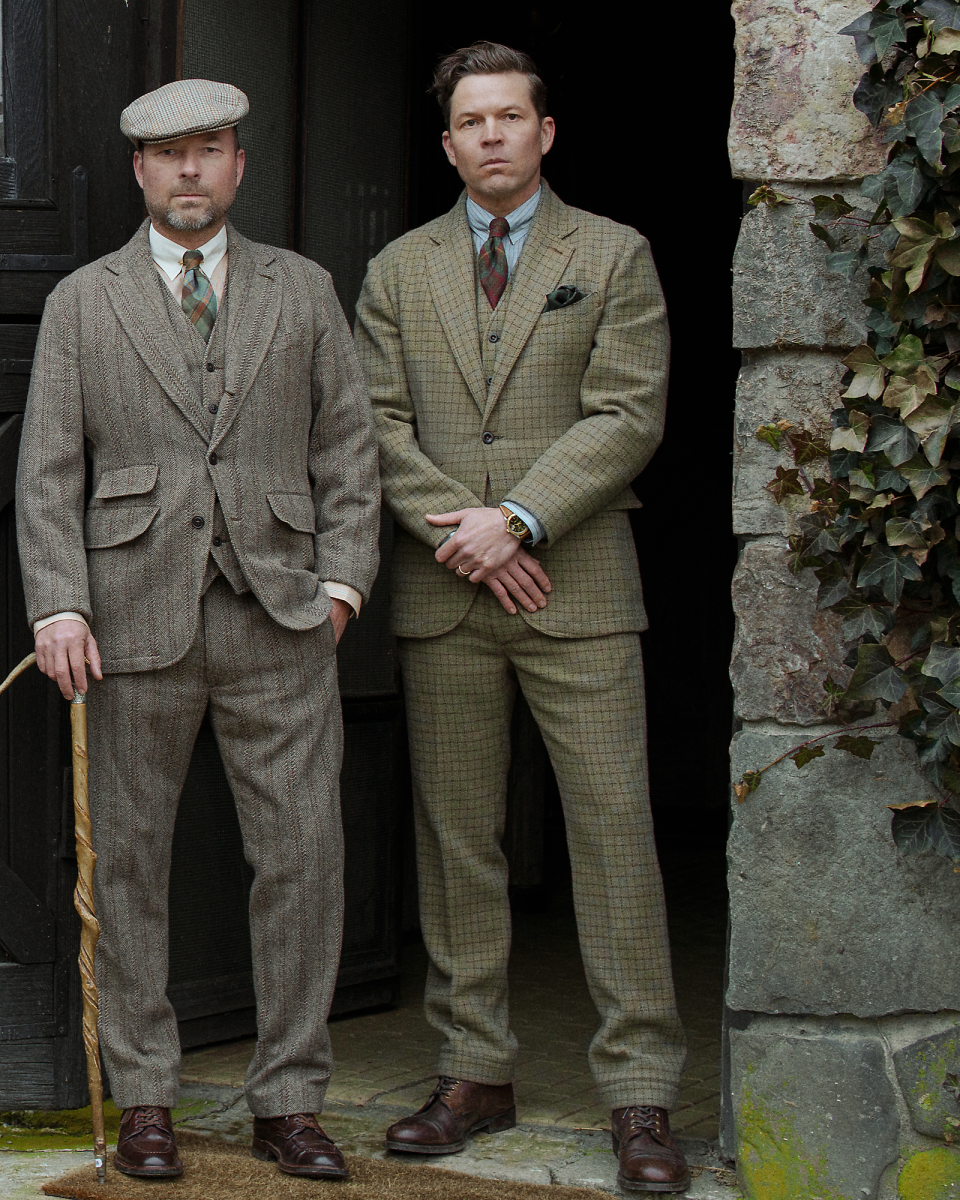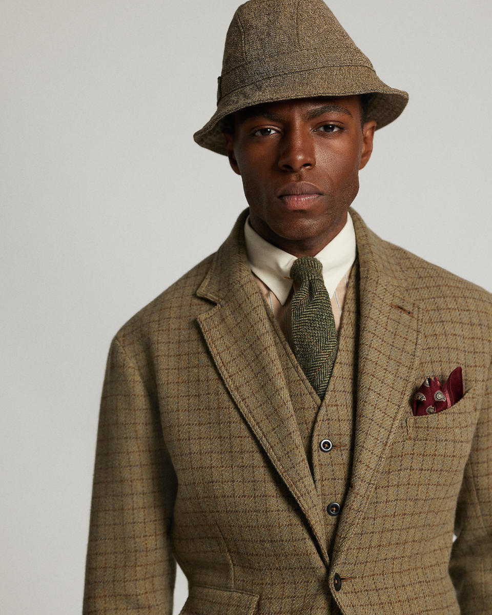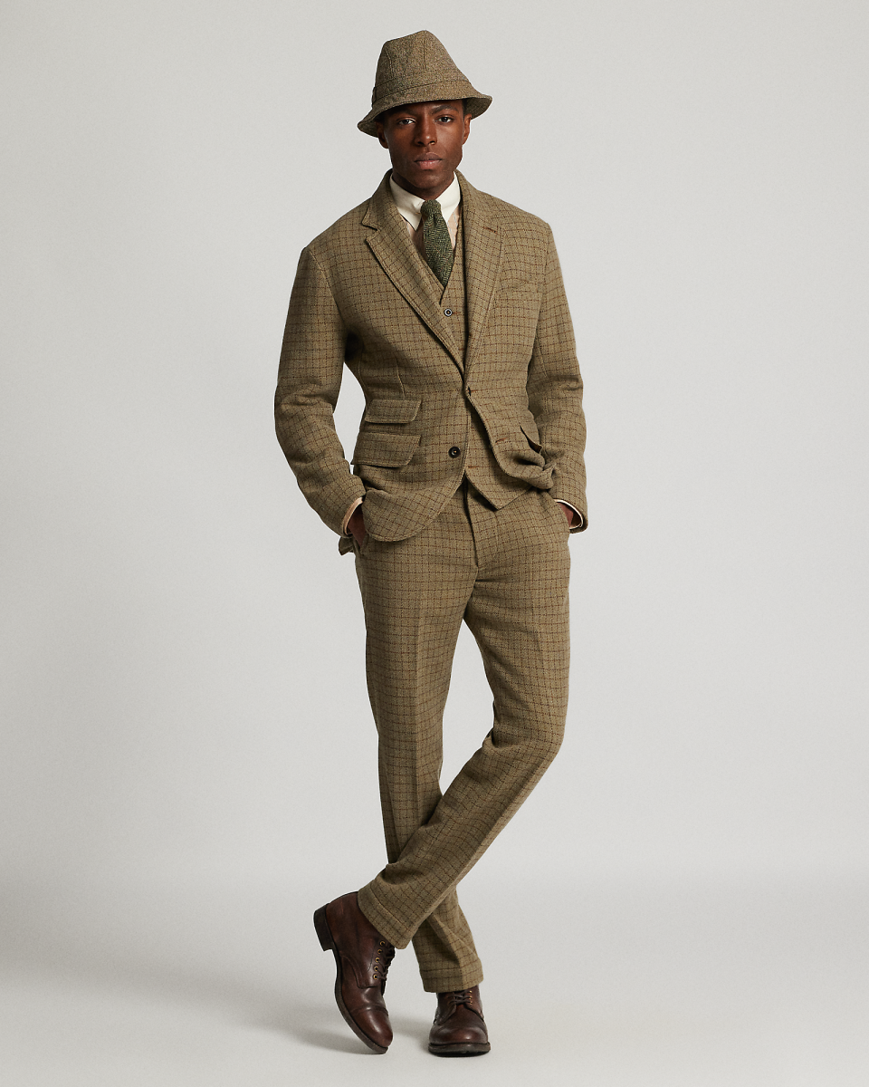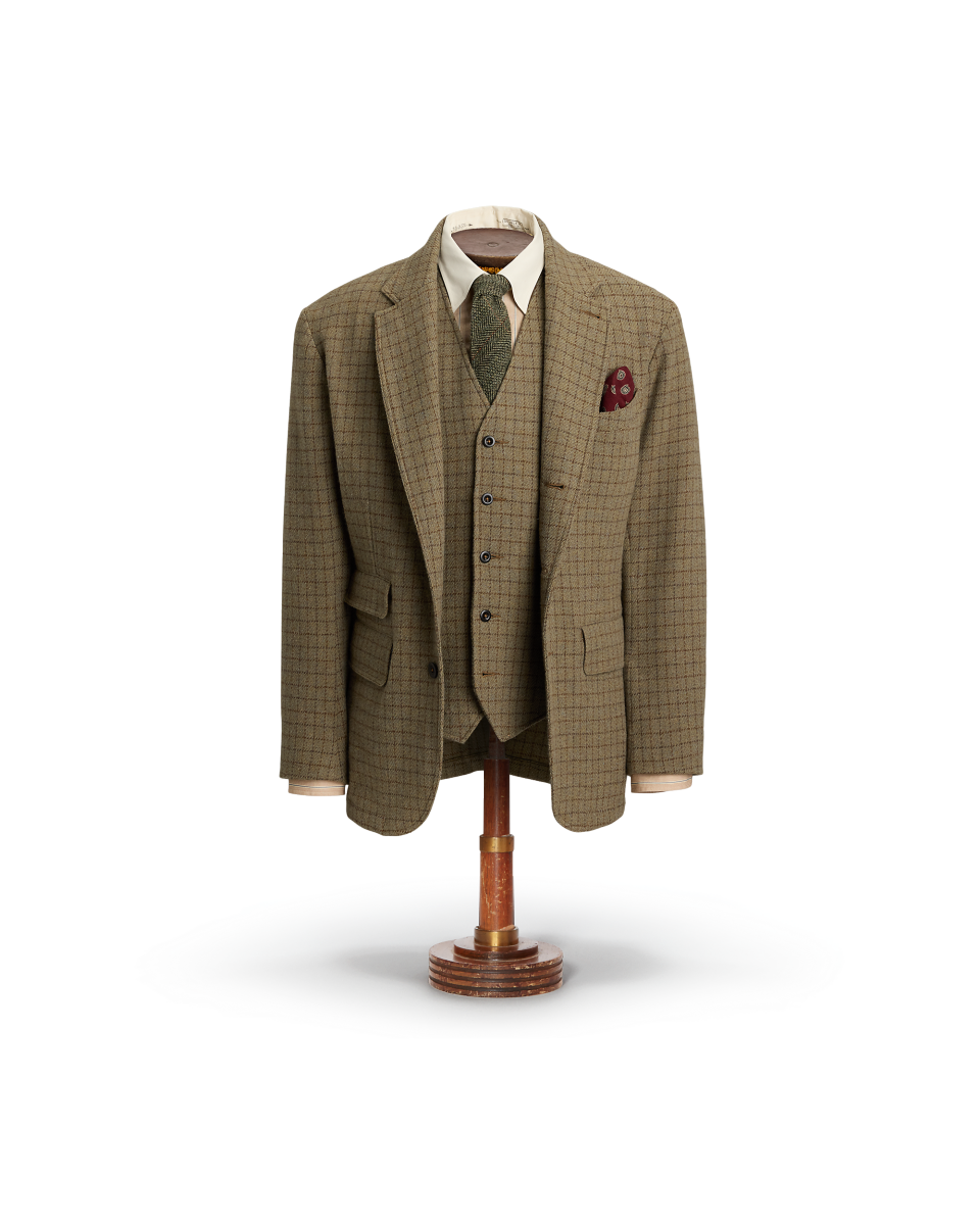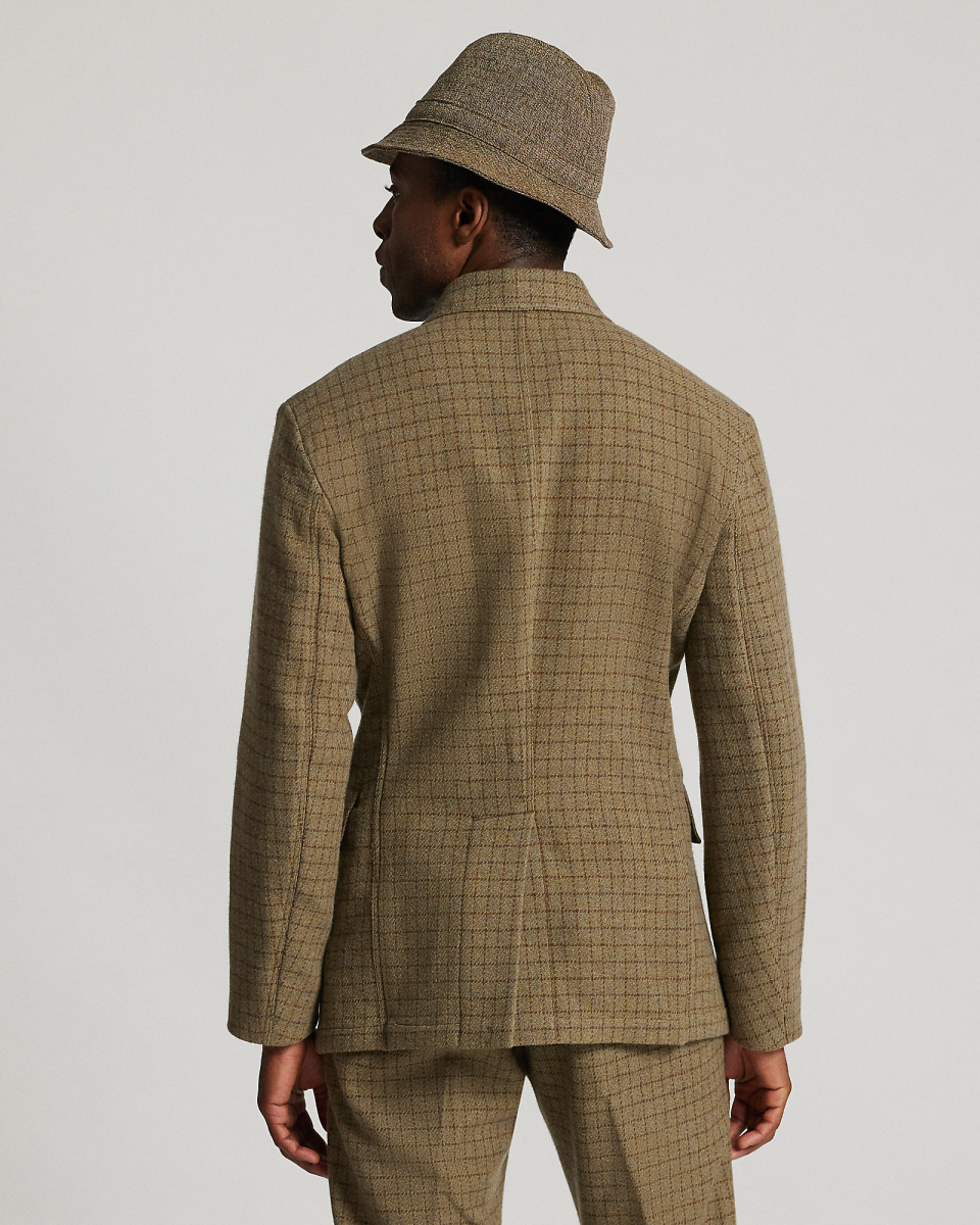 这款三角凹口领西装外套选用由一家工厂研发的格纹粗花呢制成,该面料采用经纤维染色的纱线以稀疏针法织就
