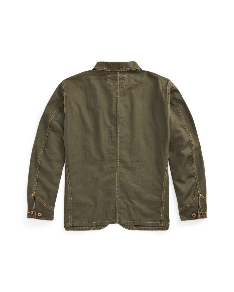 这款工作服风格夹克选用舒适的人字斜纹面料制成。口袋采用套结加固。正面下摆采用圆角设计。复古金属纽扣