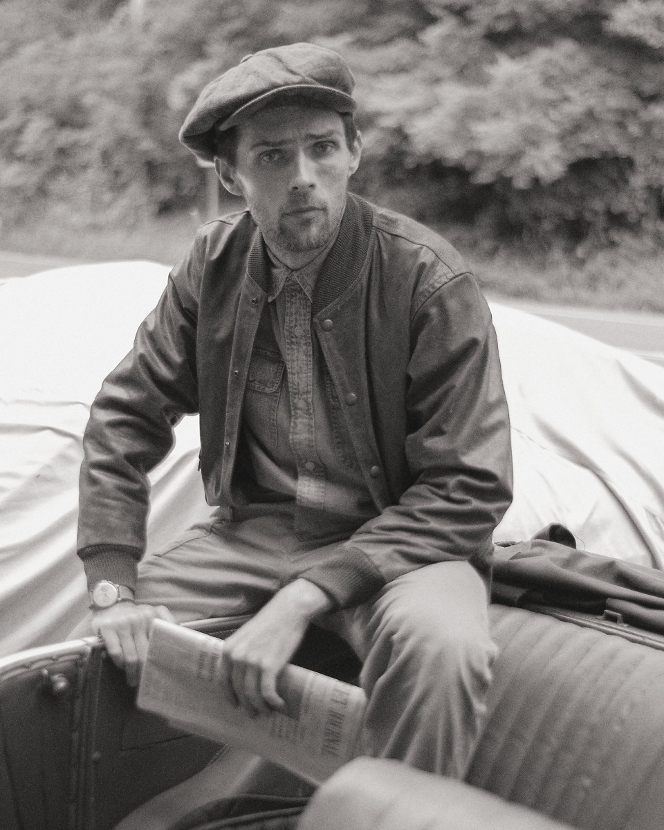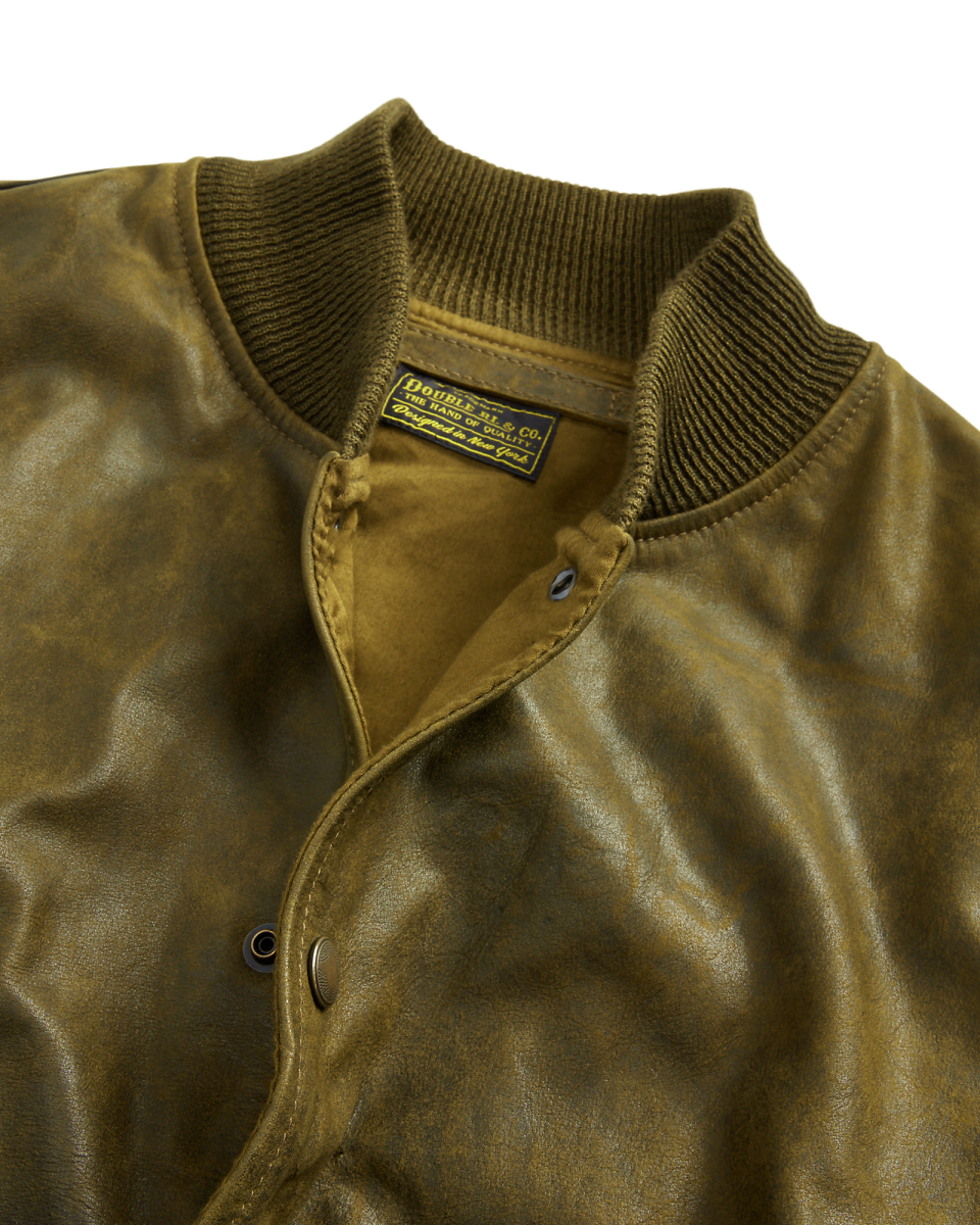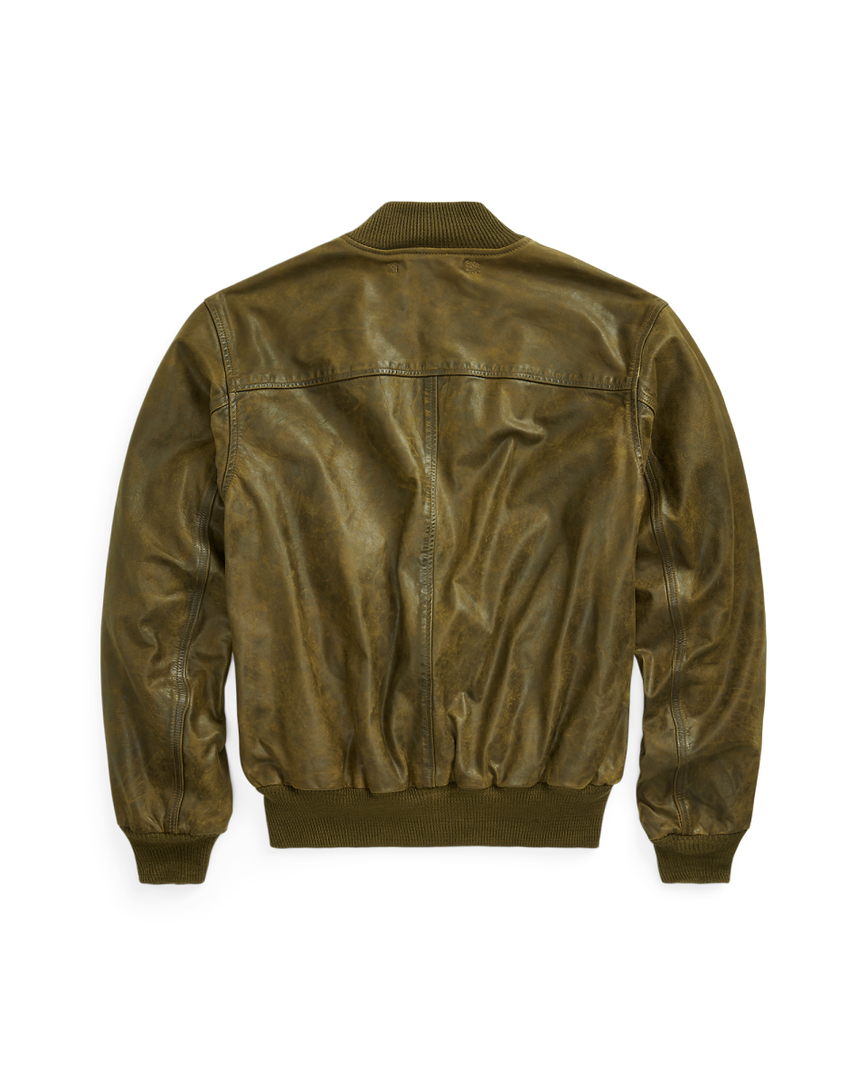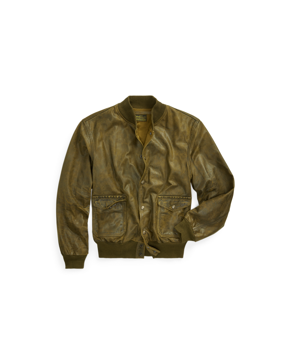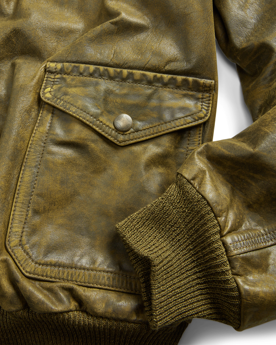 这款飞行员夹克灵感源自上个世纪 30 年代的一件飞行夹克,选用棕色全粒面牛皮革制成,底色为卡其色,呈现复古外观,混色罗纹衣领、袖口和下摆,正面按扣