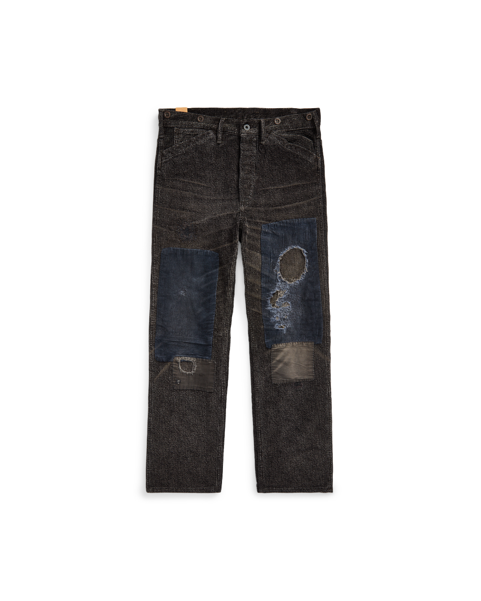 这款宽松版型长裤选用 8 条棉质灯芯绒制成。采用拔染印花工艺,打造混色图案,搭配复古风格细节和手工制作裤腰。所有受力点均以倒回针线迹加固。饰有手工缝制的撞色灯芯绒补丁