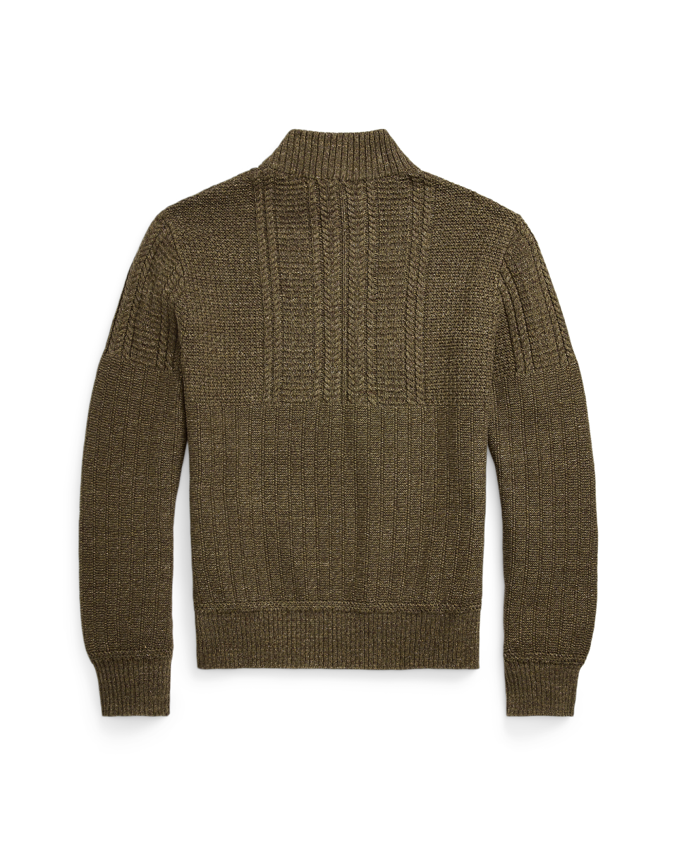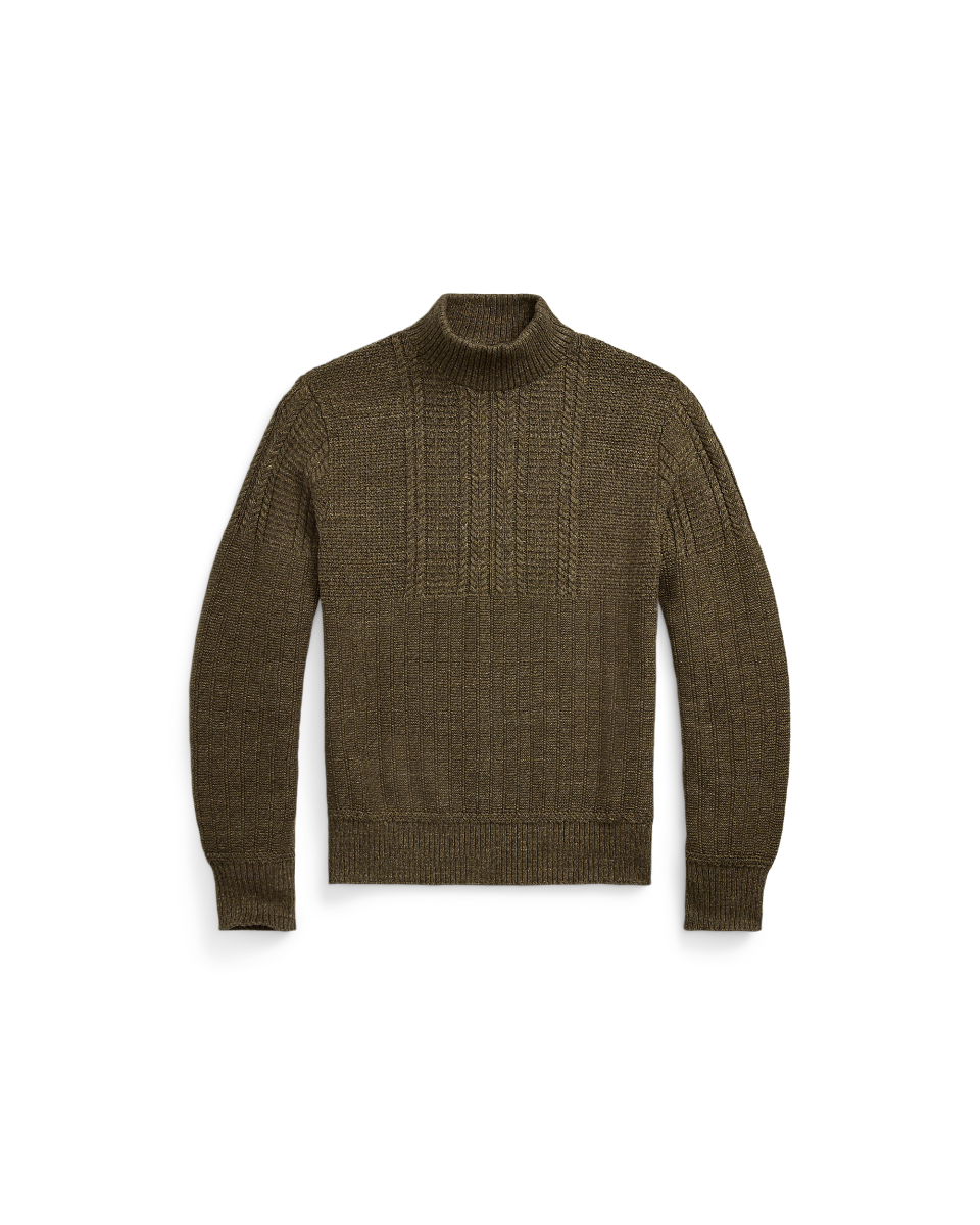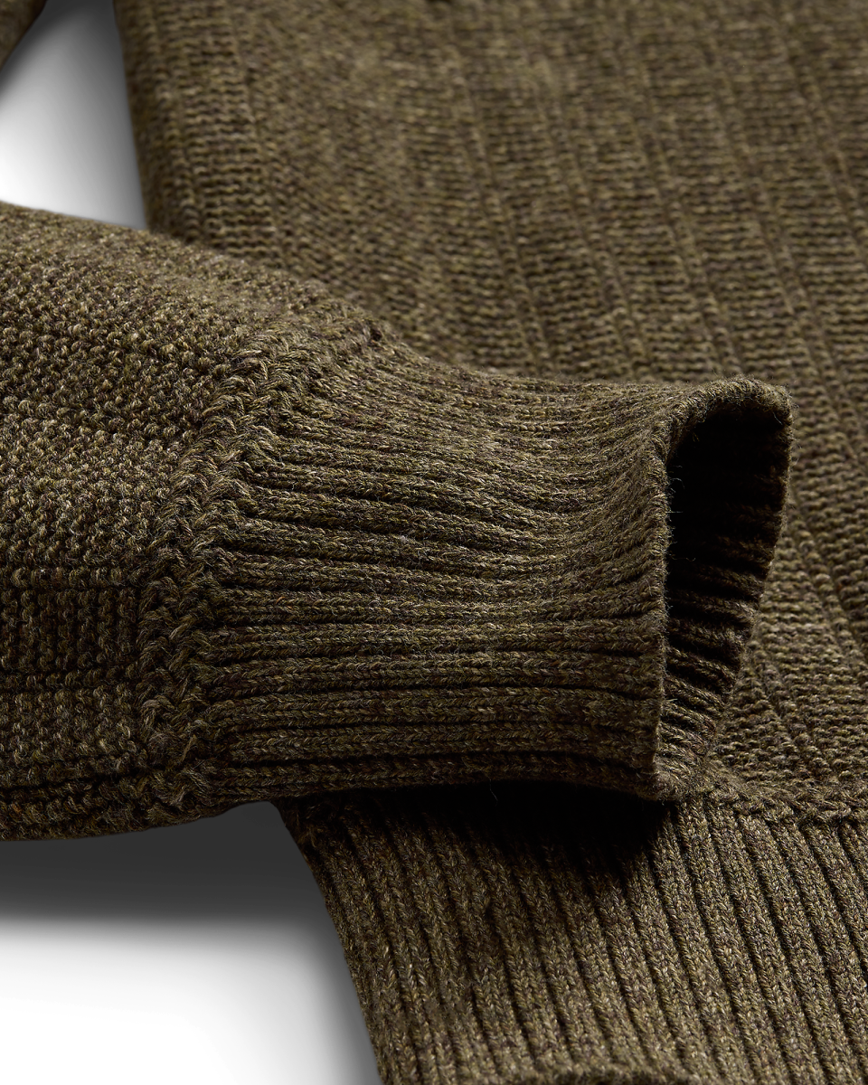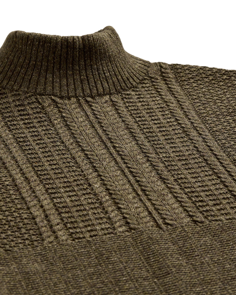 这款轻盈的针织衫选用多种棉质纱线织就,灵感源自上个世纪 40 年代的户外毛衫,采用一系列富有纹理的线迹和绞花缝线,罗纹半高领、袖口和下摆