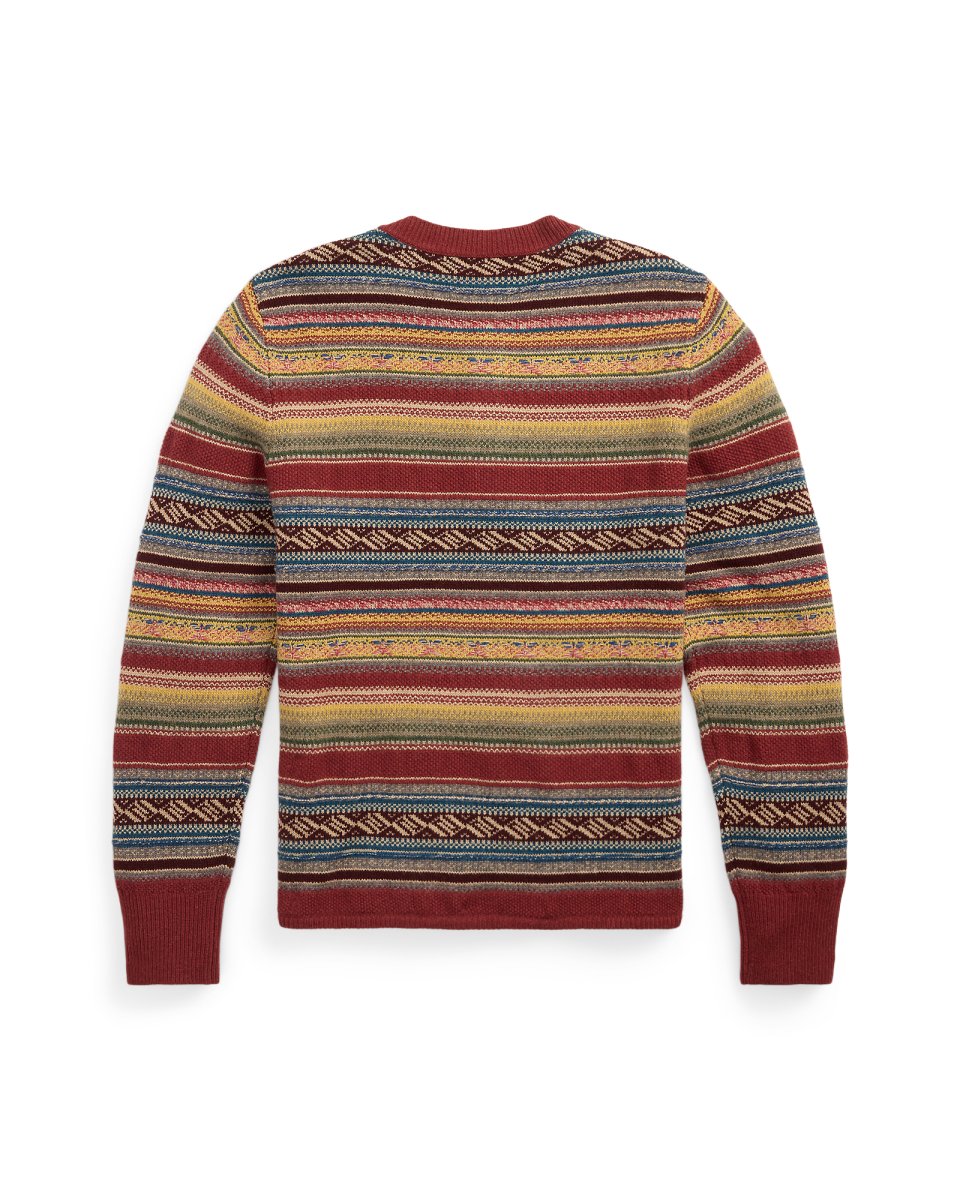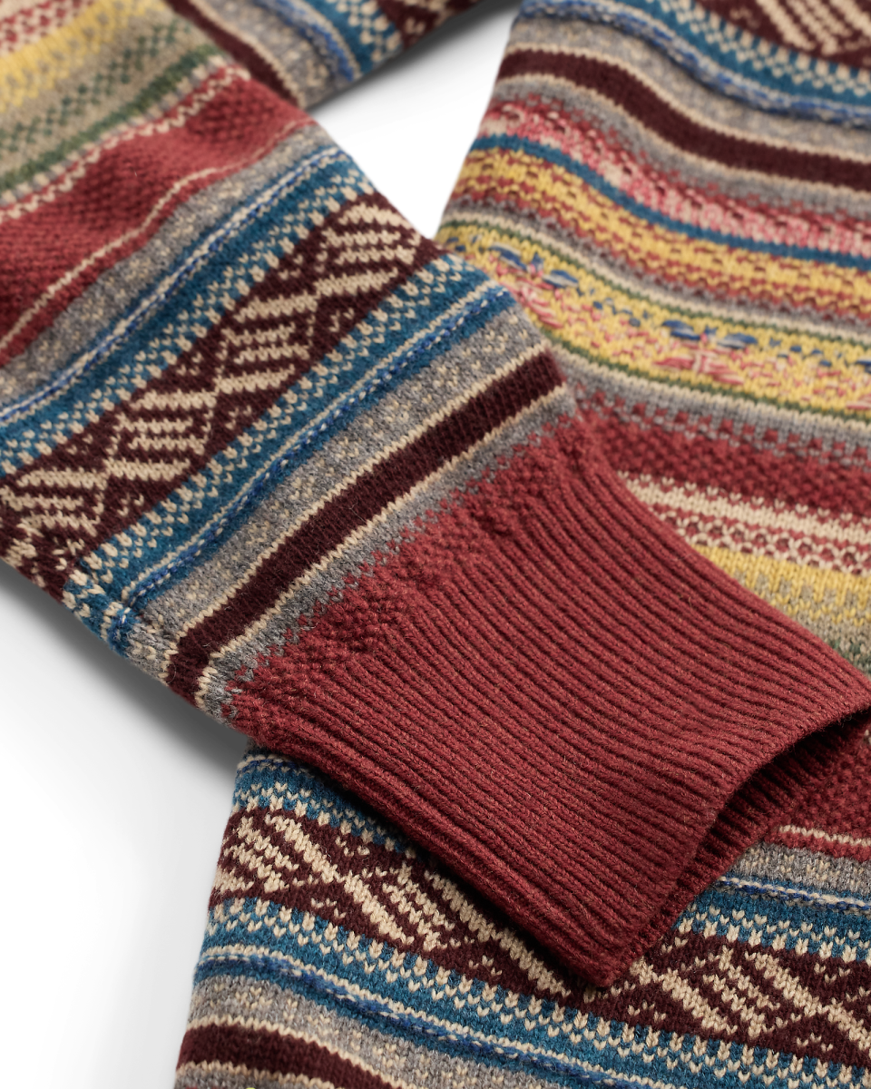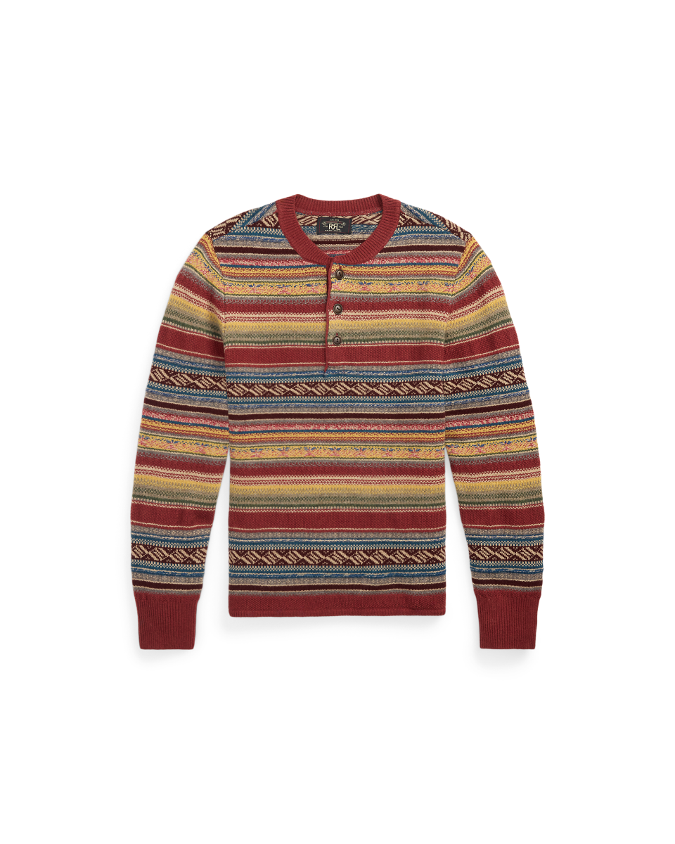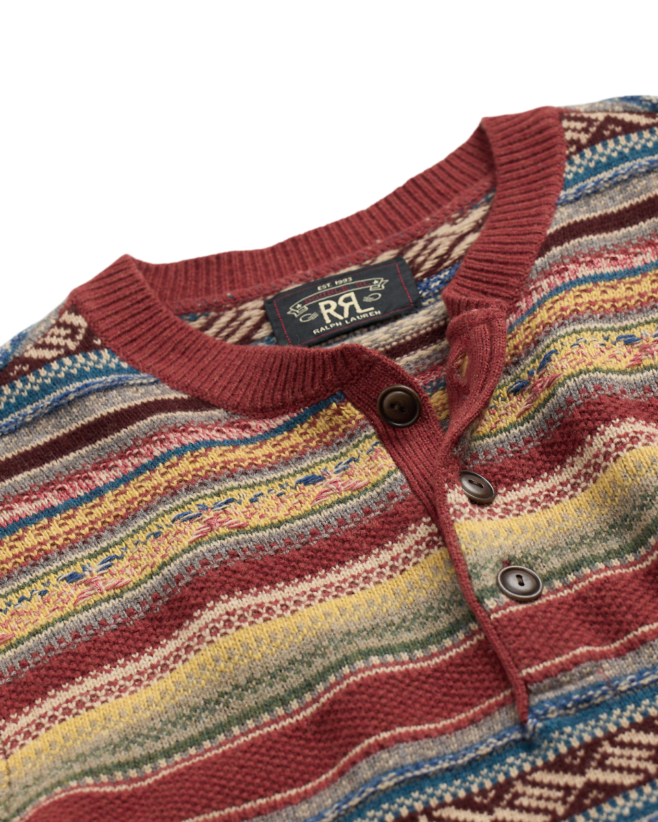 这款亨利领针织衫选用舒适的纱线织就,满版以提花针织工艺制成,饰有混搭缝线,灵感源自上个世纪 60 年代的图案,罗纹衣领和袖口,经特定水洗处理,打造复古效果